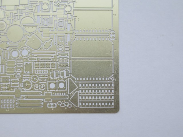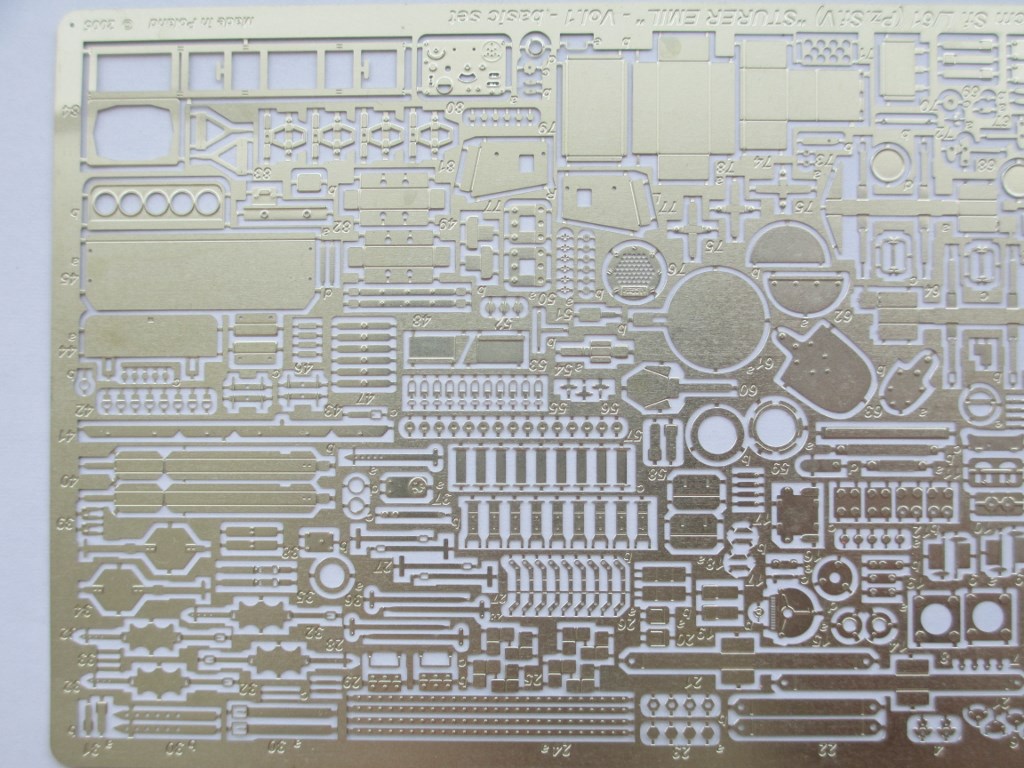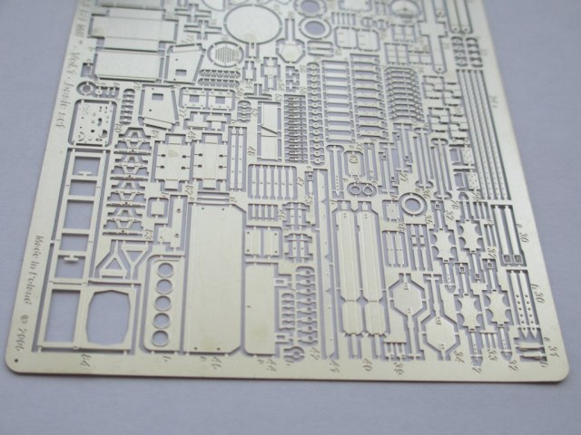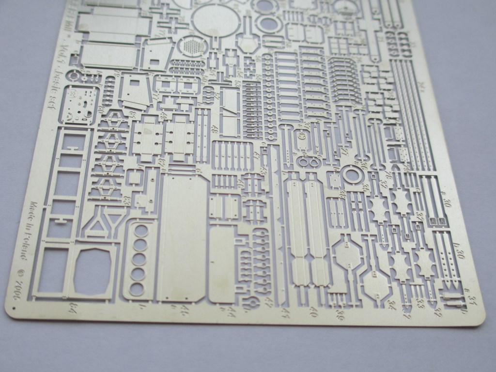 Плата фототравления выполнена по традиции из желтого металла.Количество деталей 84.Детали представлены в основном крепежами. Производитель предлагает практически весь крепеж внешней обвески и притом крайне детальный.Тут мы видим очень детальный крепеж шанцевого инструмента ,шомпола, фар и ящика ЗИП.Крайне детально выполнены болты и гайки (деталь 23 а и 23b) на креплении глушителя. При помощи деталей 50, 50 а возможно создание рабочих навесов . Интерьер кабины-ну тут так же А В Е R шикарен-крепеж кабур, противогазных коробок ,фляг,гранат, МП и т.д.