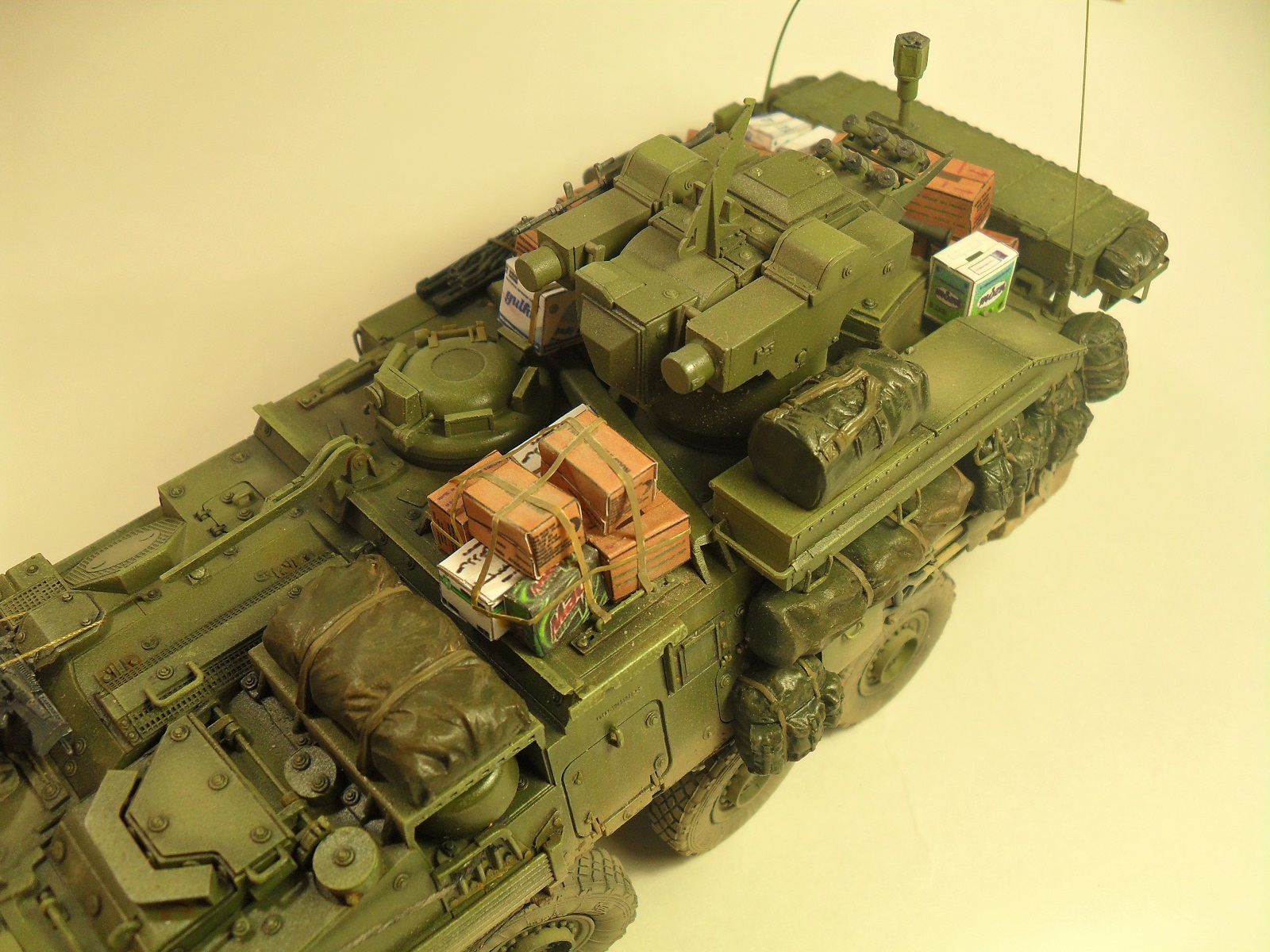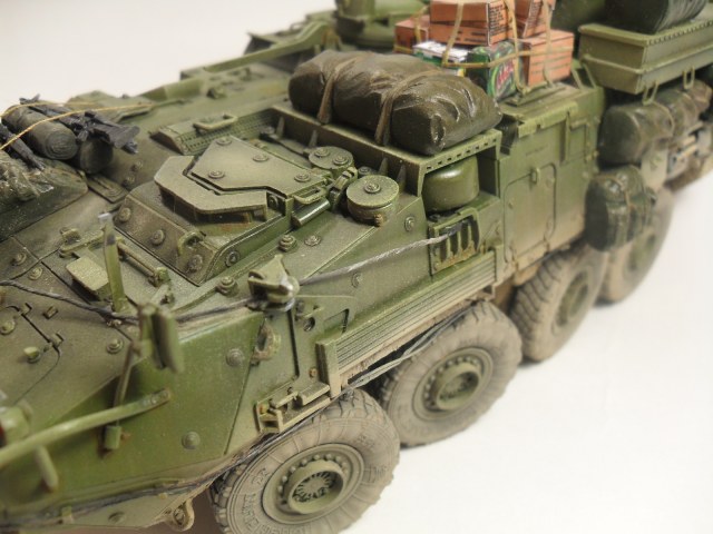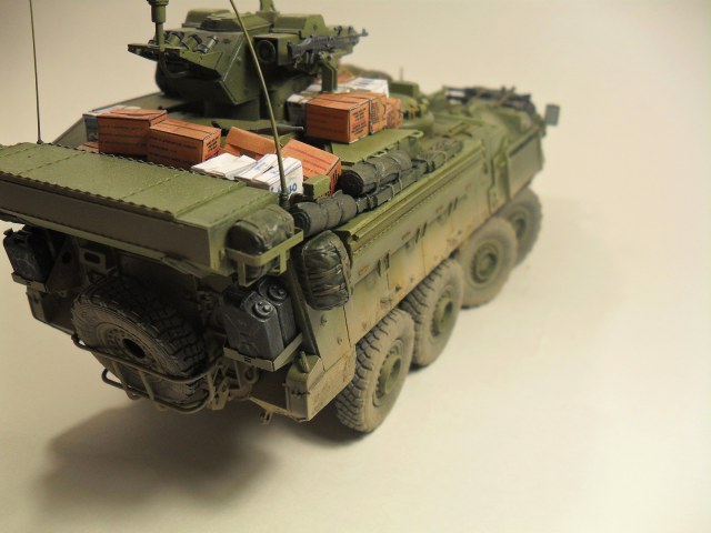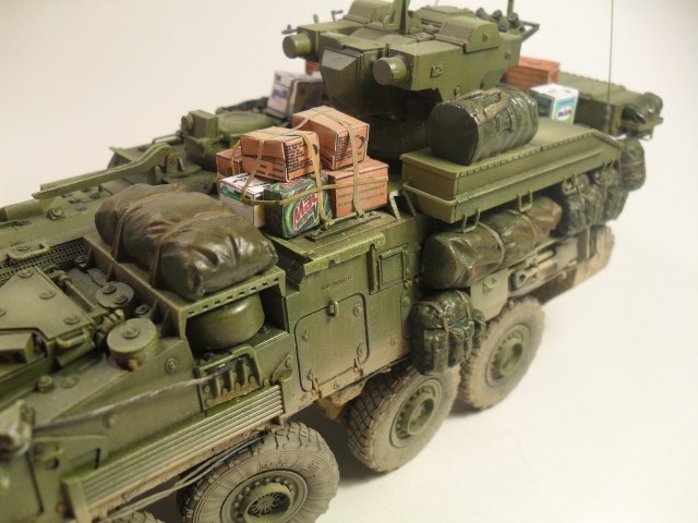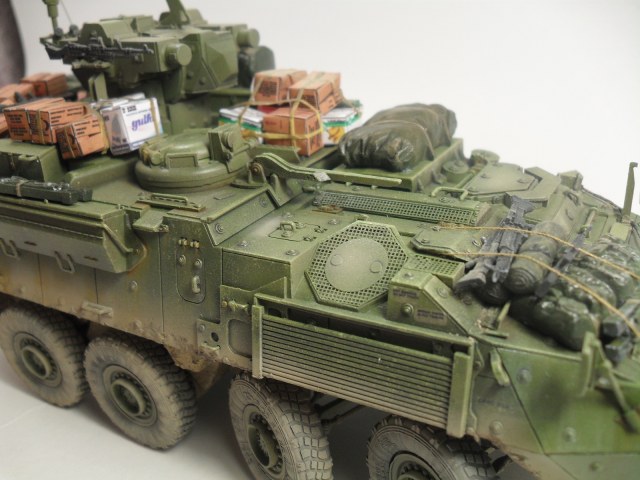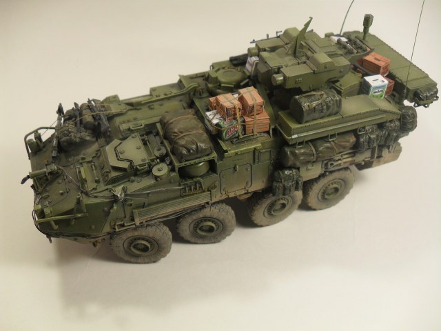 Всем доброго времени суток! Хочу представить Вам свою очередную модель от Trumpeter'a 1/35 LAV III TUA. Готовилась эта модель на конкурс «СССР/РФ vs USA/NATO» на сайте http://nacekomie.ru/. На момент выставления моей работы сюда финального голосования еще не было, поэтому не могу сказать возьмет она что нибудь или нет. Итак, коротко о самой модели. Как таковой привязки к какому либо месту на земле не было, модель полностью из коробки, дополнял лишь мешками и коробками от фирмы Tamiya, тросы переделывал из проволоки, антенны из тянутого литника. Красил красками Mr.Hobby, Tamiya. Эффекты, пигменты - Ammo Mig, Ak Interactiv. По поводу трумповской физики в плане некоторых страйкеров слышал и видел и, как оказалось, мою модель стороной не обошло, физика хромает - знаю. В следующий раз буду внимательней выбирать модель. Жду Ваших комментариев, Спасибо за внимание!!!