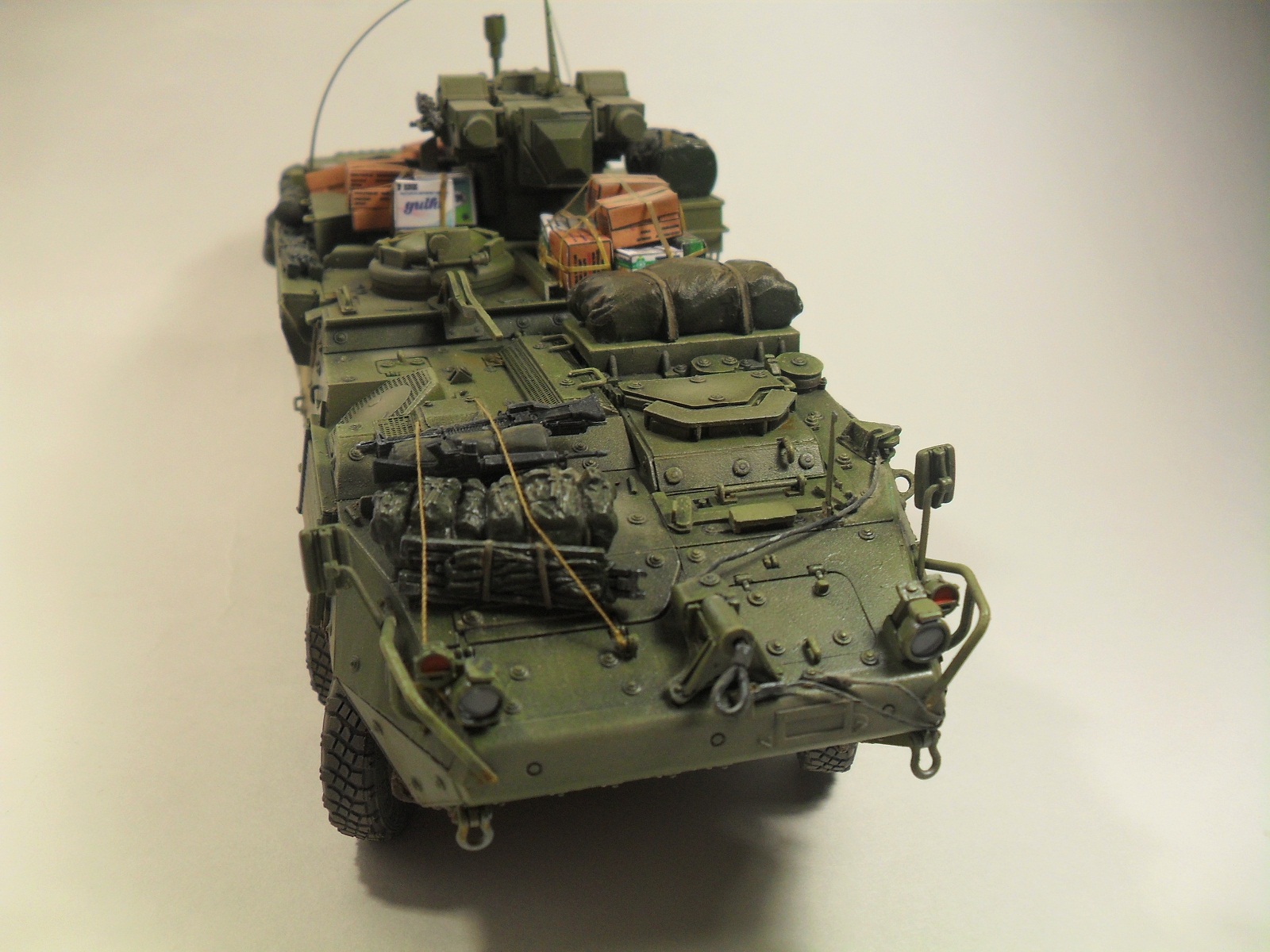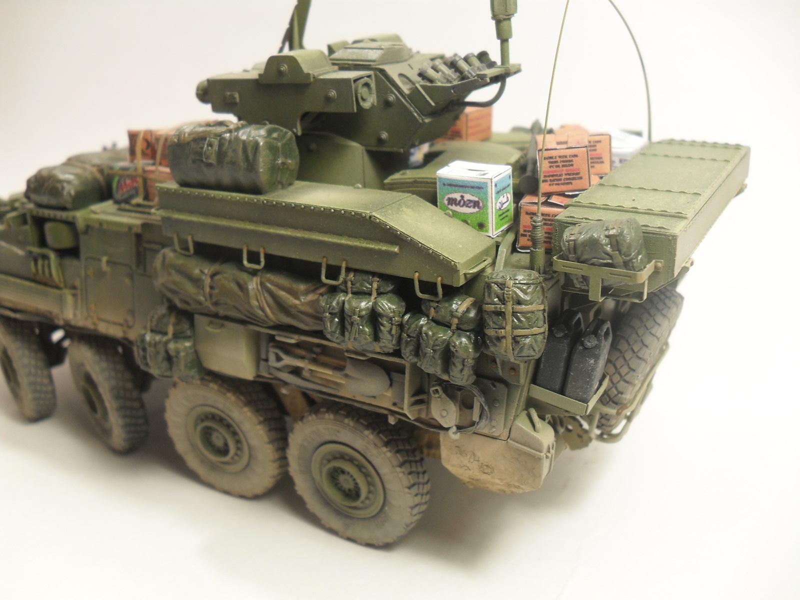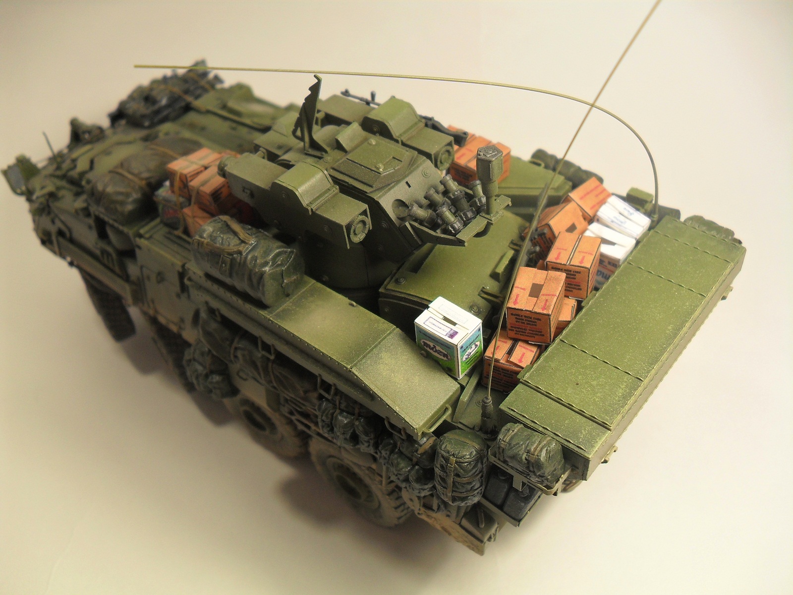 Всем доброго времени суток! Хочу представить Вам свою очередную модель от Trumpeter'a 1/35 LAV III TUA. Готовилась эта модель на конкурс «СССР/РФ vs USA/NATO» на сайте http://nacekomie.ru/. На момент выставления моей работы сюда финального голосования еще не было, поэтому не могу сказать возьмет она что нибудь или нет. Итак, коротко о самой модели. Как таковой привязки к какому либо месту на земле не было, модель полностью из коробки, дополнял лишь мешками и коробками от фирмы Tamiya, тросы переделывал из проволоки, антенны из тянутого литника. Красил красками Mr.Hobby, Tamiya. Эффекты, пигменты - Ammo Mig, Ak Interactiv. По поводу трумповской физики в плане некоторых страйкеров слышал и видел и, как оказалось, мою модель стороной не обошло, физика хромает - знаю. В следующий раз буду внимательней выбирать модель. Жду Ваших комментариев, Спасибо за внимание!!!