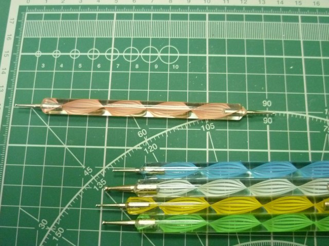 Назначение сего девайся - инструмент для лепки, используемый в технике керамической флористики. Я же взял его для других целей - иногда надо поставить точкой краску, иногда капельку клея, иногда шпатлевочку вдавить куда надо) Все это можно сделать конечно и зубочисткой, грубо говоря, но инструментом работать приятней. Учитывая цену - 60 рублей, становится еще приятней. В наборе 9 "кругляшей" различного диаметра и одна конусовидная.