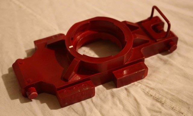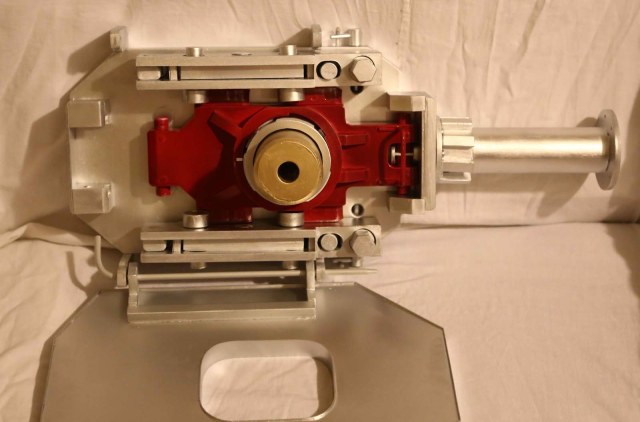 Данный затвор предназначен для установки на сталелитейный ковш вмещающий в себя расплав металла. В затвор помещаются огнеупорные вкладыши (золотого цвета), через отверстия в которых происходит подача металла. С помощью гидроцилиндра, в трубе справа, корпус задвижки (красный) приходит в движение и в среднем положении открывает канал. Большой щит защищает оператора от излишек температуры. Сам щит в реальности заполнен внутри бетоном. Вес реальной задвижки 150 кг. Вес модели в масштабе 1:2 - 4 кг