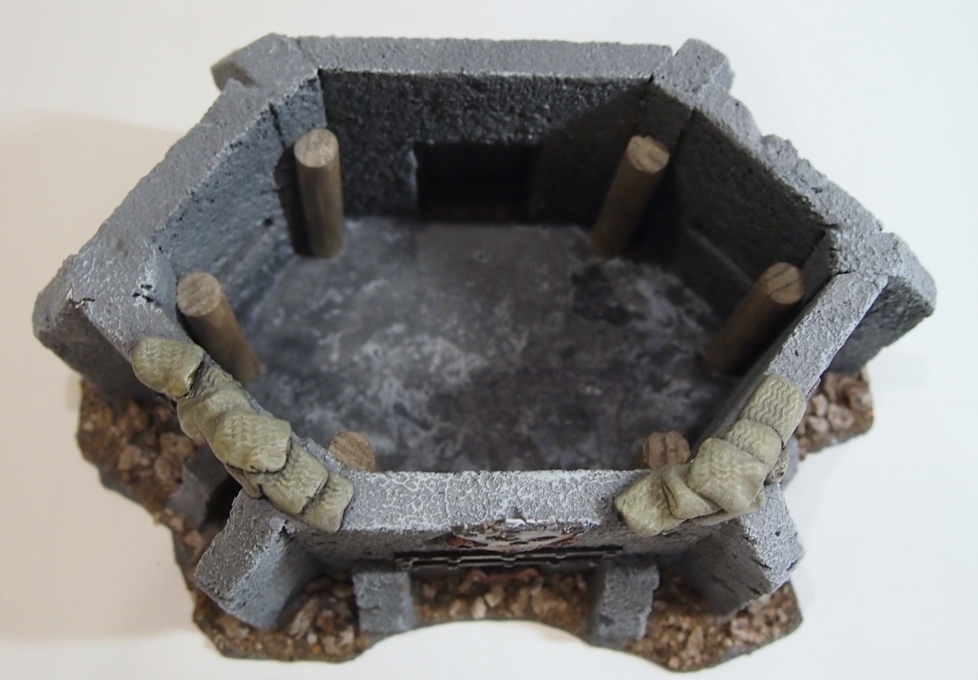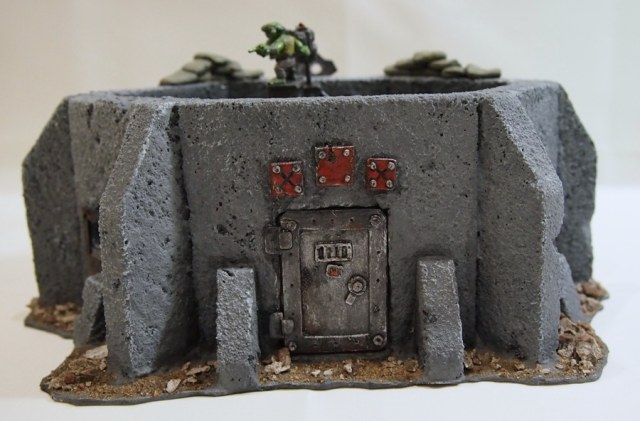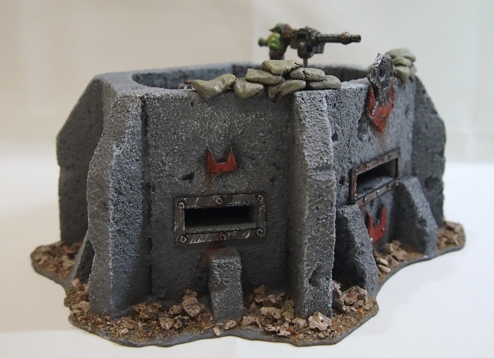 Изготовлен бункер из флористического пенопласта OASIS. Пропитан жидким стеклом. Также использовалась акриловая шпаклевка, ну и щебень. Всякие орочьи рюшки вылеплены из полимерной глины.