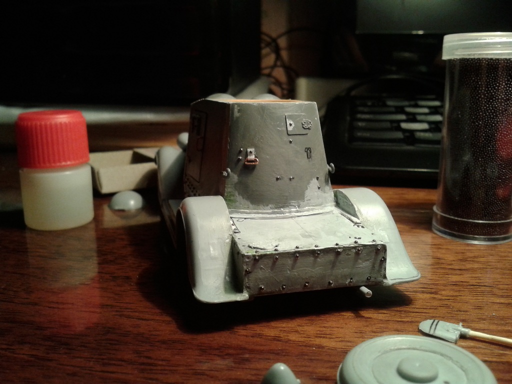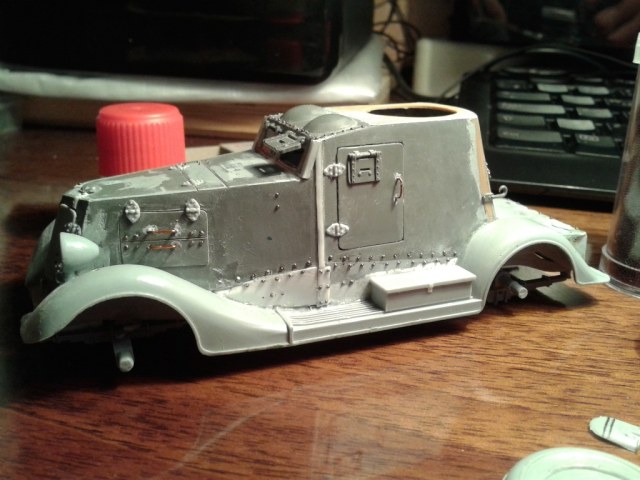 Модель от фирмы макет, строилась с ориентиром на стройку коллеги Алексея Клименко. Срезано лишнее, добавлено недостающее, проклепан (клепки микро-бисер), добавлены некоторые элементы из доширак пластика, сделана имитация протектора на колесах, переделан чехол под запаску, вобщем много чего.