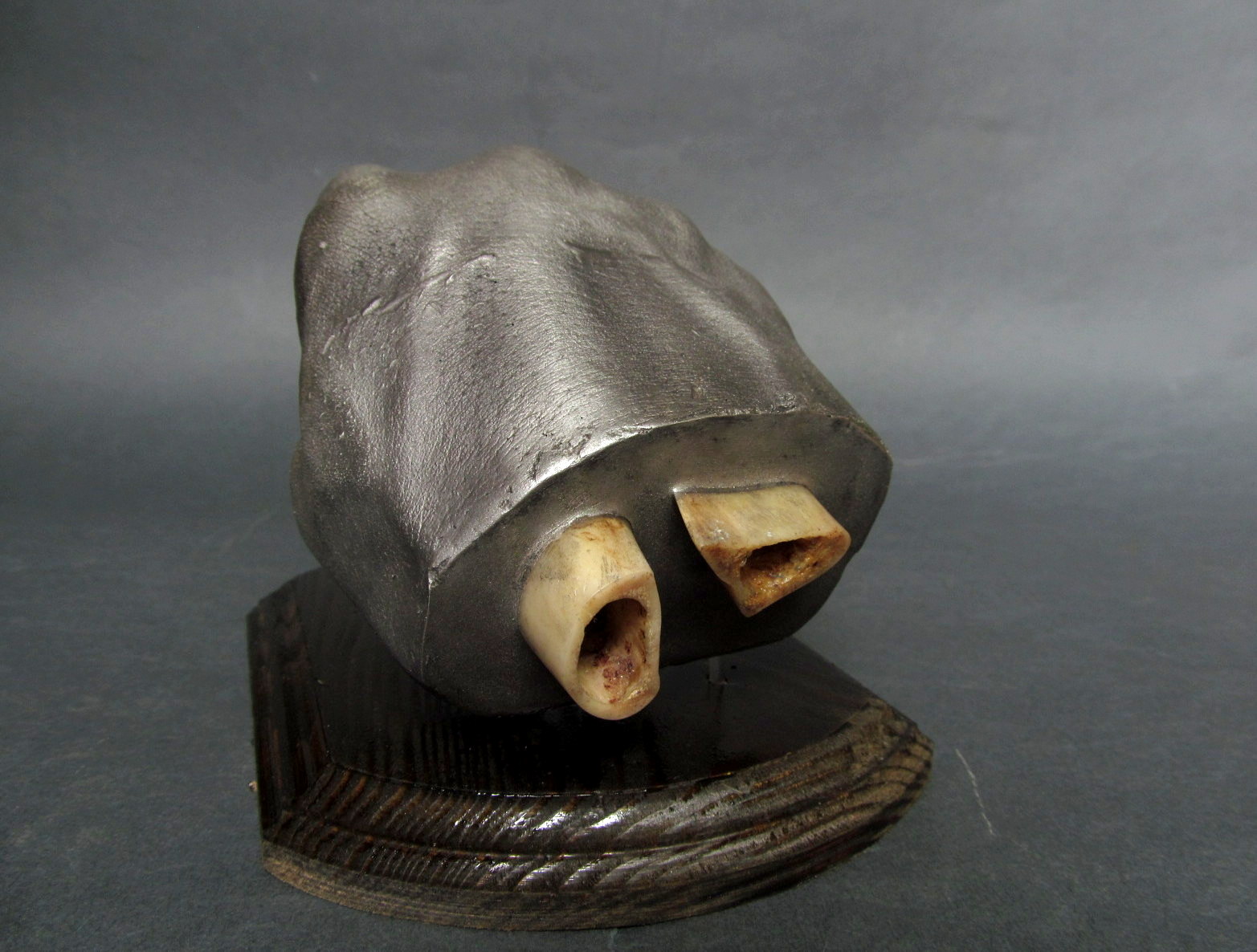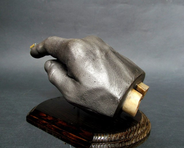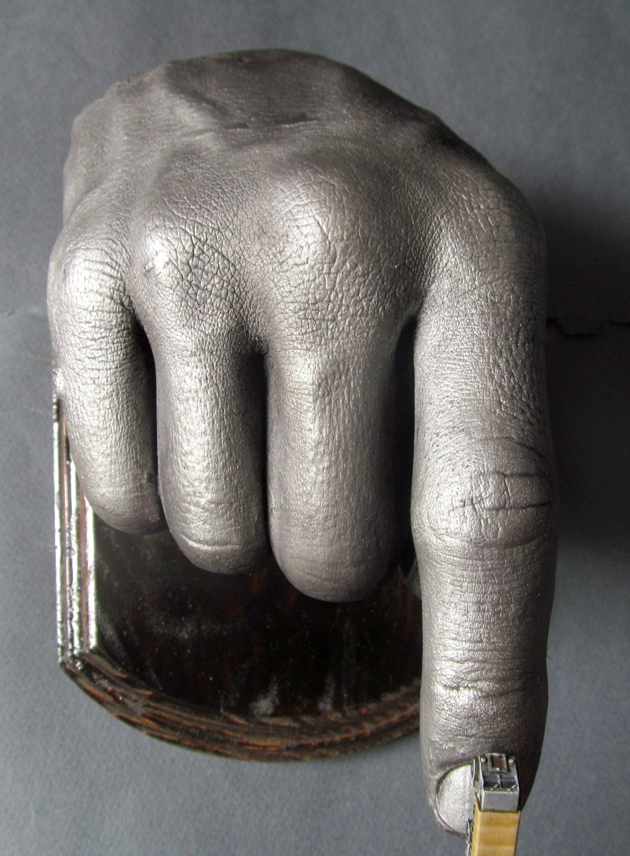 Про кости все правильно сказали. Скажу про излишную детализацию руки - в скульптуре это не практикуется - это неэстетично. Надо было затереть шкуркой все эти отпечатки, поры, бородавки и всякие дефекты, тем более что окрашено в стальной цвет. Другое дело если бы имитация живой руки, на манер восковых фигур, но и в этом случае кости были бы излишними. Для снятия слепка - есть специальное средство - альгинат