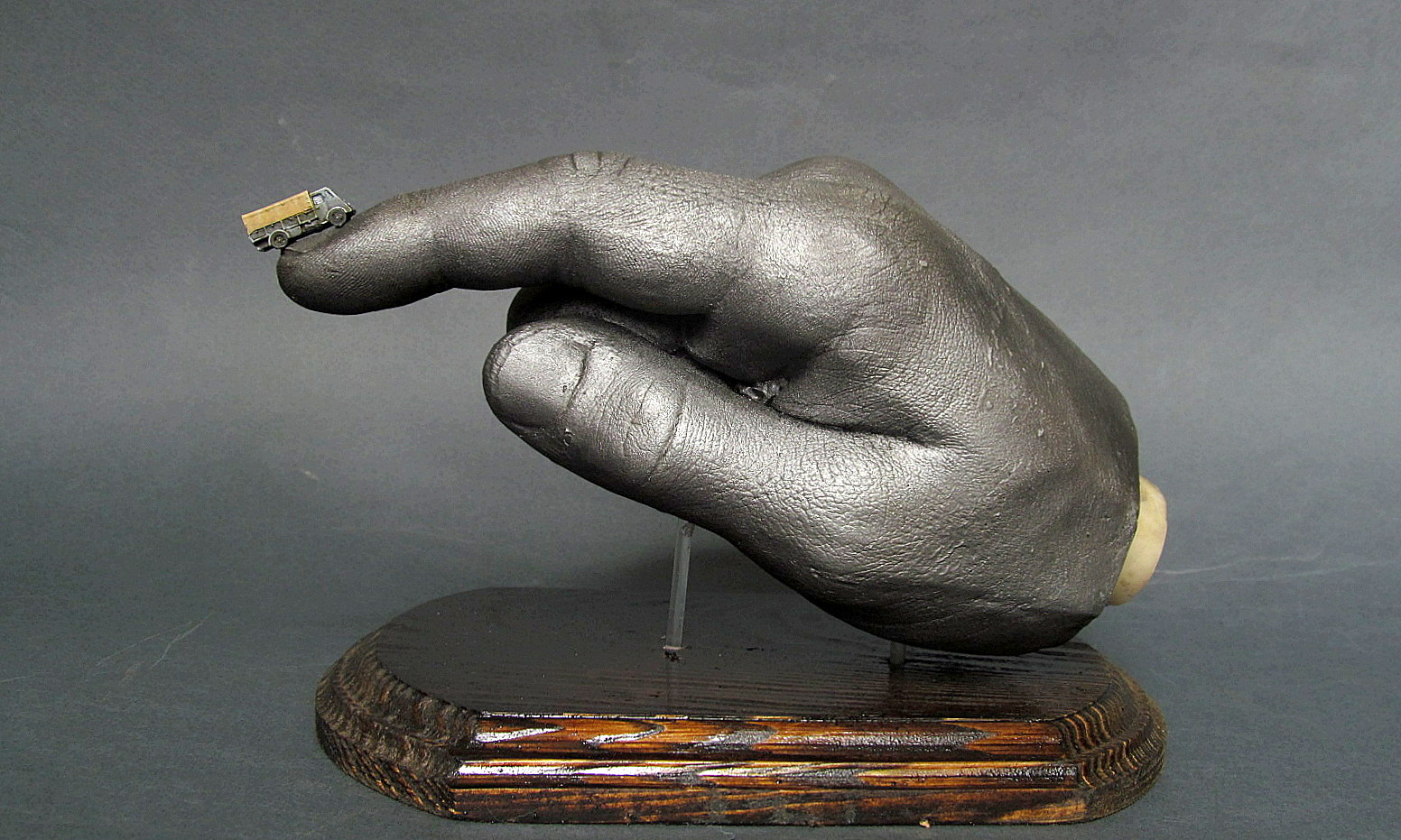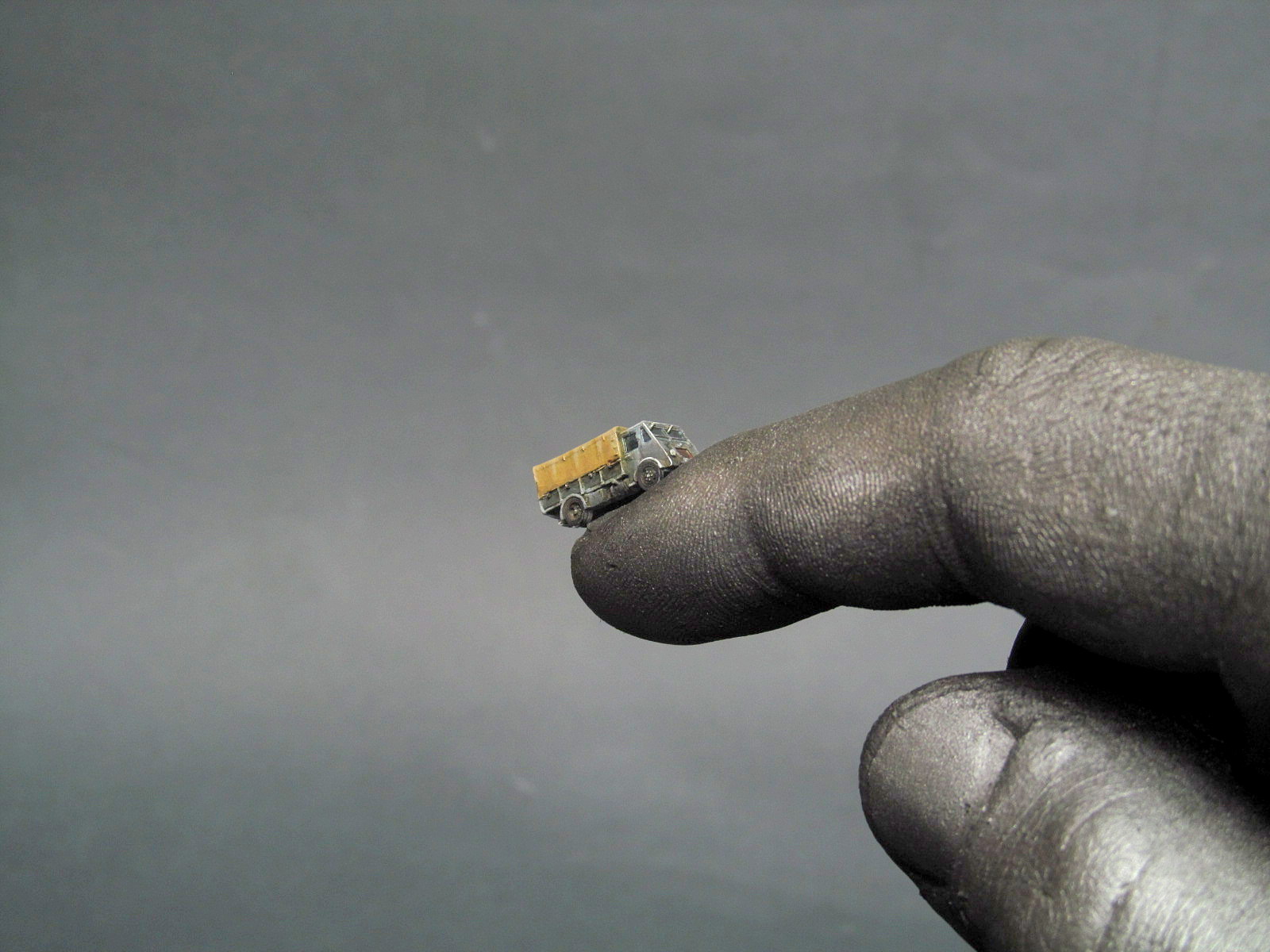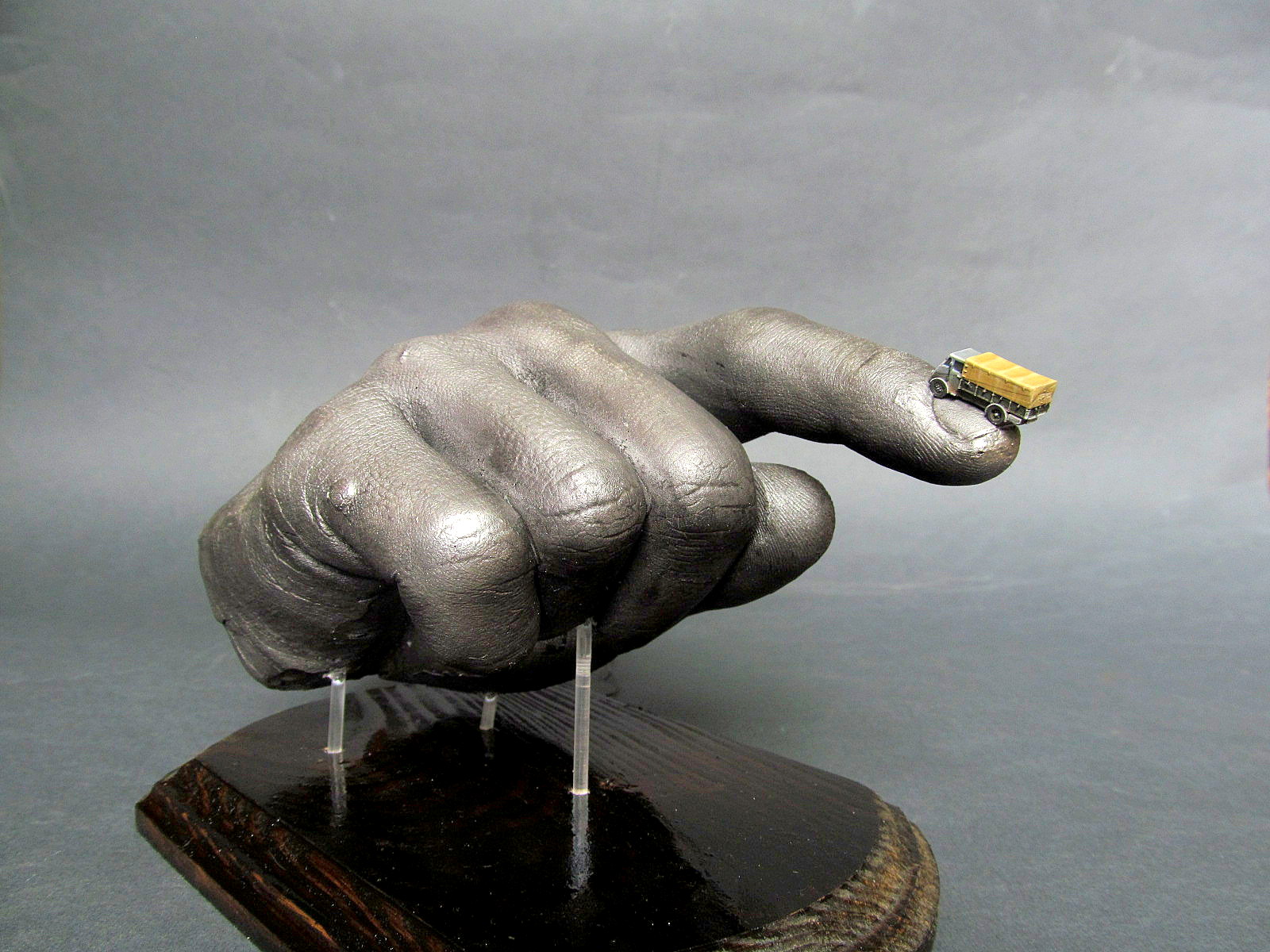 Доброго времени суток, хочу представить свою очередную работу, идею вынашивал очень долго, технологию по которой была изготовлена рука придумал сам, идея сего проекта заключается в в том что мы-моделисты на ограниченном пространстве можем поместить огромное количество вещей, так как в данном случае на ногтю разместился грузовик, ну а рука окрашена в сталь, потому в нашем деле надо твердая рука, а что может быть тверже стали?