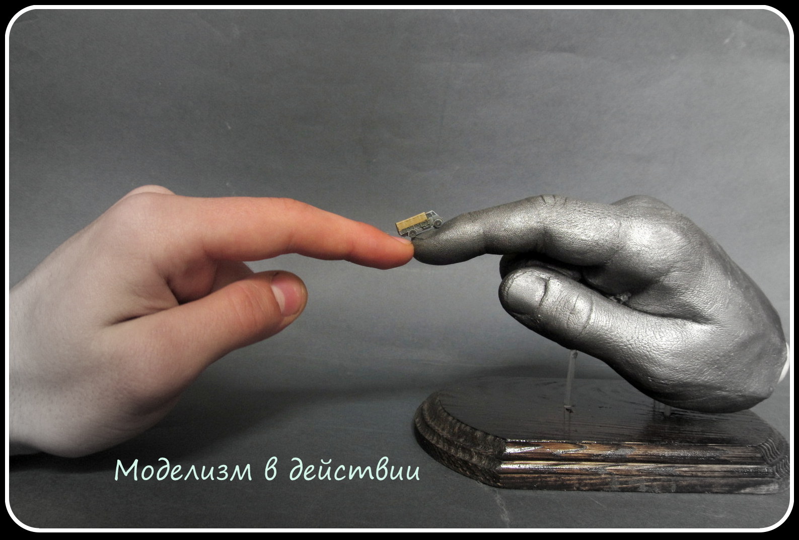 1."что мы-моделисты на ограниченном пространстве можем поместить огромное количество вещей, так как в данном случае на ногтю разместился грузовик, ну а рука окрашена в сталь, потому в нашем деле надо твердая рука, а что может быть тверже стали?" А еще мы моделисты стараемся сделать копийную модель, а для этого нужно знать матчасть, а такие кости в месте среза руки не могут быть, следовательно страдает матчасть.