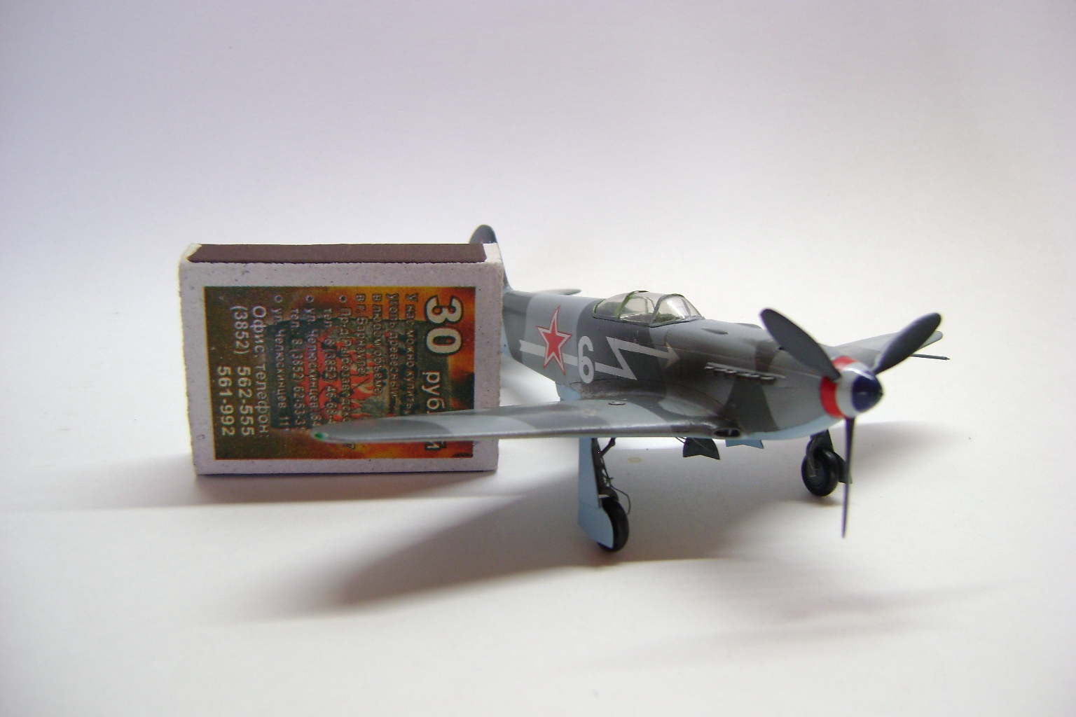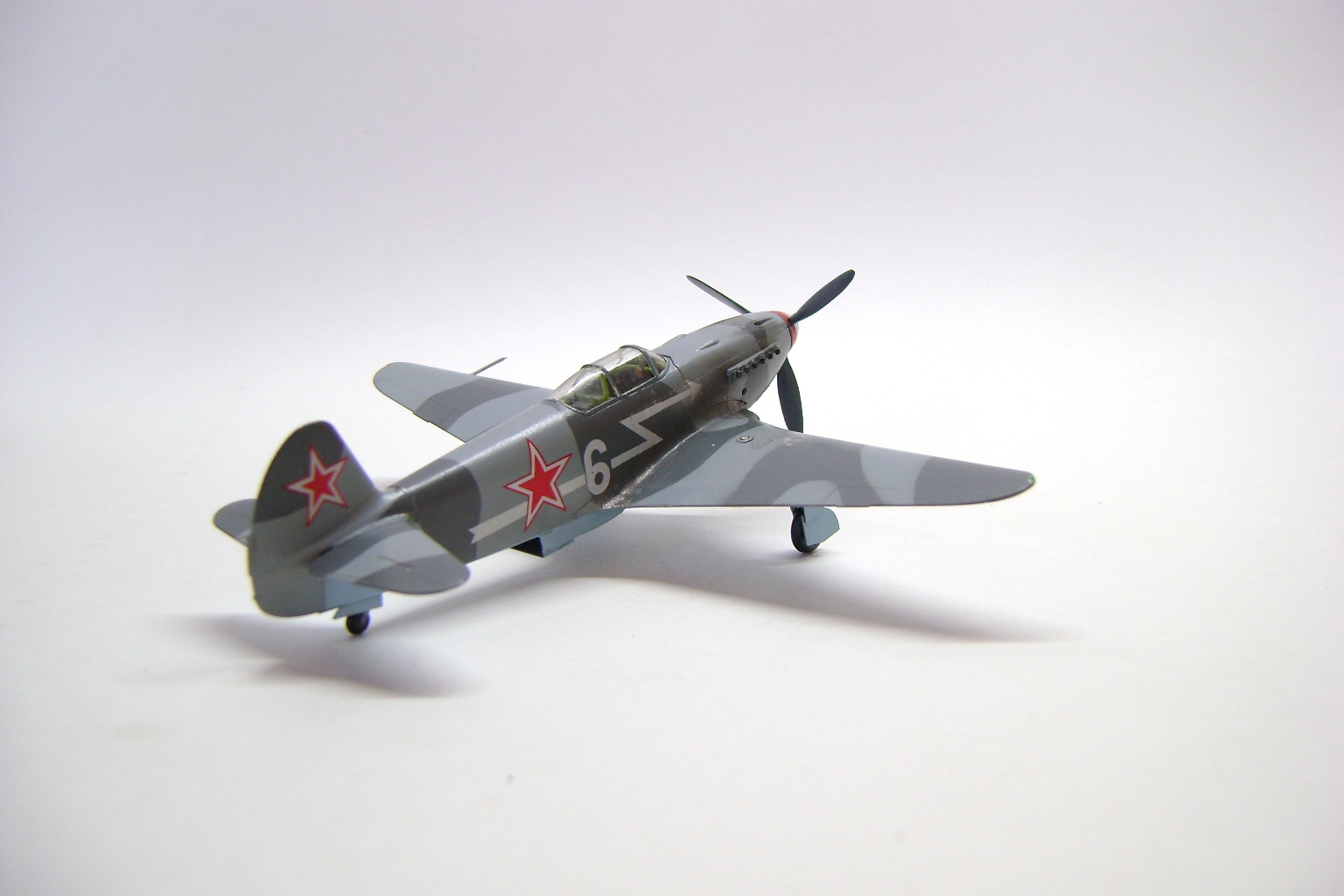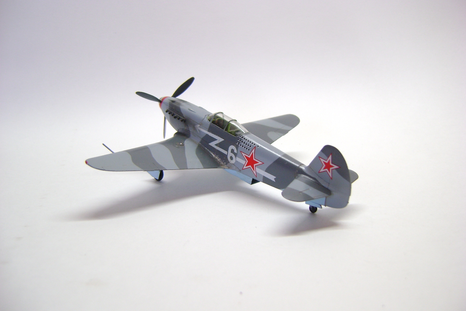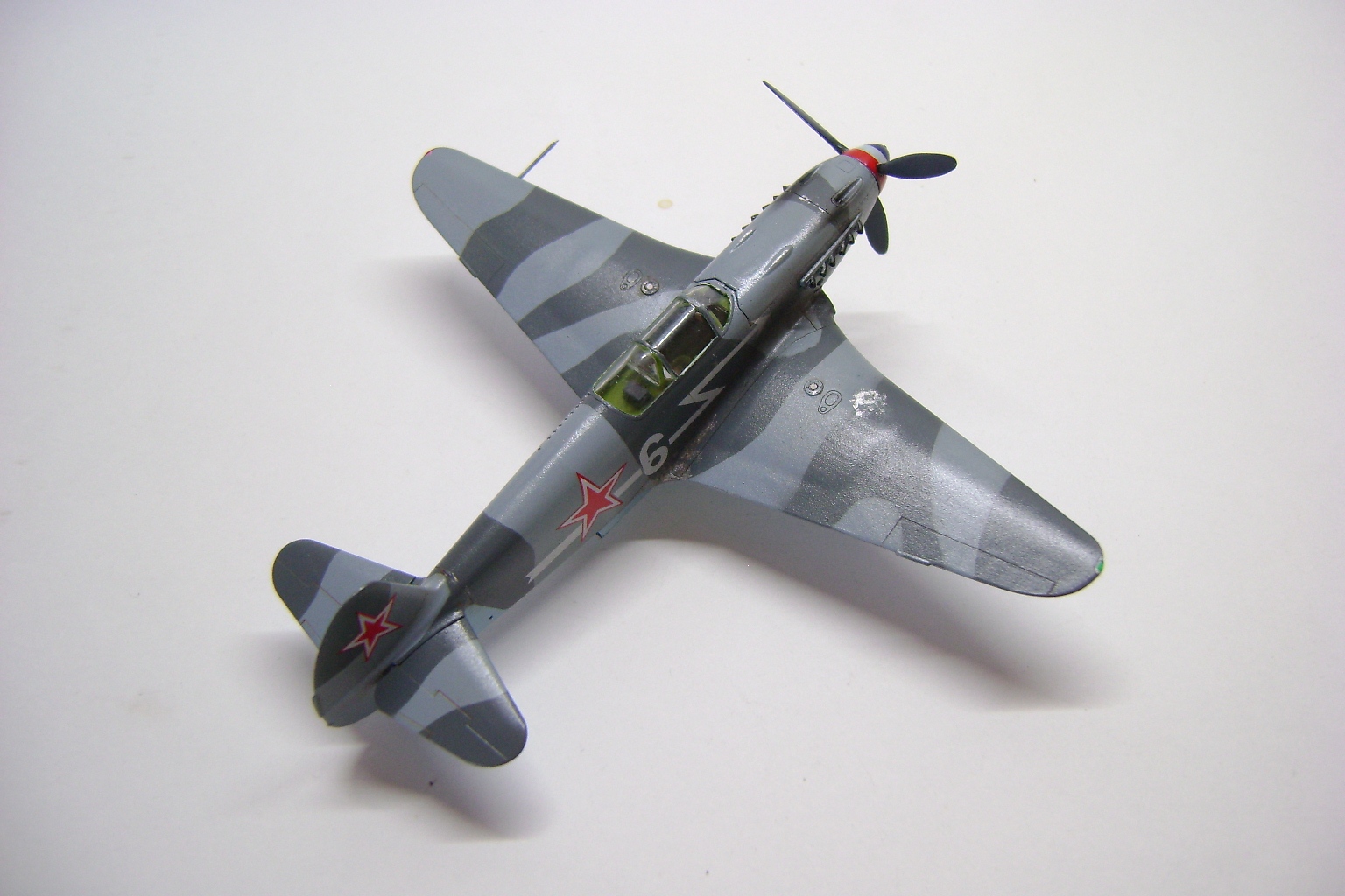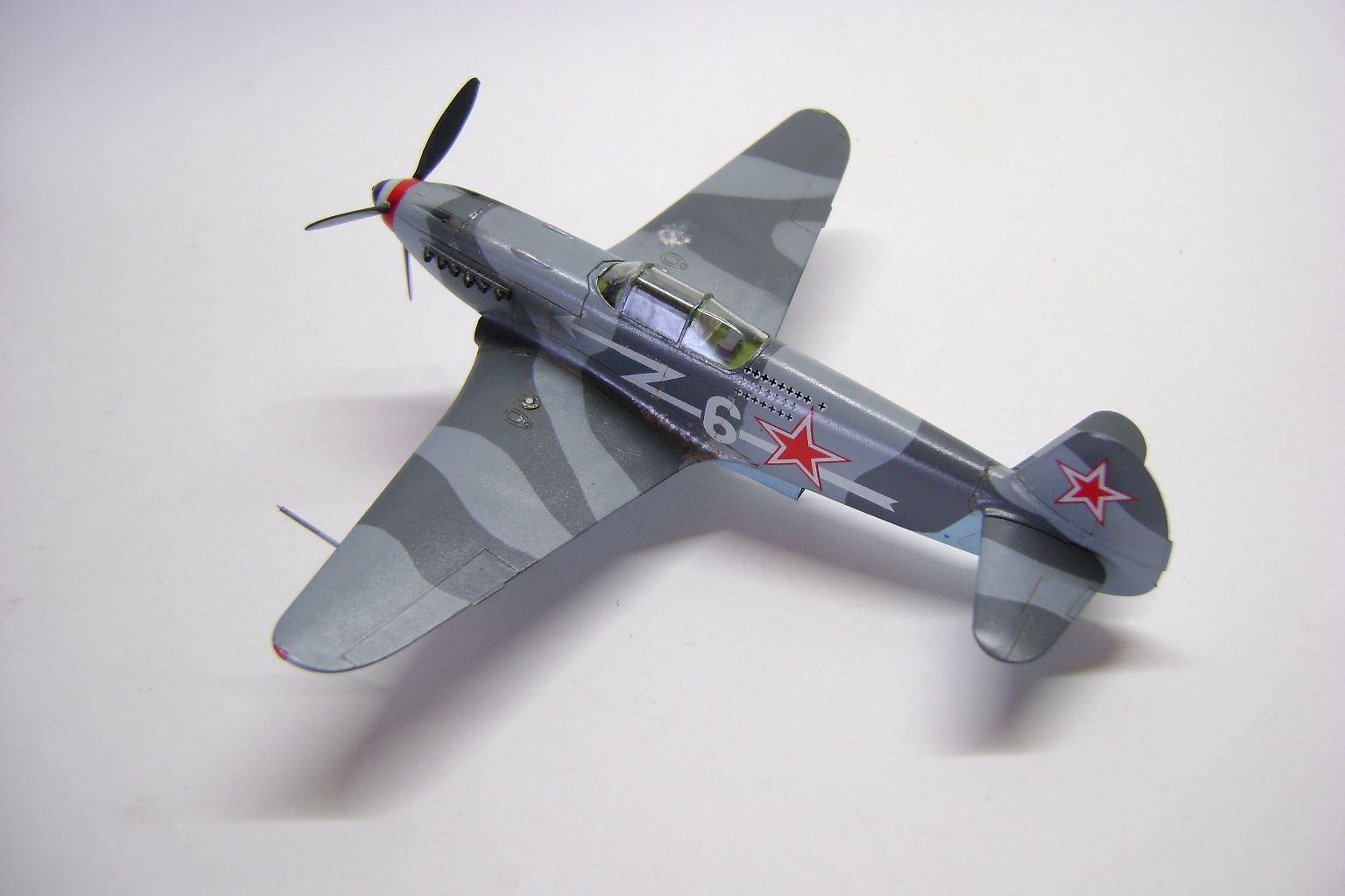 Выглядит модель неплохо, хотя в "историчности" много несоответствий, камуфляж, винт, "стрелка" на борту. Кстати сколы на зализах крыла - плод наших сегодняшних мечтаний и излишних художеств. Для обслуживания на крыло накладывалась брезентовая "дорожка", берегли механики свои машины.