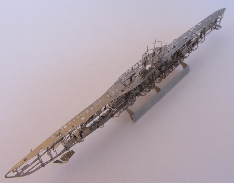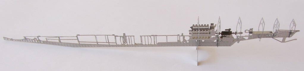 Использование исключительно травленых элементов, как никакой другой метод моделирования, позволило во всем великолепии представить набор корпуса и вообще структуру подводной лодки. Модель «дышит», она «прозрачна», прекрасно видны базовые конструкции прочного корпуса, булей и надстроек. Отчетливо просматриваются также контуры цистерны главного балласта, аккумуляторных ям и других основных элементов конструктива субмарины. В 350-м масштабе элементы набора корпуса выглядят очень реалистично. Но конечно такой подход (травленка) имеет ограничения при изображении объемных элементов: емкостей, двигателей, валов, перископов, торпед и т.д. – травленые детали, увы, плоские. Поэтому такие элементы лучше всего смотреть четко в профиль, трехмерные виды не для них. К этому надо относиться как к условности вроде театральных декораций.
