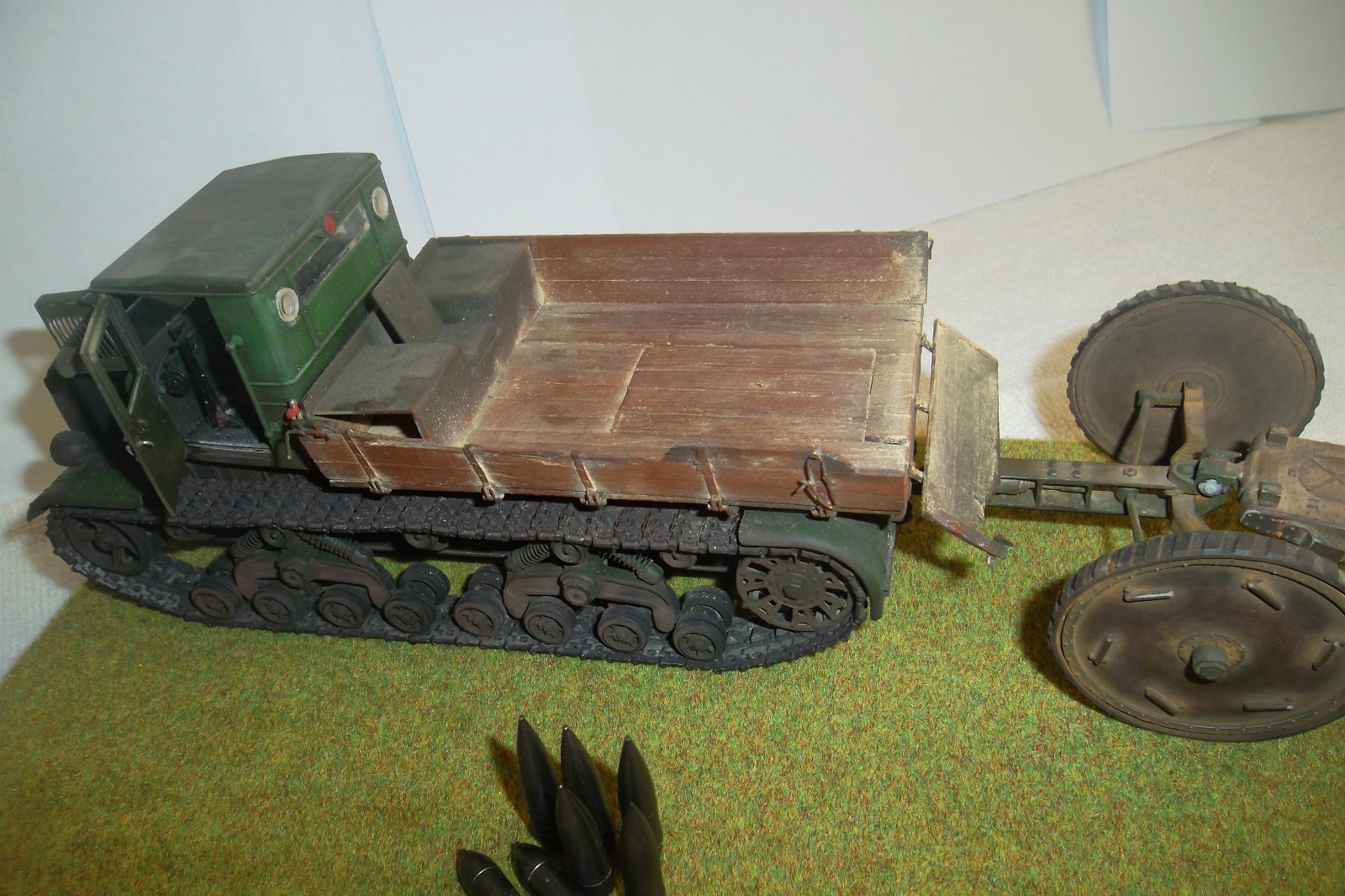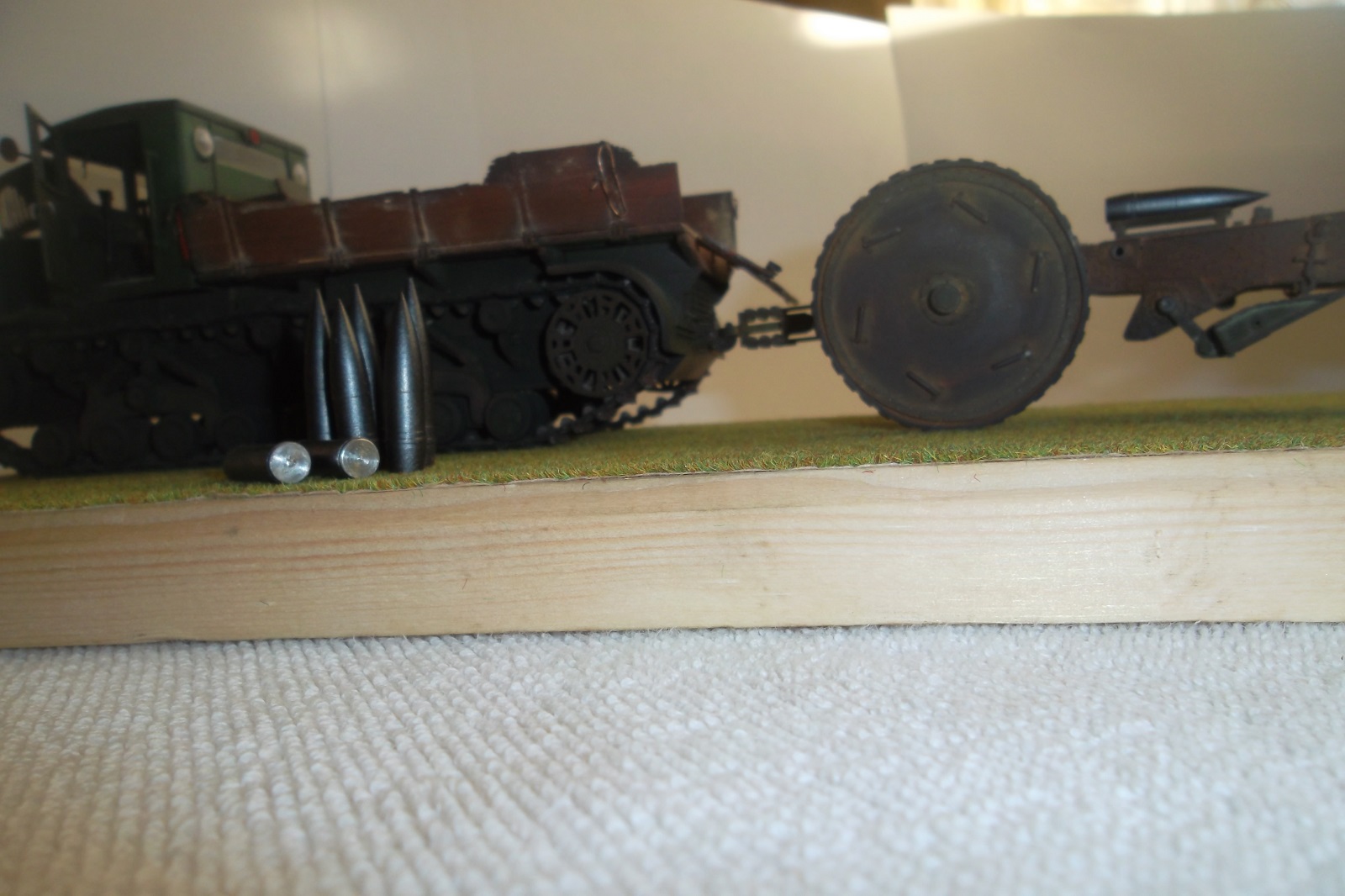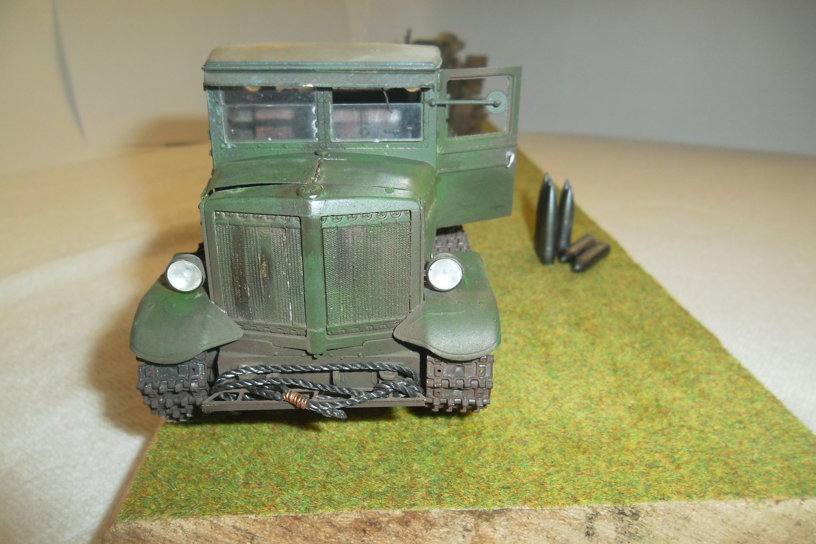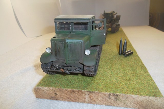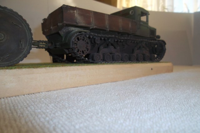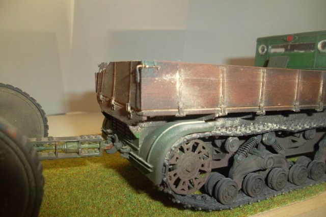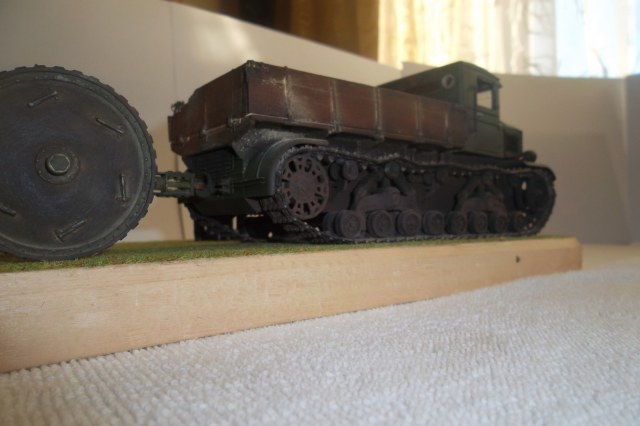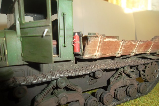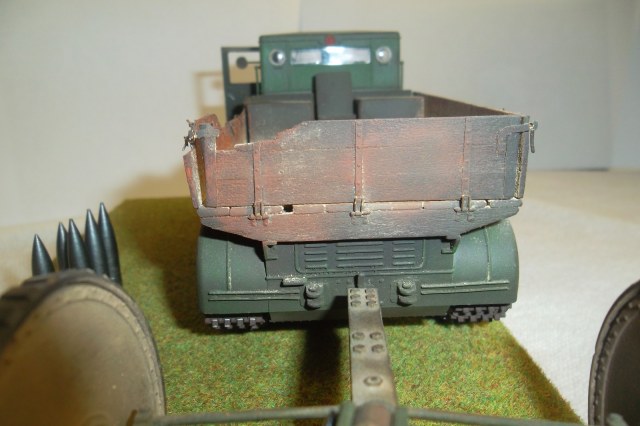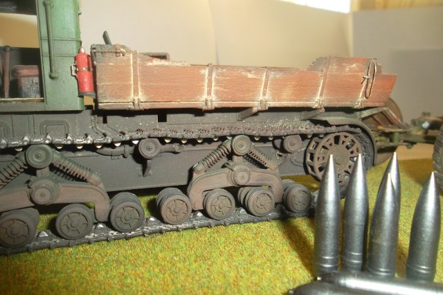 Касаемо Б-4, разве, что "гуси" "Фриул" и снаряды. В остальном - из каропка. Красил акрилом, звездовским. Тягач? Тягач в норме. Травление, чьё не помню. Помоему "Вояджер", не помню. Гуси "Фриул". С ходовкой конечно не очень. Всё видно. Без "Эльфа" не обошлось. Кузов полностью из флотской доски. Если постараться, можно открыть левый борт (вояджеру отдельное спасибо). Если ОЧЕНЬ! постараться, а главное захотеть, это сделать, можно и правый открыть... Вояджер, мать его... Задний борт вполне рабочий. И не надо в "косяки" тыкать... сам знаю. К модели теряю интерес на 90-95% готовности... Ну-у неинтересна она мне становится.