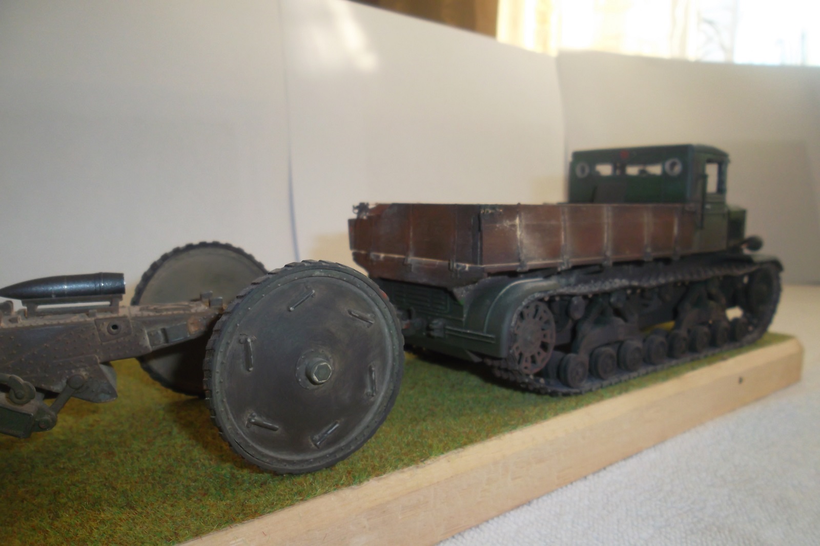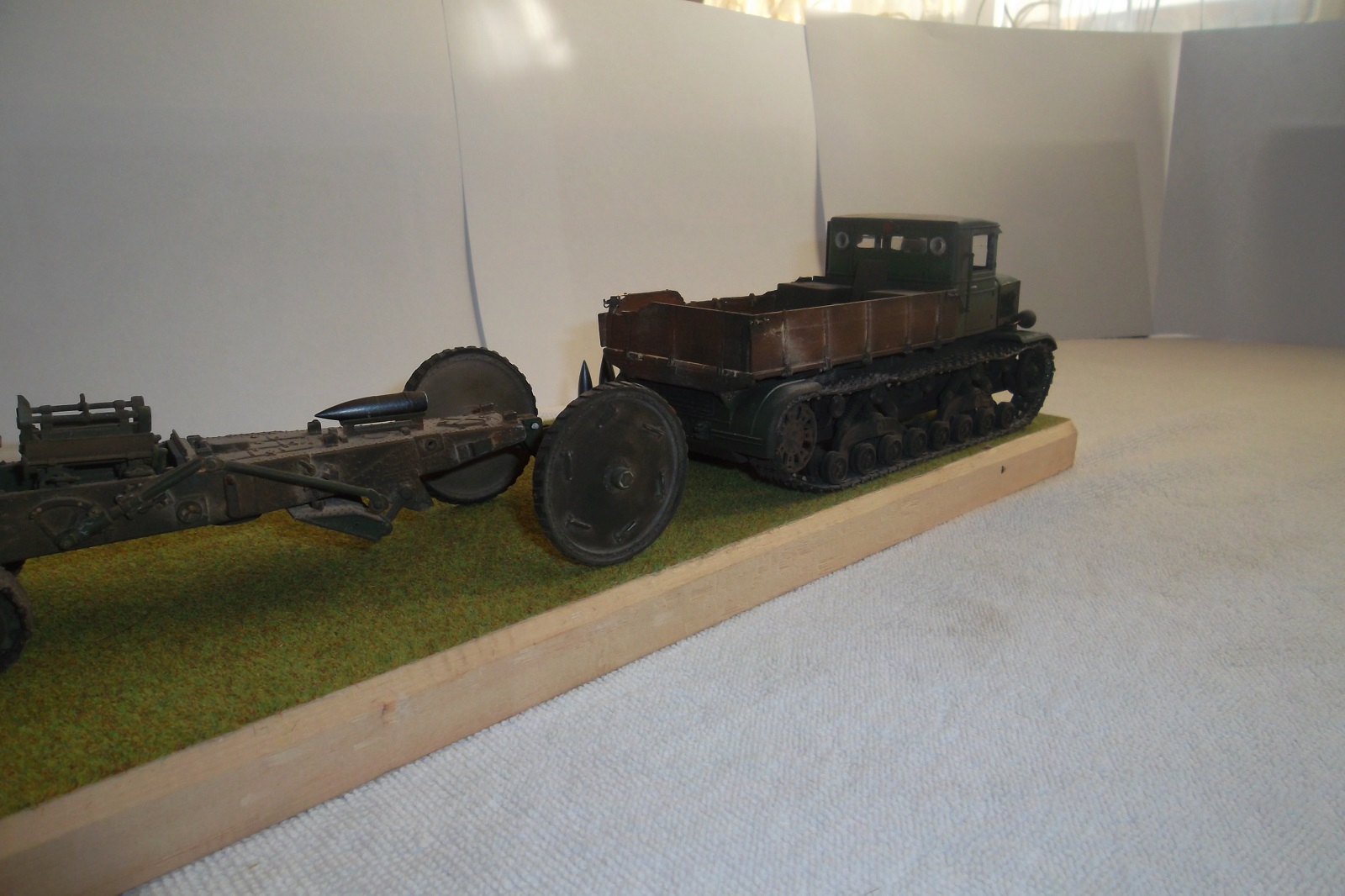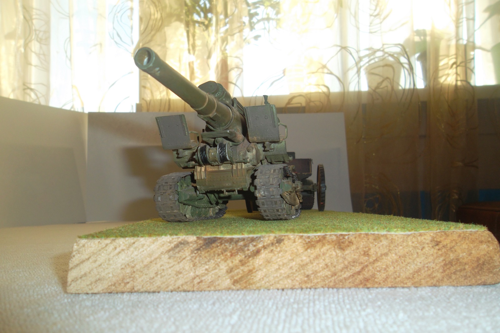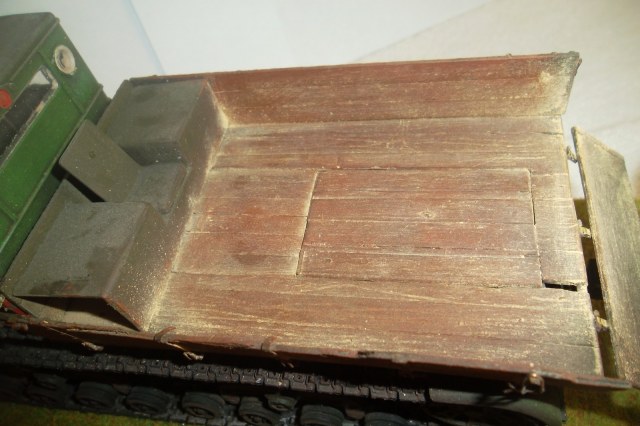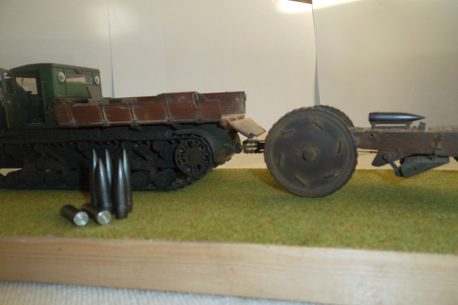 Касаемо Б-4, разве, что "гуси" "Фриул" и снаряды. В остальном - из каропка. Красил акрилом, звездовским. Тягач? Тягач в норме. Травление, чьё не помню. Помоему "Вояджер", не помню. Гуси "Фриул". С ходовкой конечно не очень. Всё видно. Без "Эльфа" не обошлось. Кузов полностью из флотской доски. Если постараться, можно открыть левый борт (вояджеру отдельное спасибо). Если ОЧЕНЬ! постараться, а главное захотеть, это сделать, можно и правый открыть... Вояджер, мать его... Задний борт вполне рабочий. И не надо в "косяки" тыкать... сам знаю. К модели теряю интерес на 90-95% готовности... Ну-у неинтересна она мне становится.