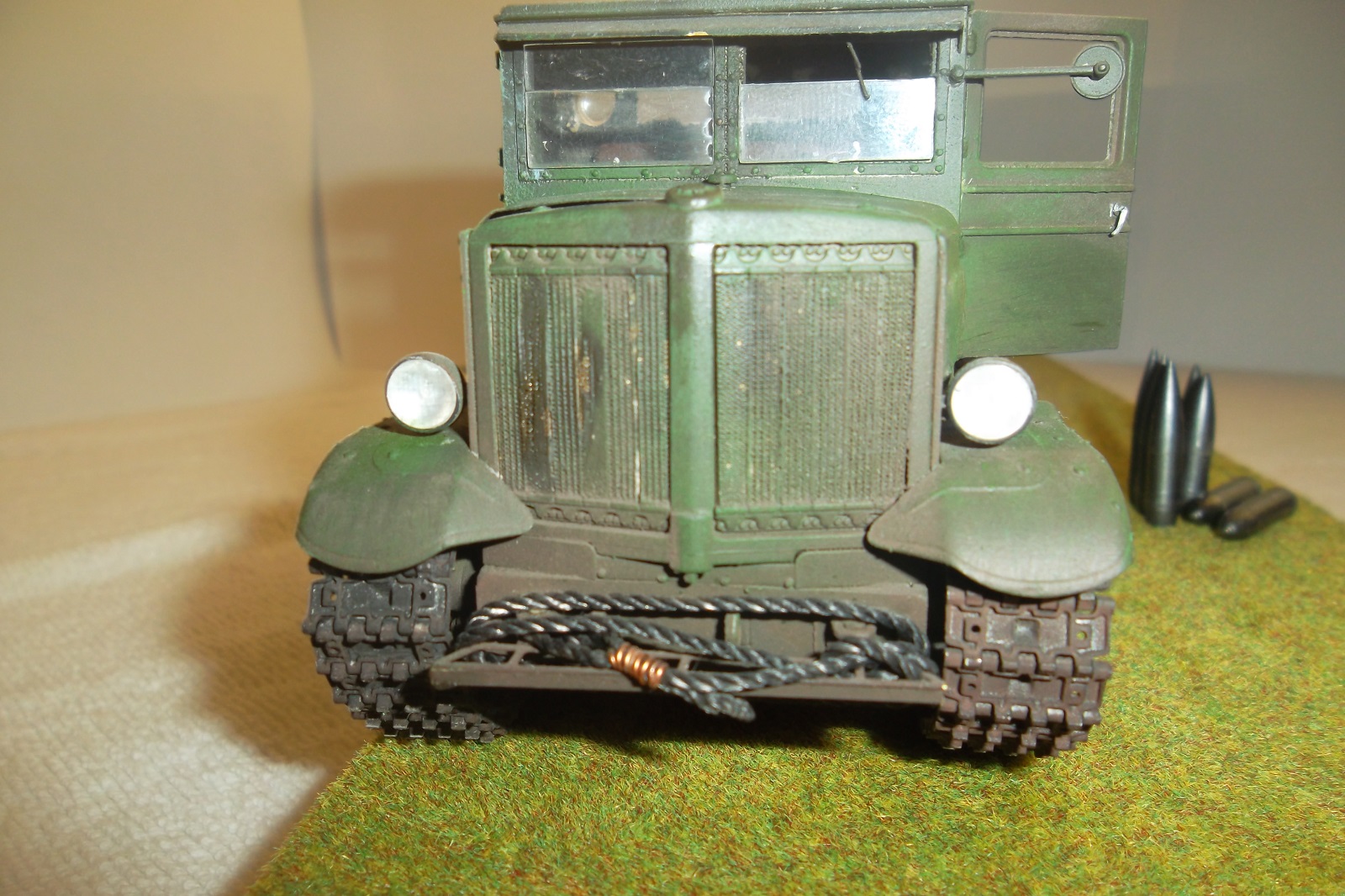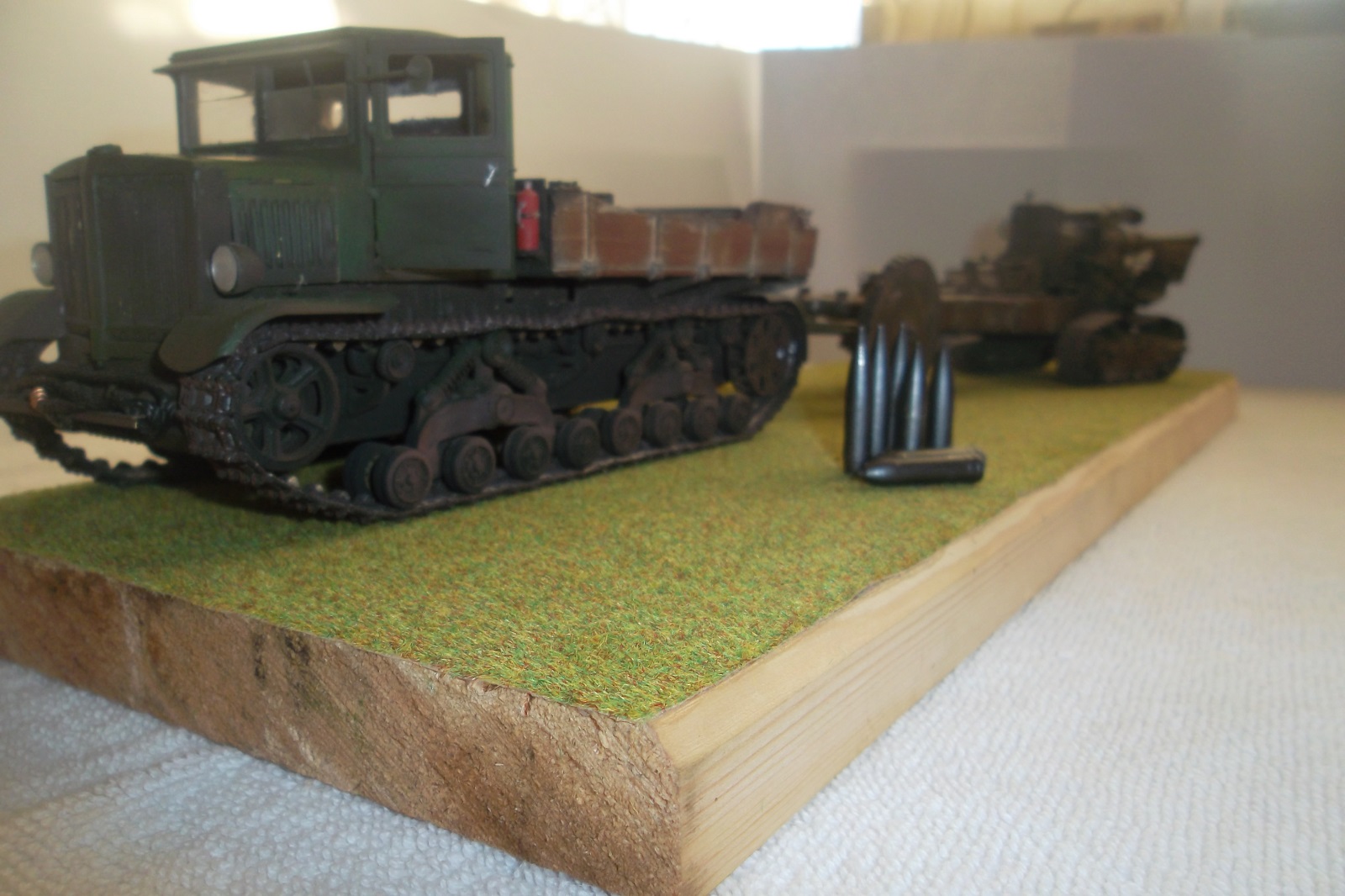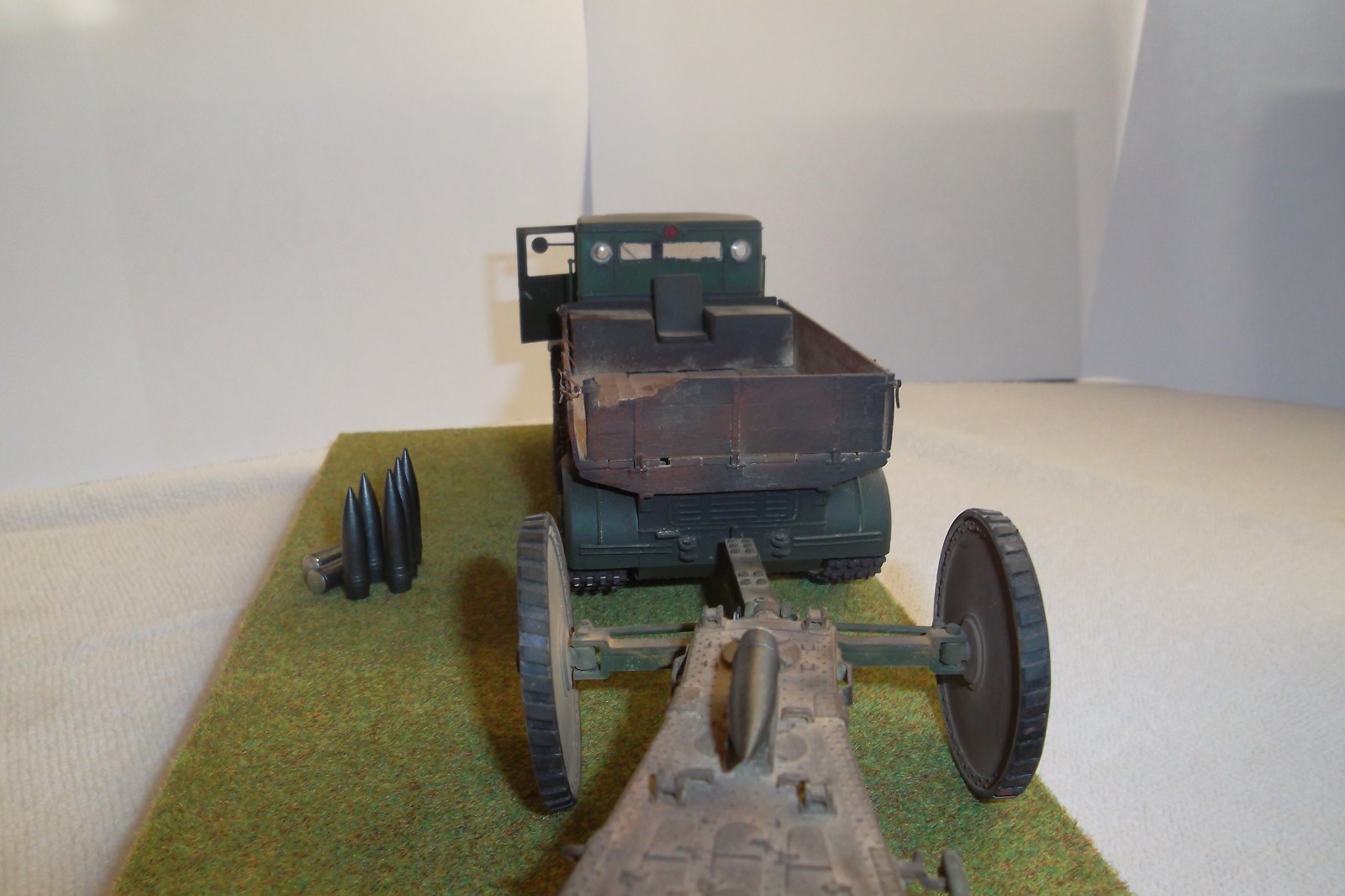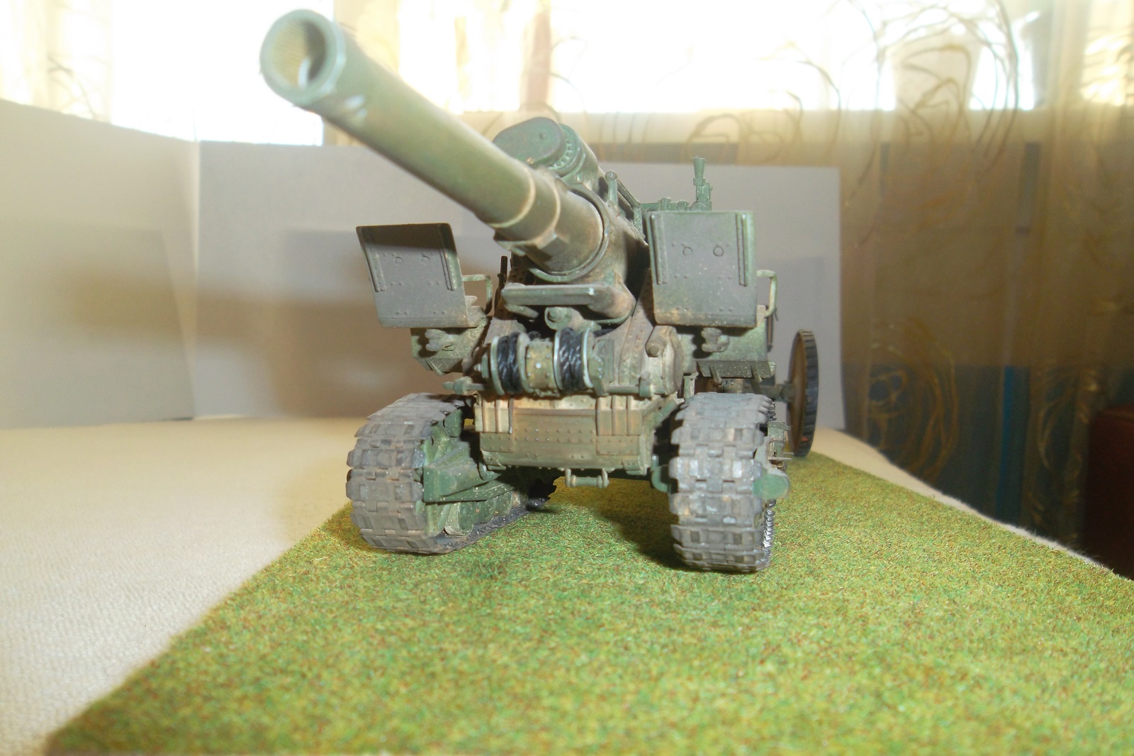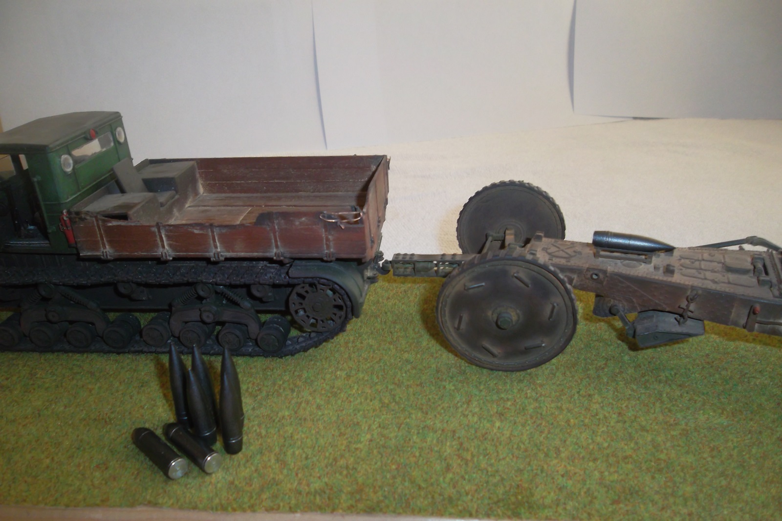 Касаемо Б-4, разве, что "гуси" "Фриул" и снаряды. В остальном - из каропка. Красил акрилом, звездовским. Тягач? Тягач в норме. Травление, чьё не помню. Помоему "Вояджер", не помню. Гуси "Фриул". С ходовкой конечно не очень. Всё видно. Без "Эльфа" не обошлось. Кузов полностью из флотской доски. Если постараться, можно открыть левый борт (вояджеру отдельное спасибо). Если ОЧЕНЬ! постараться, а главное захотеть, это сделать, можно и правый открыть... Вояджер, мать его... Задний борт вполне рабочий. И не надо в "косяки" тыкать... сам знаю. К модели теряю интерес на 90-95% готовности... Ну-у неинтересна она мне становится.
