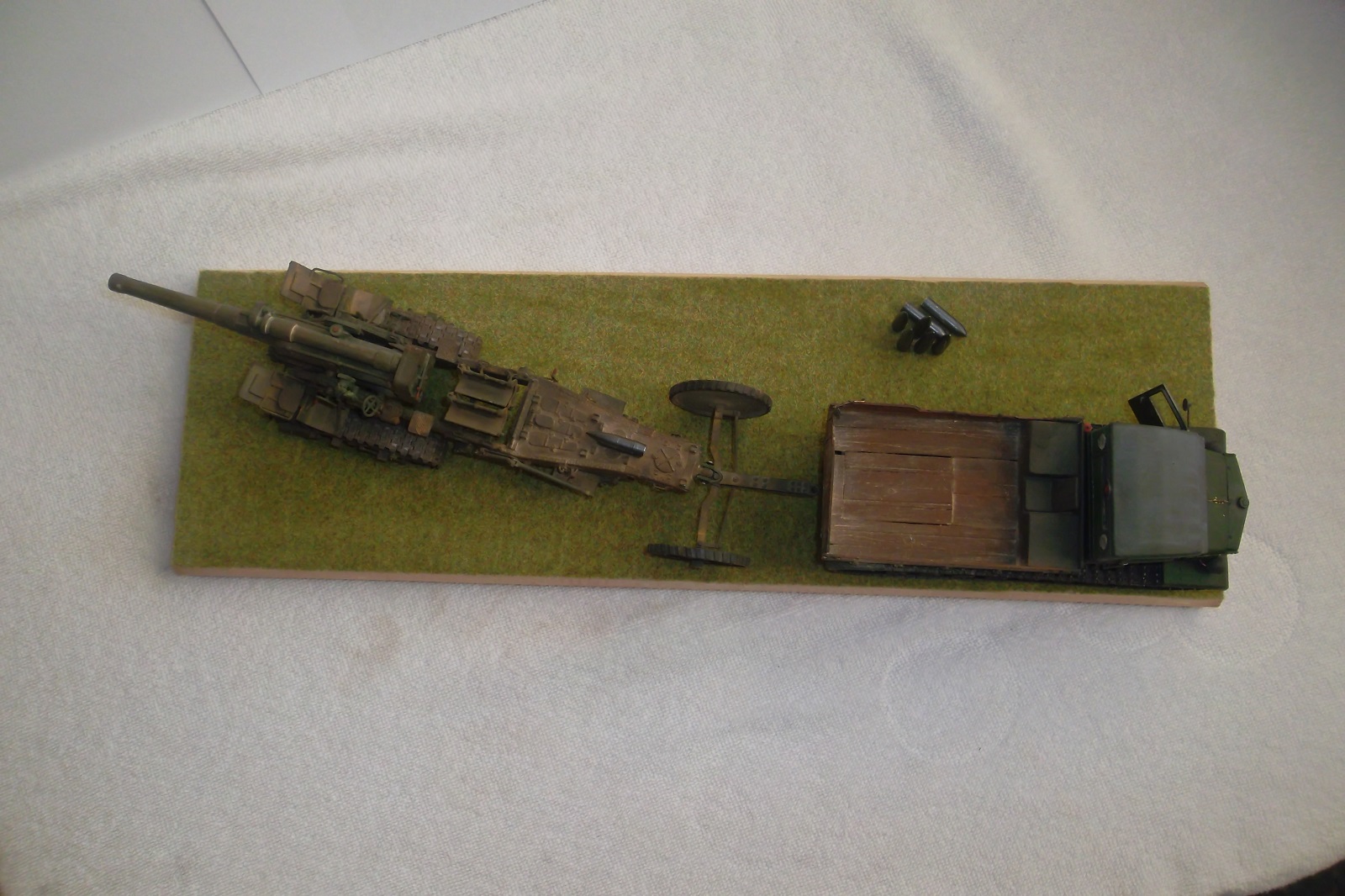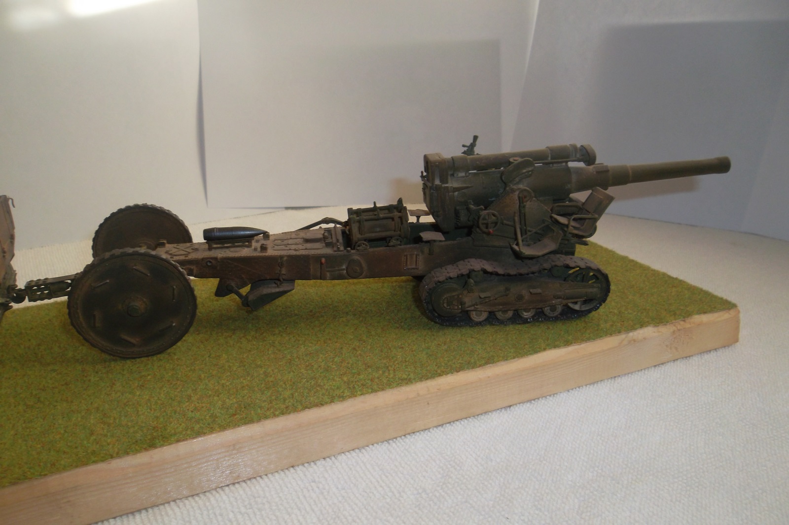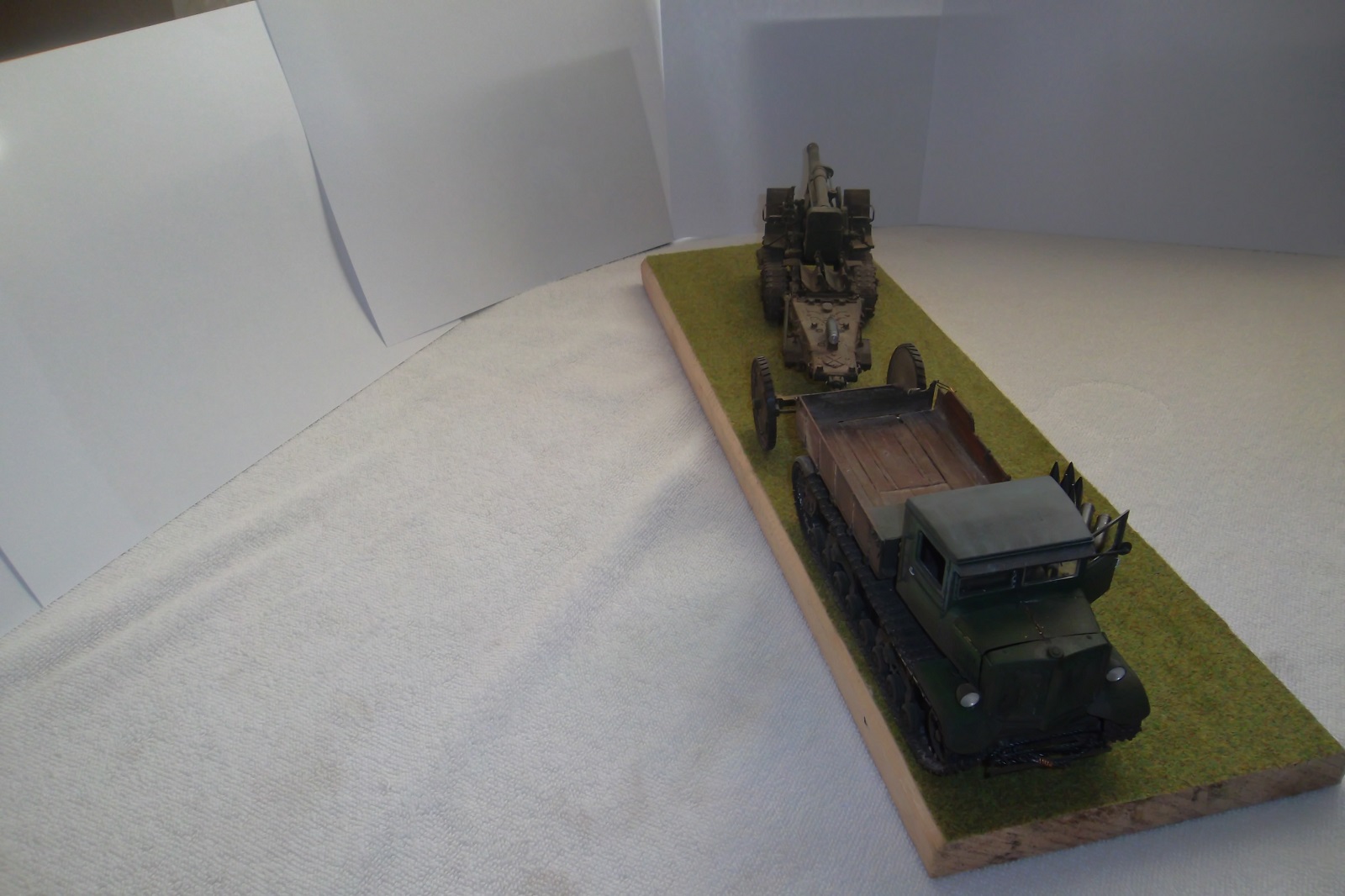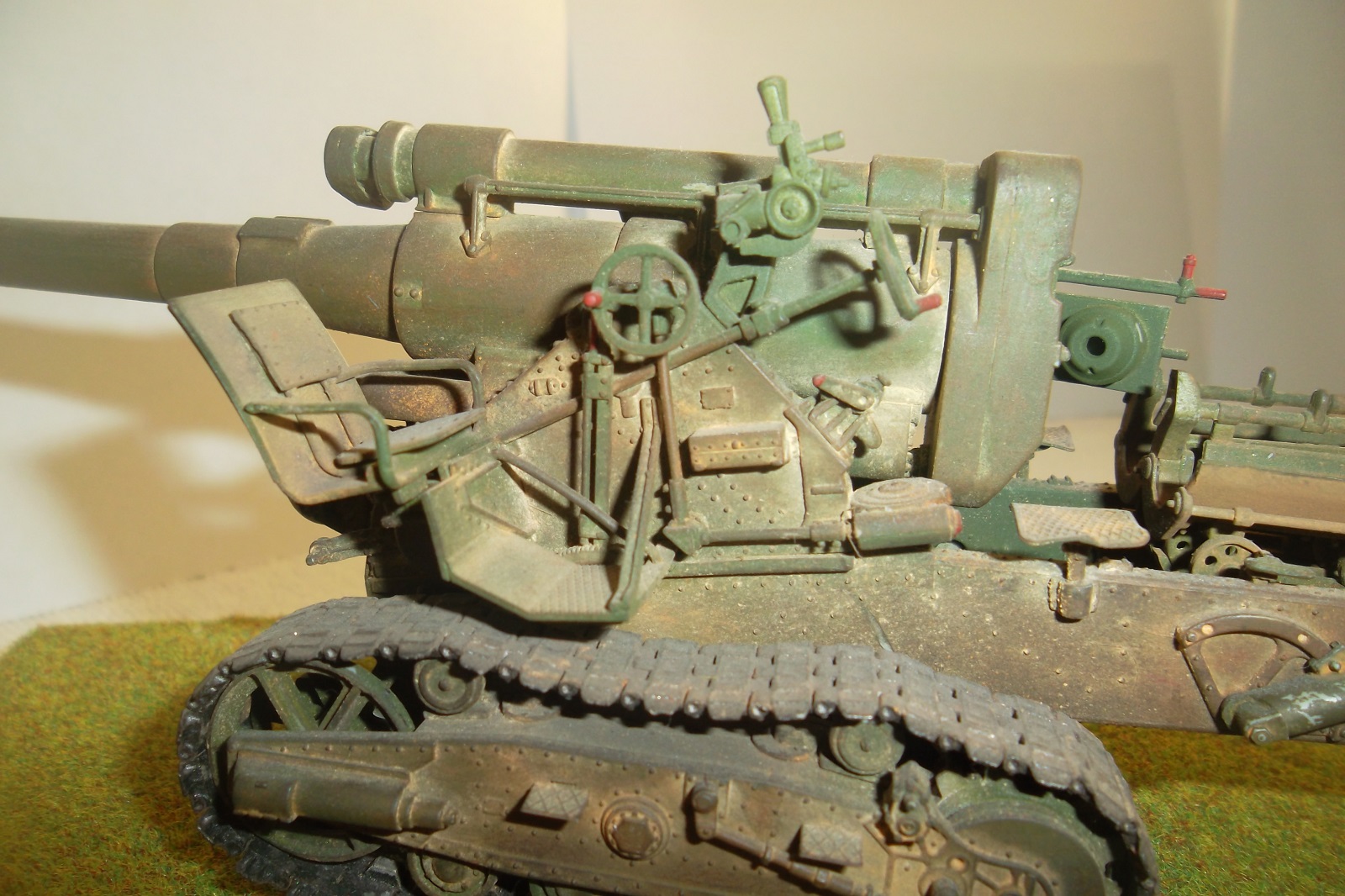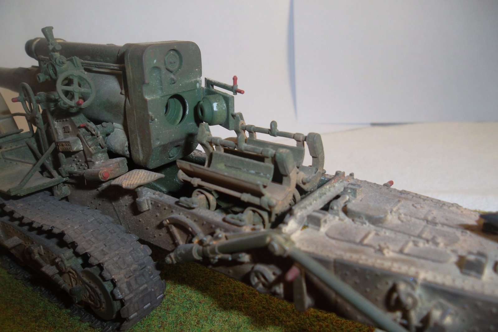 Касаемо Б-4, разве, что "гуси" "Фриул" и снаряды. В остальном - из каропка. Красил акрилом, звездовским. Тягач? Тягач в норме. Травление, чьё не помню. Помоему "Вояджер", не помню. Гуси "Фриул". С ходовкой конечно не очень. Всё видно. Без "Эльфа" не обошлось. Кузов полностью из флотской доски. Если постараться, можно открыть левый борт (вояджеру отдельное спасибо). Если ОЧЕНЬ! постараться, а главное захотеть, это сделать, можно и правый открыть... Вояджер, мать его... Задний борт вполне рабочий. И не надо в "косяки" тыкать... сам знаю. К модели теряю интерес на 90-95% готовности... Ну-у неинтересна она мне становится.
