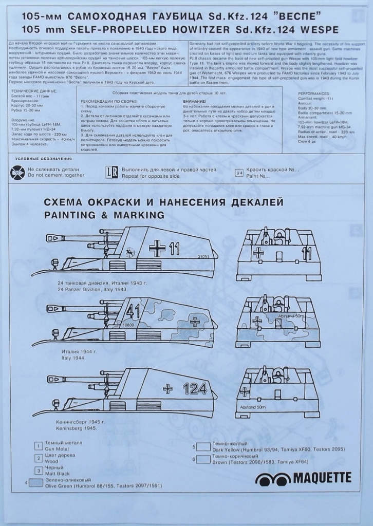 О самоходке; В начале 1942 года фирмой «Алькетт» была сконструирована очень удачная по многим показателям СУ «Веспе» — leichte Feldhaubitze 18/2 auf Fgst Pz Kpfw II (Sf) «Wespe» (Sd Kfz 124). В бою эта легкая подвижная машина была всегда готова поддержать мотопехоту и танки. Выпускала ее фирма ФАМО на измененном шасси Pz Kpfw II: корпус немного удлинялся, двигатель переносился вперед. В ходовую часть вводились блокирующие подвеску тормоза, что увеличило устойчивость платформы для стрельбы. Отнесенная на корму рубка была просторна и удобна для работы расчета гаубицы. На верхнем наклонном листе передней части корпуса устанавливался несколько смещенный влево бронеколпак для водителя с люками в лобовом листе и крыше.