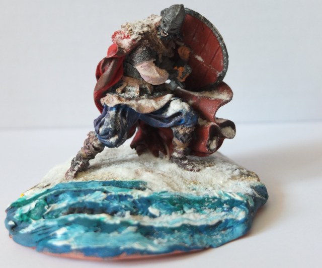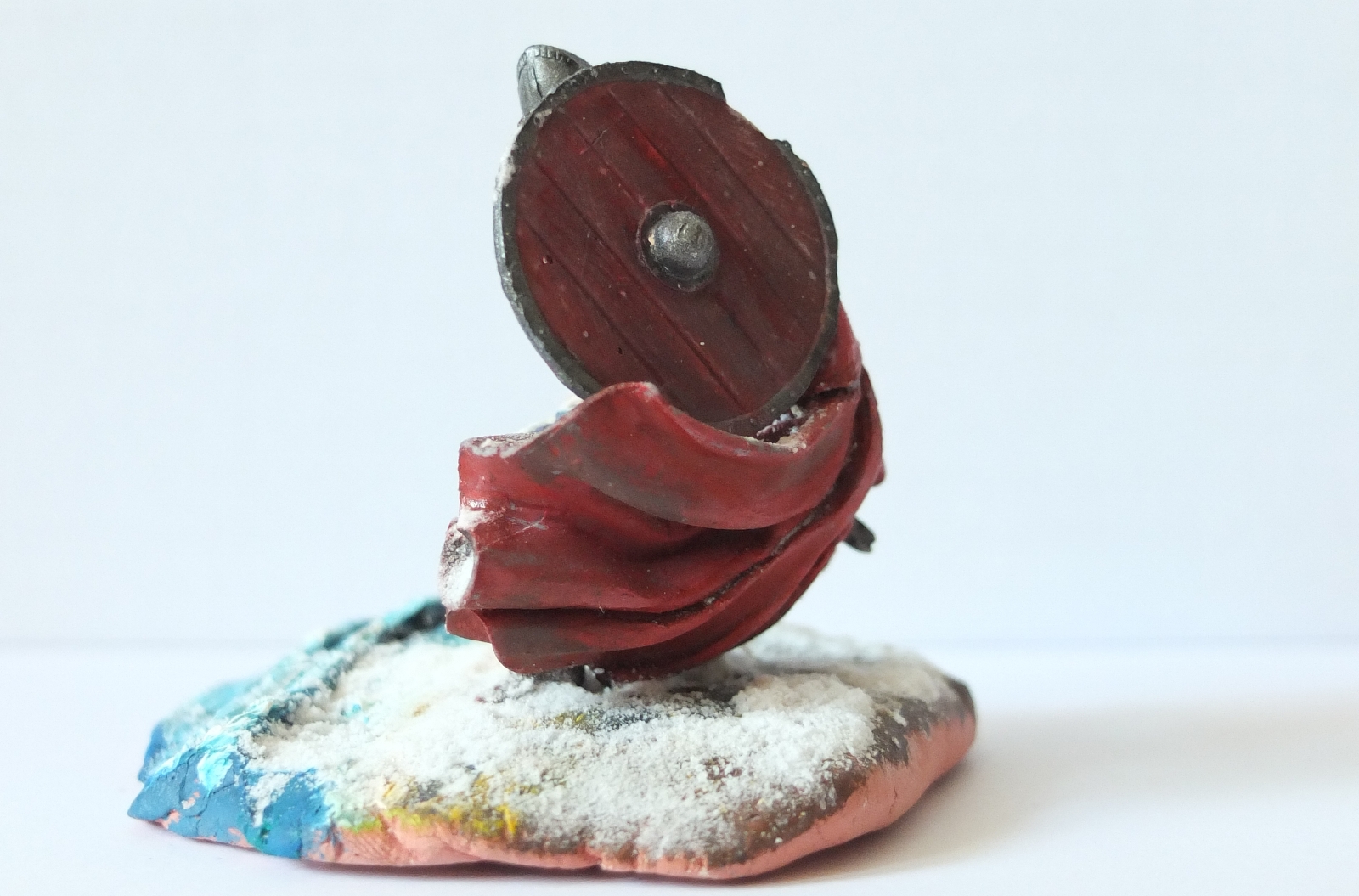 А мне понравилось. Ощущение, что викинг достает меч, прикрываясь от сильного ветра... Застрявший в складках одежды снег добавляет иллюзию сильной пурги и холода. Я не согласен, что для такого эффекта "заснеженности" человек должен простоять под снегопадом пару часов - снег и холодный морской ветер превратят человека в снеговика и за 10 минут... Вот только шлем с кольчугой уж больно светлые - морская соль, коррозия, знаете ли...