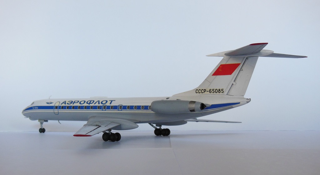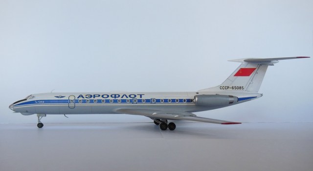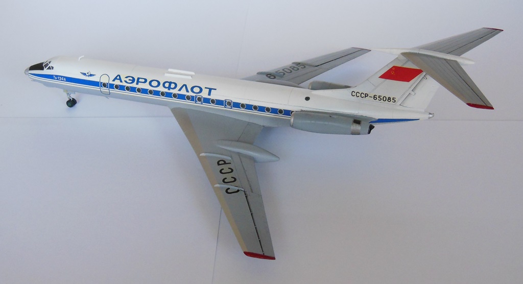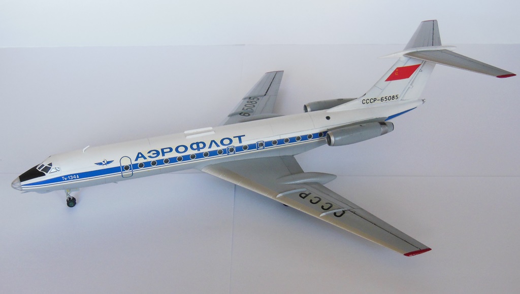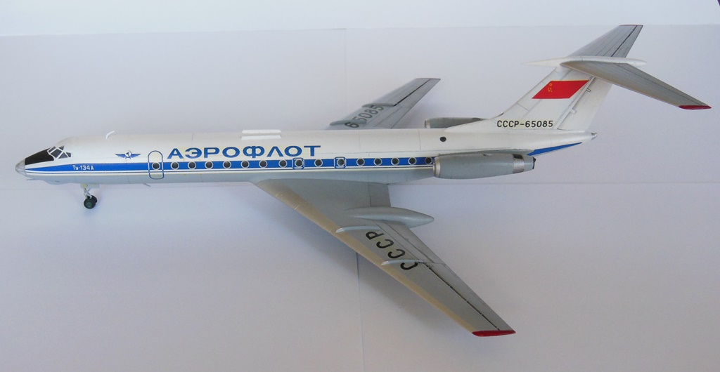 Всем здравствуйте! Представляю вашему вниманию Ту-134. Модель строил параллельно с Ту-154-ым, обе они были начаты в самом начале 2013 года и обе стройки зависли в полусобранном состоянии. Вдохновение вернулось лишь сейчас, спустя два с половиной года, и я снова взялся за работу. Достраивал обе модели симметрично, но так получилось, что Ту-134 финишировал позже. Сборка полностью из коробочная, стыковка деталей отличная, шпатлевки требовалось немного. Грунтовал тамиевской серой грунтовкой Surface Primerl, красил и лакировал всё тамией. Декали проблем в работе не вызывали. Грязнить модель не стал, выделил лишь механизацию крыла и чуть чуть расшивку на хвосте. Вариант окраски выбрал советский, очень уж мне он нравится, в планах даже создать небольшую линейку гражданских самолетов в ливрее СССР.
