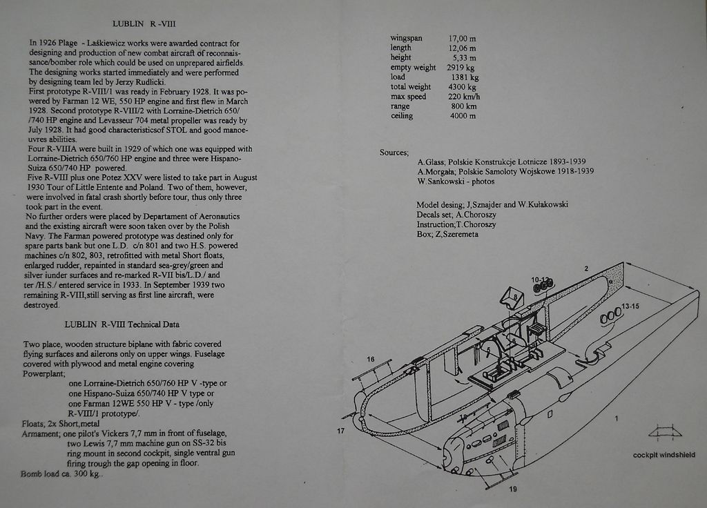 Модель из смолы от фирмы Choroszy Modelbud в масштабе 1/72 (номер по каталогу C06) упакована в картонную коробку. Традиционное для этой фирмы тонкостенное литьё половинок фюзеляжа с обильной деталировкой. Качество исполнения мелких деталей местами не важное. Декали на листе даются на несколько модификаций Lublin RVIII, которые фирма выпускает под разными артикулами. Инструкция относительно подробна и наглядна, но ей явно не хватает информации по расчаливанию.