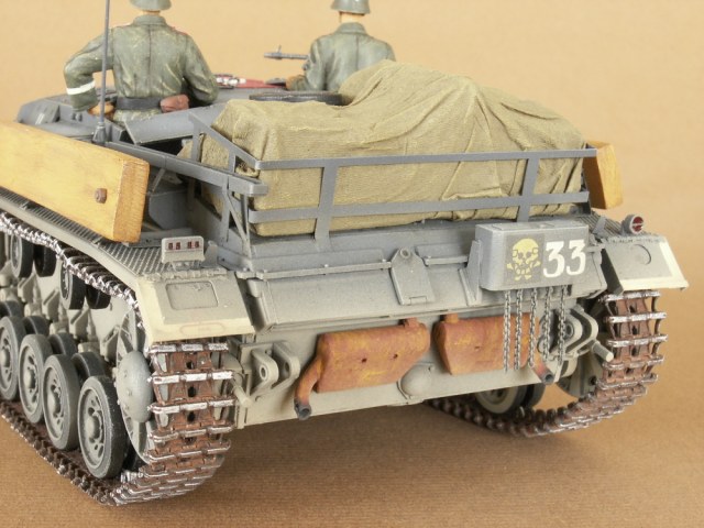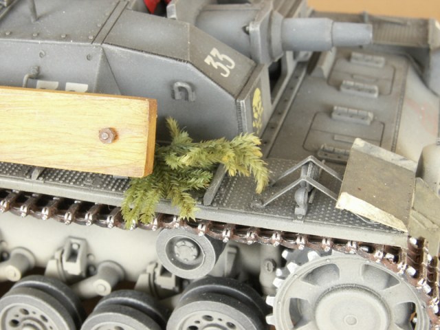 Интересен кронштейн крепления MG34. Ранним Штугам пулемет не полагался и экипажи изгалялись, кто как мог. В данном случае бойцы где-то скоммуниздили самолетный кронштейн. Сделал сам. Ствол пулемета – от японской фирмы Adler’sNestв исполнении SBF – SteelBlueFinish, то есть цвет вороненой стали был у ствола от рождения, красить не пришлось.