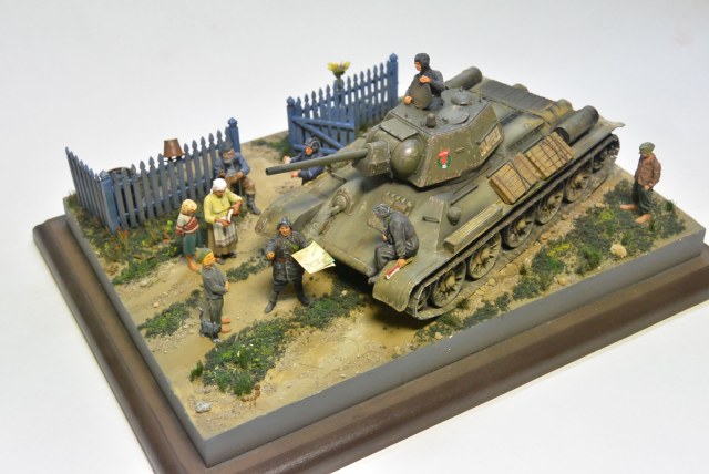 Основание гипс. 34-ка окрашена акрилом tamiya, нанесены фильтры и пигменты MIG, всё остальное окрашено воско-маслянной и пва темперой.