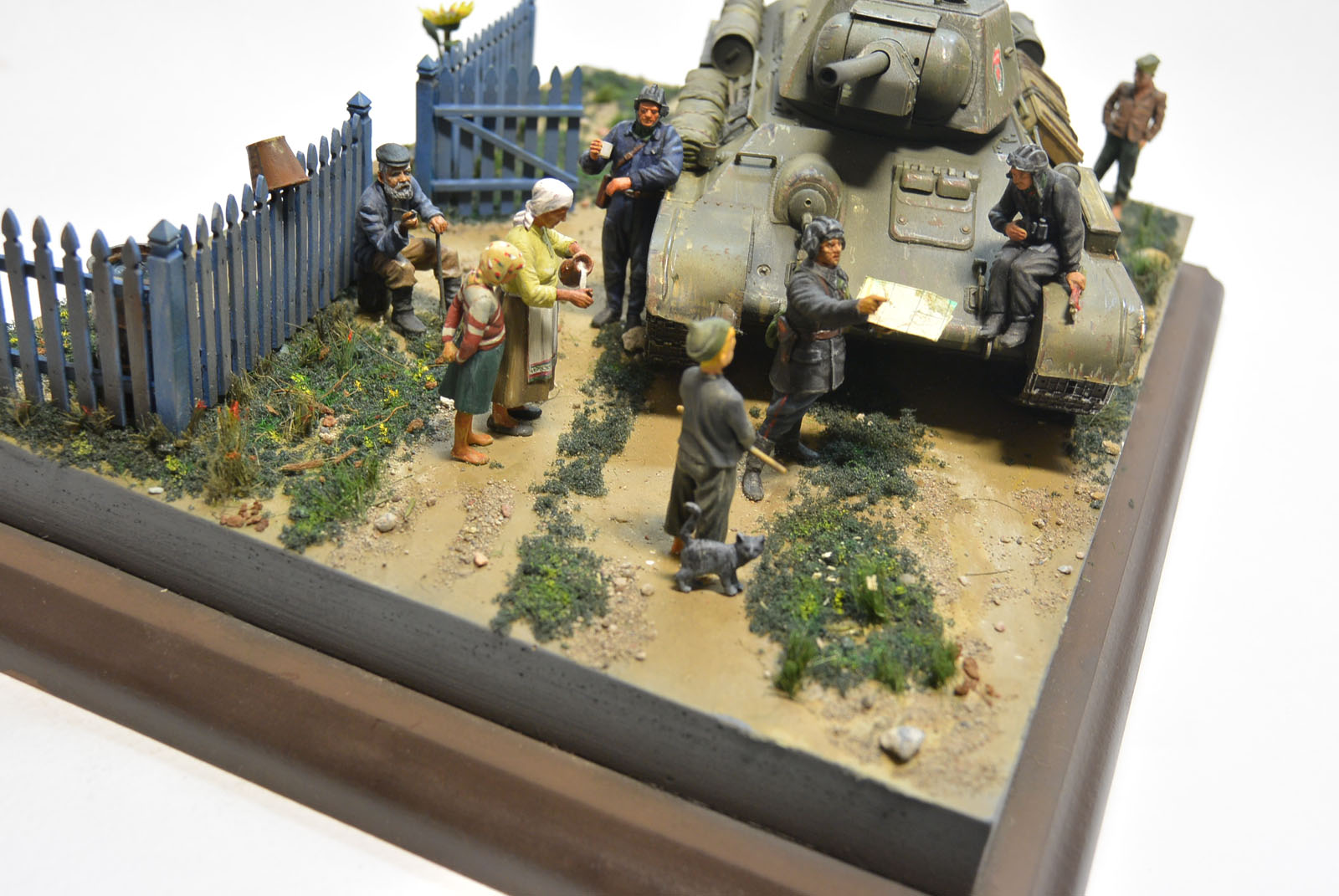 Диорама мне очень понравилась. Девочку-дебилку я не увидел - обычная деревенская девочка тех лет, забор лично мне кажется не новым свежевыкрашенным - спереди так вообще видно потертость и стирание краски до уже почерневшего дерева, растановка фигурок очень грамотная (остановились: дед сидит, бабка с внучкой напоить пытаются своих, пацан постарше технику рассматривает и думает про себя вот бы побыстрей вырасти и давить немца на такой махине, помладше тоже очень заитересовался танком, но больше с детской стороны (впечатляют размеры, пушка, хочется прокатится или хотя бы залезть на броню (у кого есть дети, которые видели танк сблизи поймут), командир спрашивает ориентиры у местных, сверяя с картой (кто был в зоне бевых действий, тот наверняка видел такой сюжет, когда неместные военные просили местынх жителей показать на карте те или иные ориентиры), остальной экипаж тоже норм - один отошел попить молока (причин масса), второй-мехвод вылез и находится рядом с люком, третий остался и не покинул машину. Так что все просто отлично: и исполнение и сама композиция (матчасть не беру во внимание). И "освободители" - это не значит, что именно они с боем вошли в деревню и прям только что ее освободили (хотя и такое тоже могло быть и тоже полностью нормально укладыватся в сюжет)... Деревня могла быть и раньше освобождена, а это просто НАШИ, ОСВОБОДИТЕЛИ...