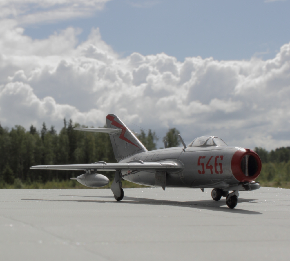 Набор неплохой, по стыкуемости, но мало детализации. Не понравилось передняя стойка с колесом одной деталью, место соединения фонаря с корпусом, как-то простенько. Не очень хорошо подходил воздухозаборник к корпусу. Доработок делать не стал. Красил балончиками и кистью местами. В процессе сборки опробовал Mark Fit STRONG для декалей и запорол оригинальный бортовой номер. Очень расстроился, хотел выкинуть, но через несколько дней наклеил другой с Корейского борта. Так что можно сказать такая машина не существовала. В завершении пофотографировал на улице, фотографии с "себром", всё таки основной противник МиГ-15.