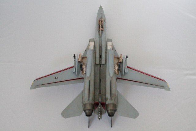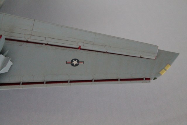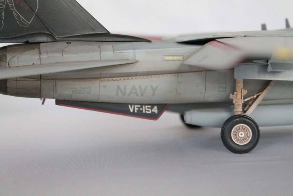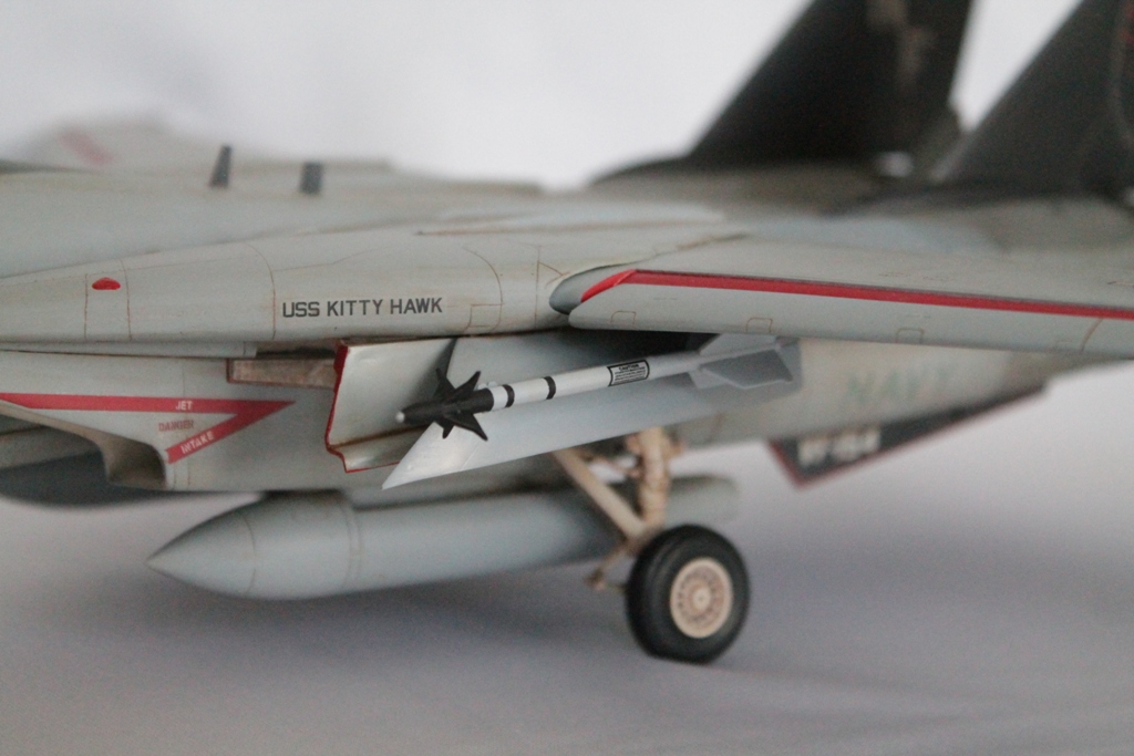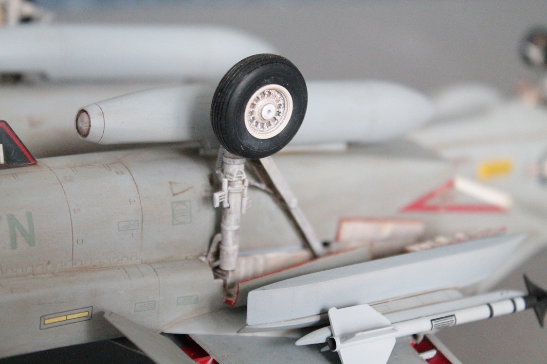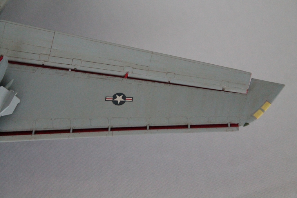 Дмитрий здравствуйте.Если позволите то немного покритикую Вашу работу.По цвету смывки согласен с Игорем - цвет странный, особенно странно он выглядит на белых стойках и дисках шасси.На фото килей бросаются в глаза места их стыка с фюзеляжем."Лобовуху" хорошо-бы было слегка подтонировать зеленым. При "складывании-раскладывании" на крыле остаются дугообразные следы...их имитация на модели так-же улучшила-бы внешний вид(прилагаю фото). Сайдвиндеры и пилоны подкрыльевые в местах где нет подвесок смотрятся очень простенько. Недоработали модель, поспешили.