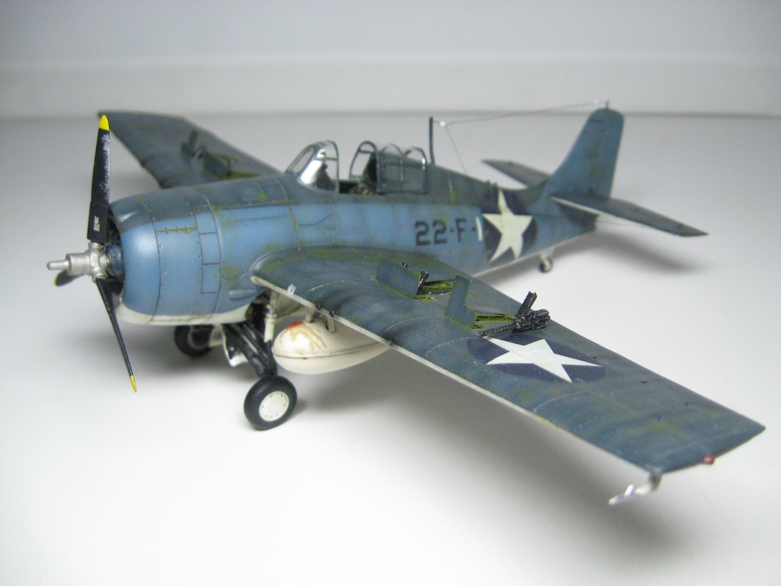Окраска Mr.Color верх, Tamiya низ, прешейдинг низ, верх панельное высветление разными оттенками. Имитацию сколов наносил губкой поверх базового цвета, кое где подрисовал кистью. Потом последовал слой лака, смывка которая никак не хотела затекать в нижний клеп и стерлась почти вся по низу, при этом загадив белый цвет. Пришлось высветлять белым. масляные точки. Обгадинг - копоть X-19 smoke Tamiya, подтеки топлива AK. Слой лака (70%Gloss+30%Mat Vallejo), и готово.