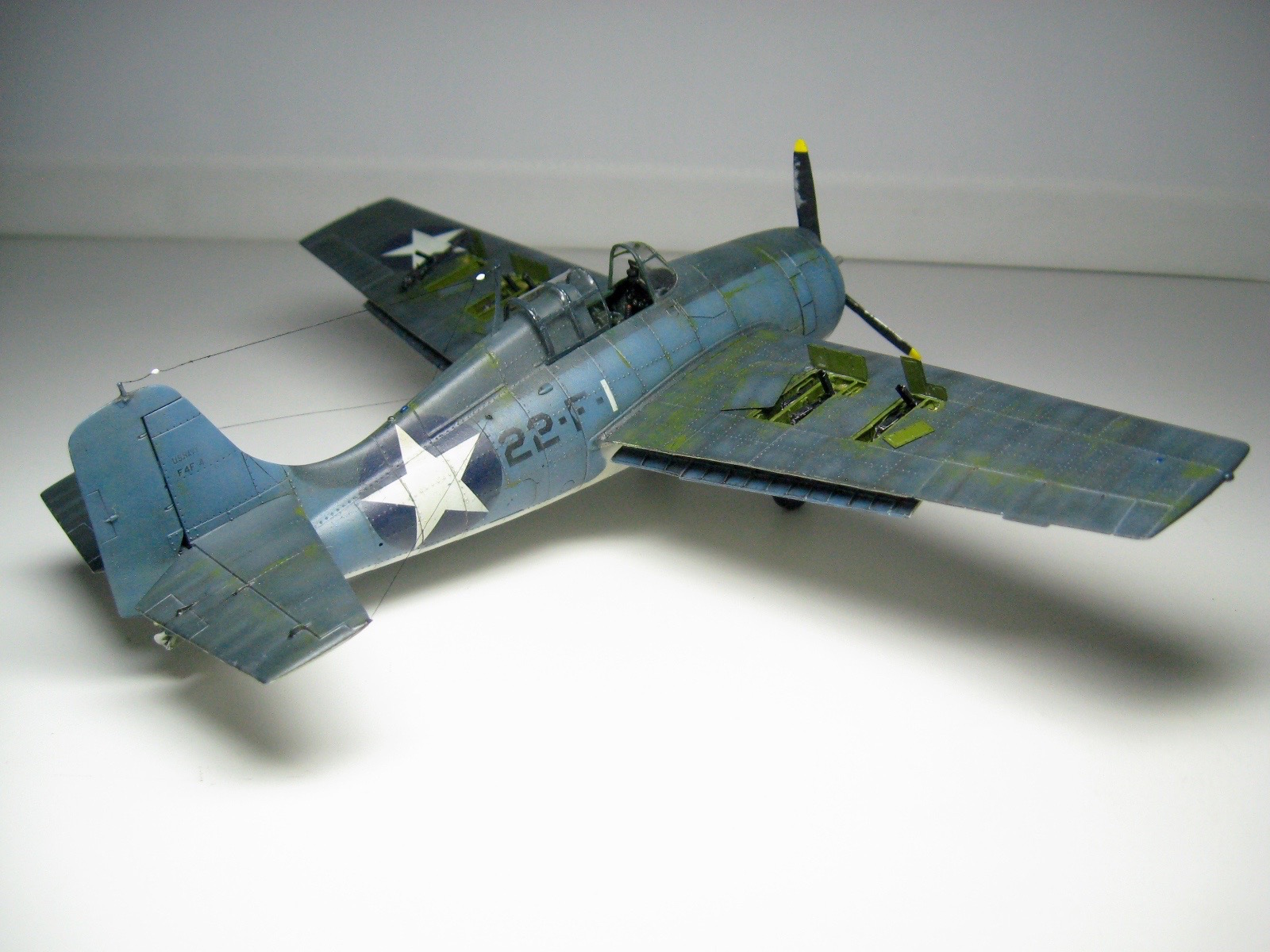 скажу так, проходя службу в армии на 61-й авиабазе, я насмотрелся на различную технику и на то как эта техника выглядит при круглогодичной эксплуатации, а с учетом того что данный самолет - палубник, и эксплуатировался он в более экстремальных условиях, я предположил, что он может так облупиться, и под "мохом" я подразумеваю грунтовое покрытие типа "zinc chromate". Или вы так считаете лишь по причине того, что эти сколы нанесены поверх базового слоя, губкой ??? Так такая техника нанесения тоже существует.