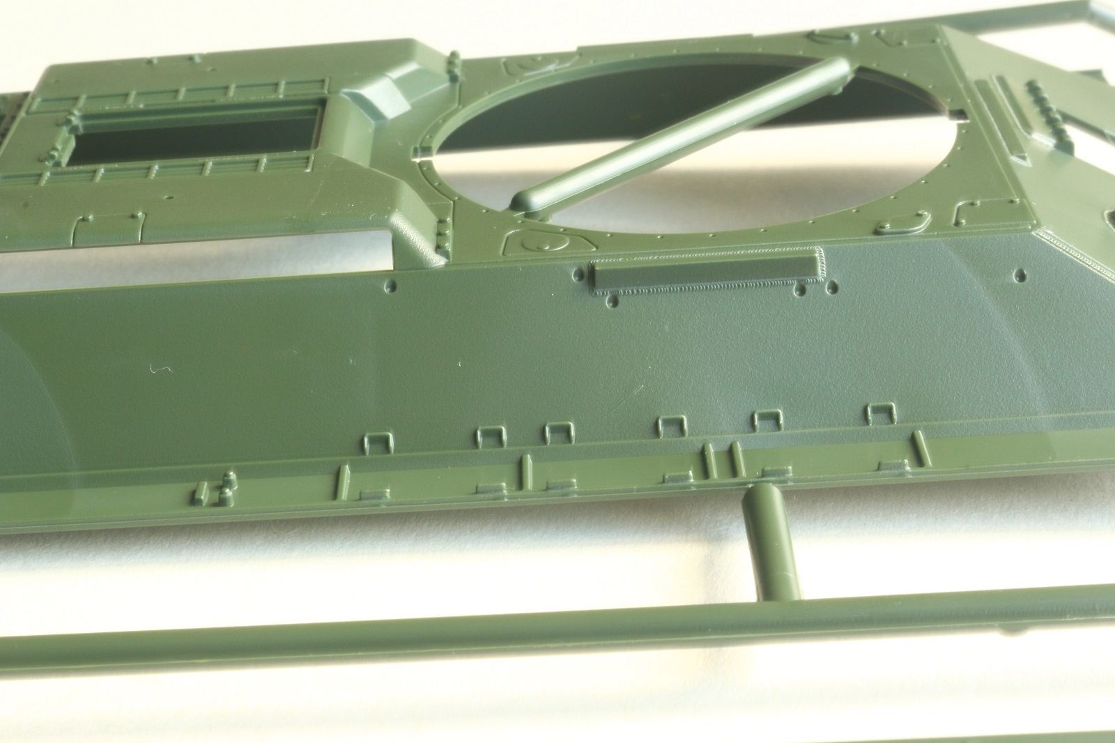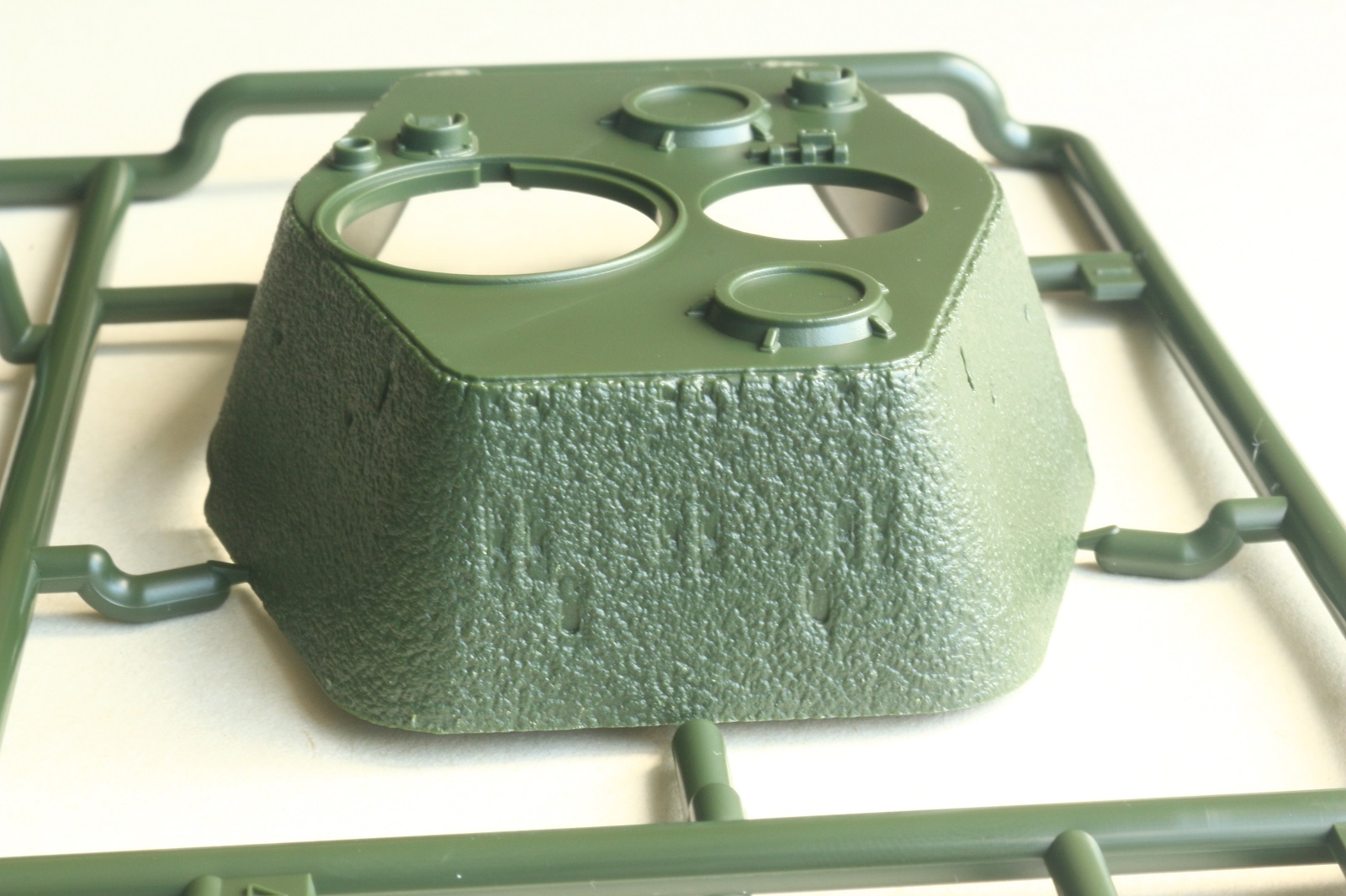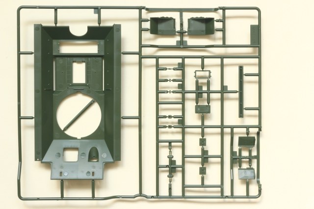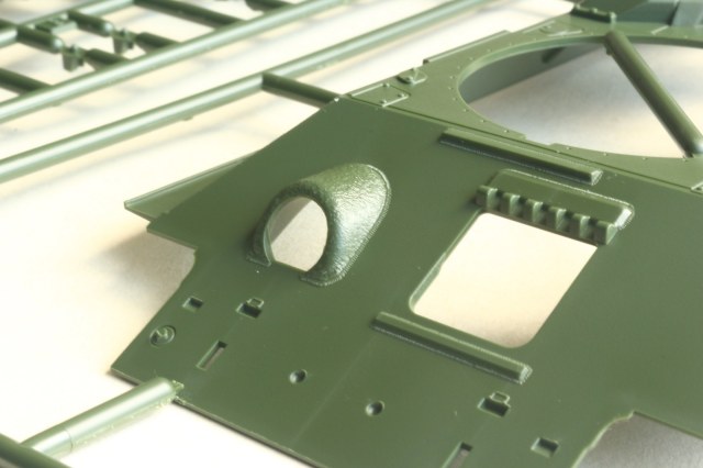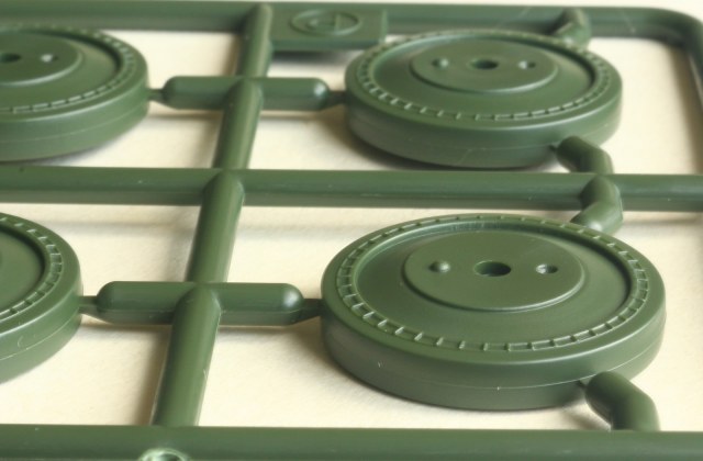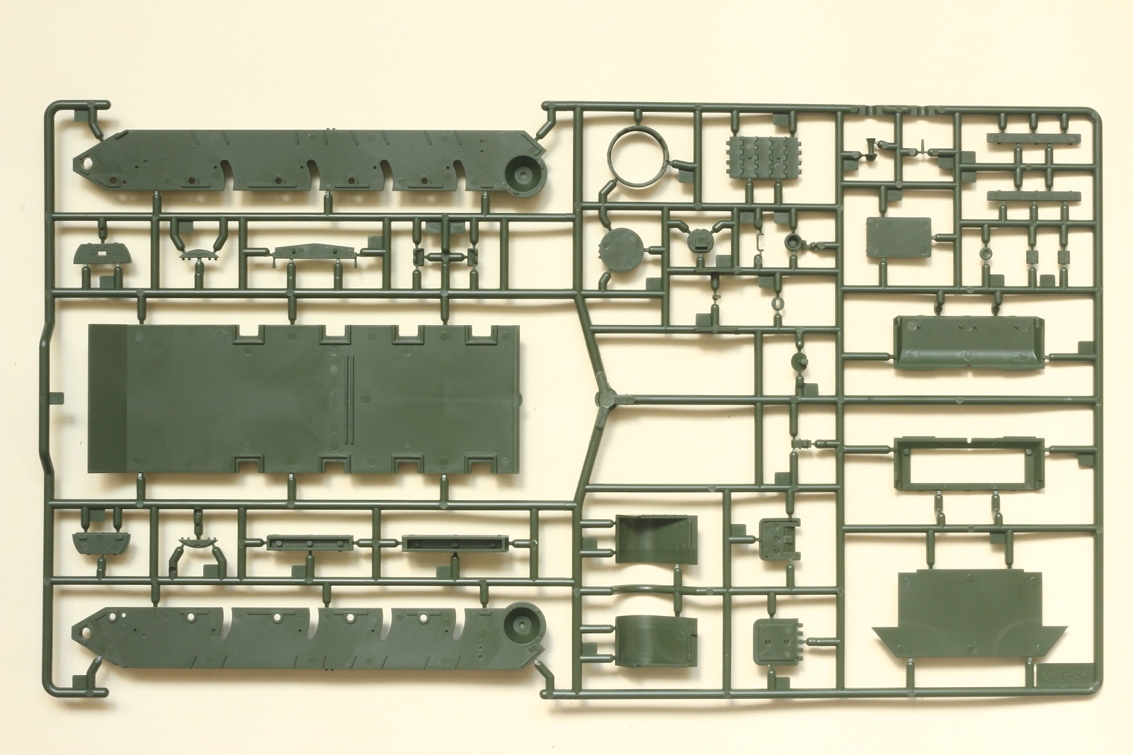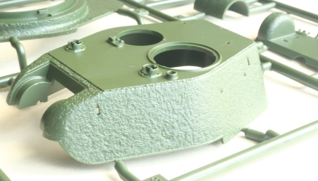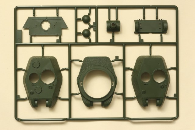 Визуально набор выглядит отлично, нет утяжин и облоя, смещений пресс-форм не видно. Даны два варианта башни, два варианта крышки вентиляции на МТО с сеткой и без, для установки травления и два варианта передних брызговиков. Траки несколько простоваты и почти на каждом с внутренней стороны присутствует по два следа от толкателей. Пытаясь изобразить структуру литой брони Academy на мой вкус несколько перестаралась. Башни и маска орудия слишком щербатые, придётся зашлифовывать. Все люки возможно сделать открытыми. Ствол отлит одной деталью.