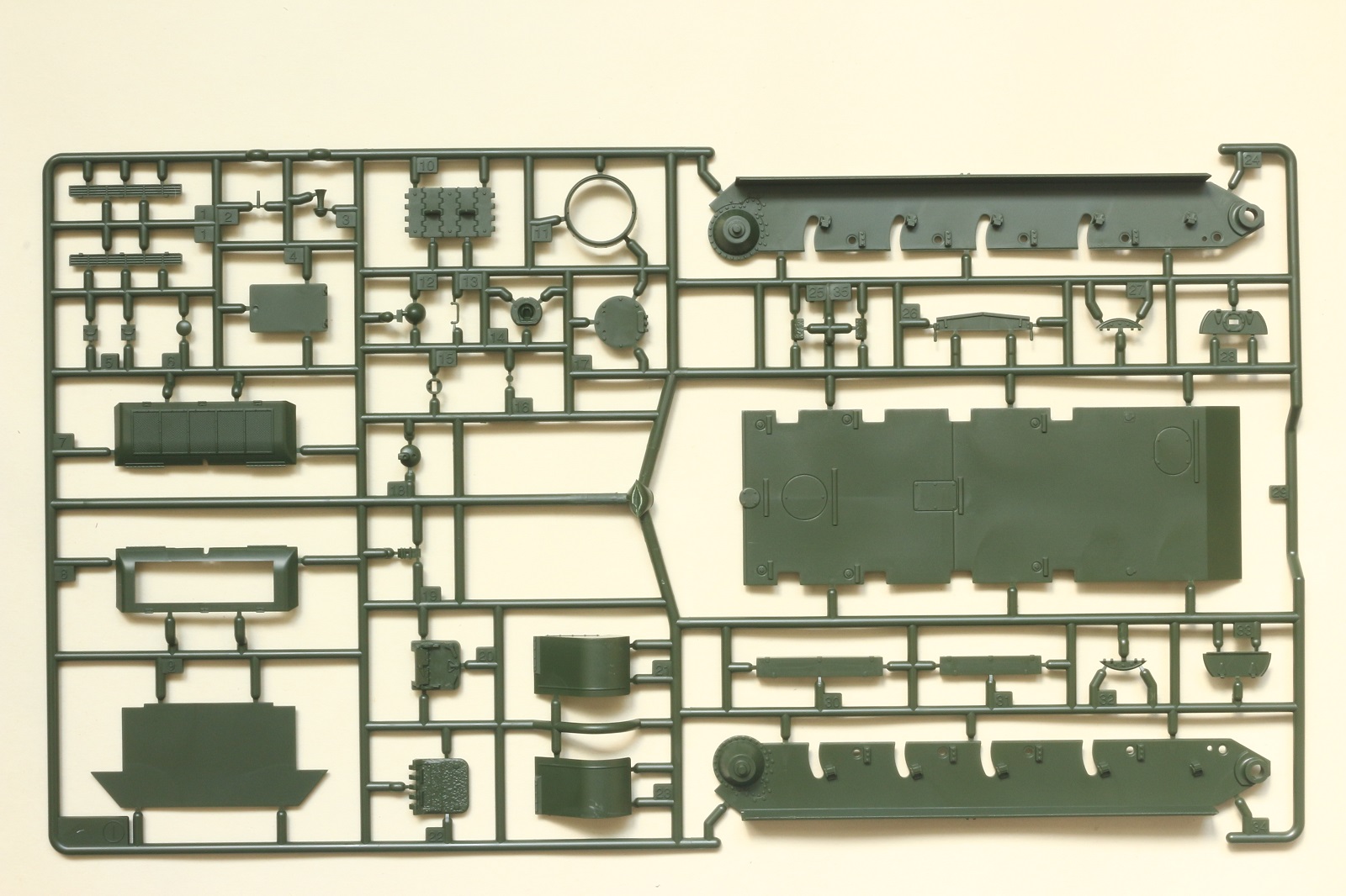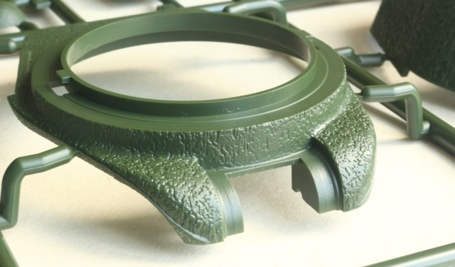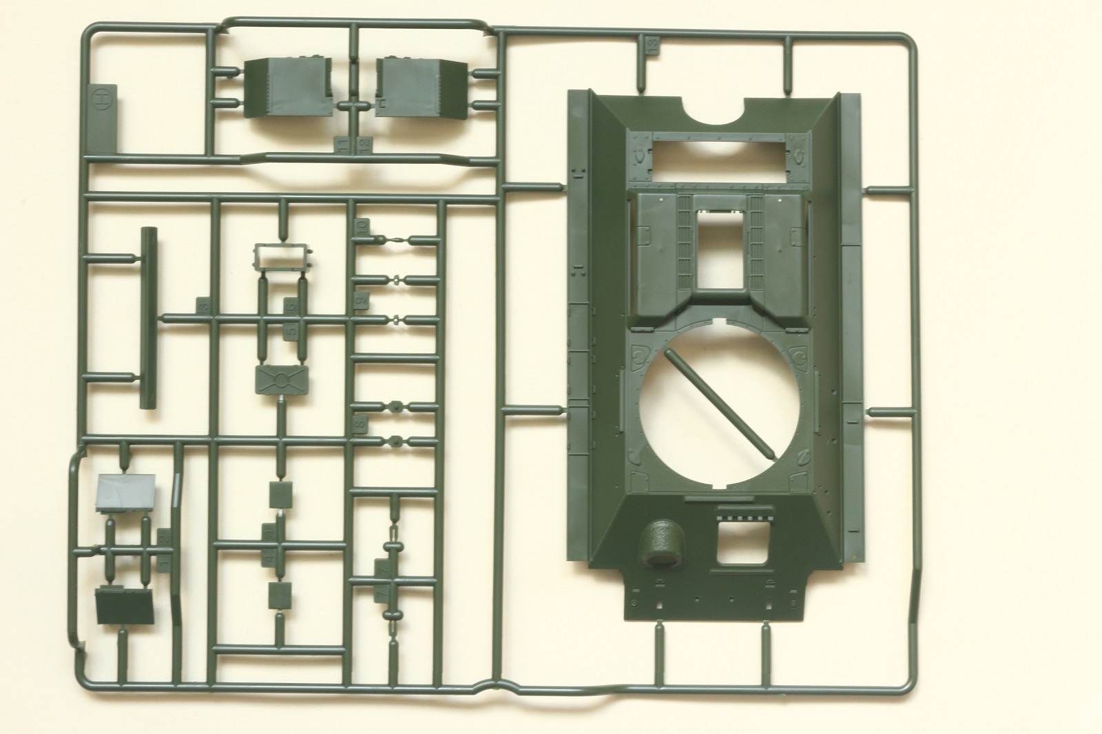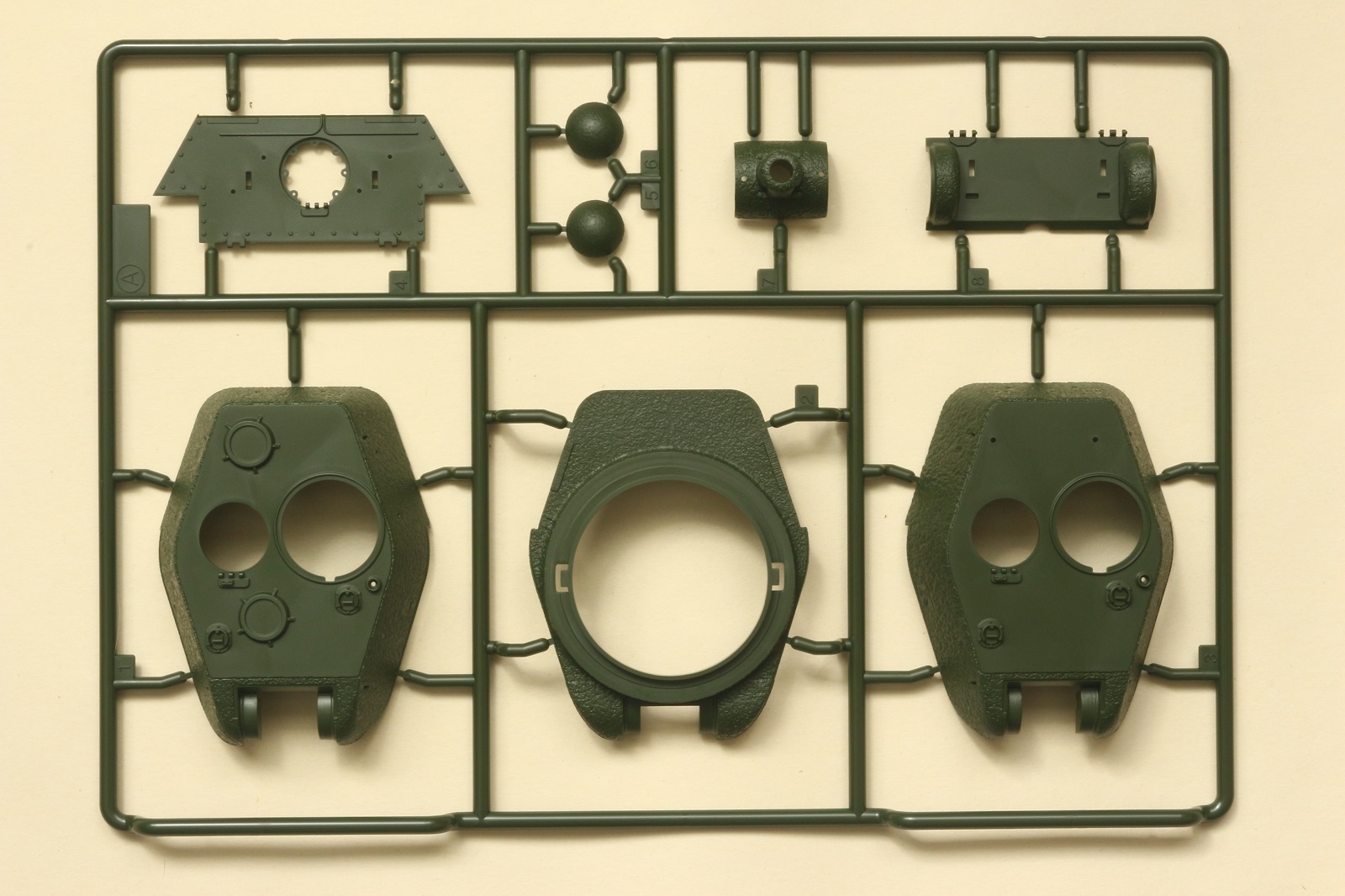 Визуально набор выглядит отлично, нет утяжин и облоя, смещений пресс-форм не видно. Даны два варианта башни, два варианта крышки вентиляции на МТО с сеткой и без, для установки травления и два варианта передних брызговиков. Траки несколько простоваты и почти на каждом с внутренней стороны присутствует по два следа от толкателей. Пытаясь изобразить структуру литой брони Academy на мой вкус несколько перестаралась. Башни и маска орудия слишком щербатые, придётся зашлифовывать. Все люки возможно сделать открытыми. Ствол отлит одной деталью.