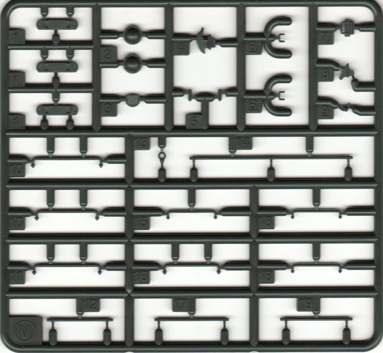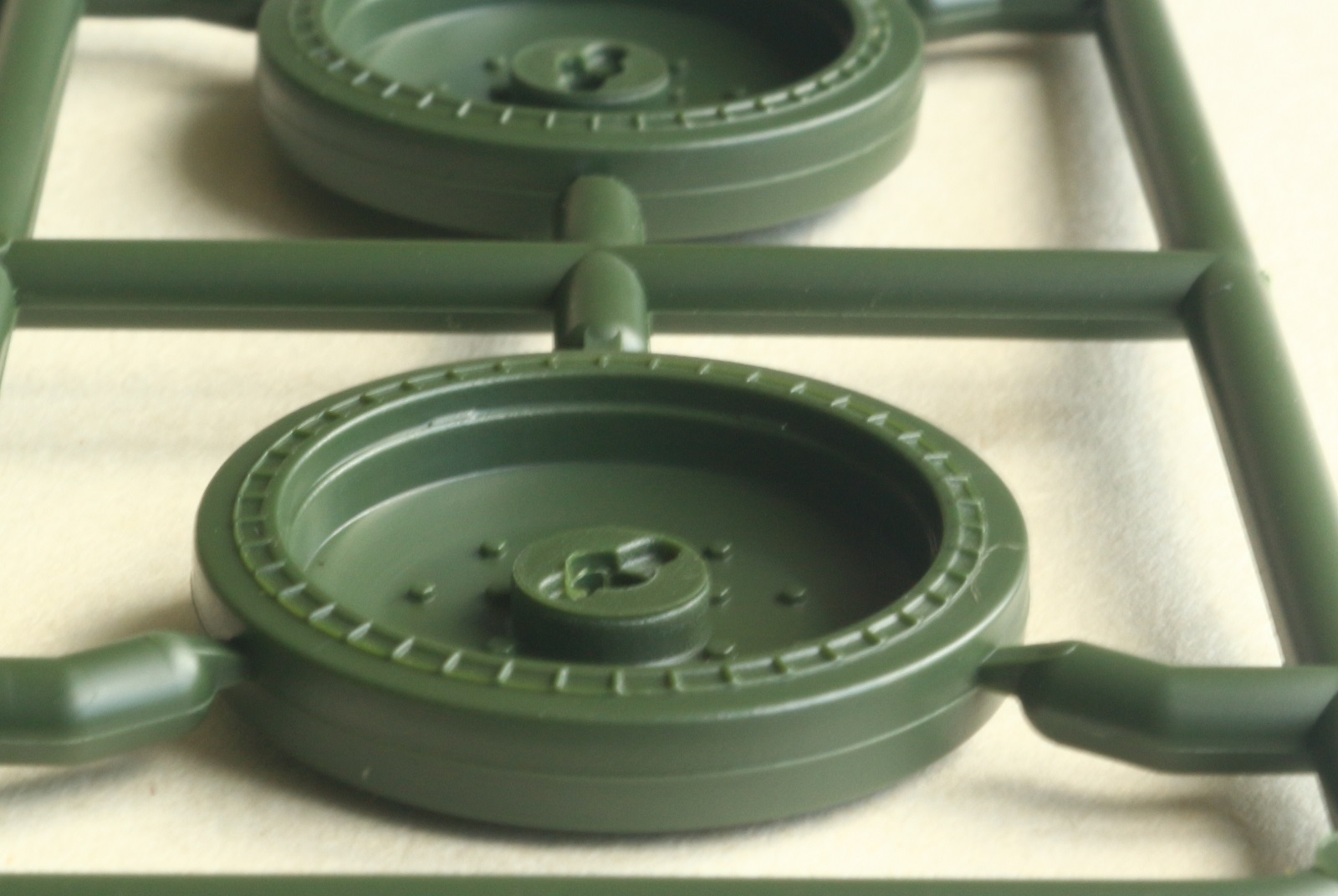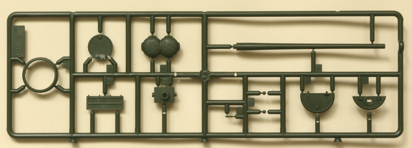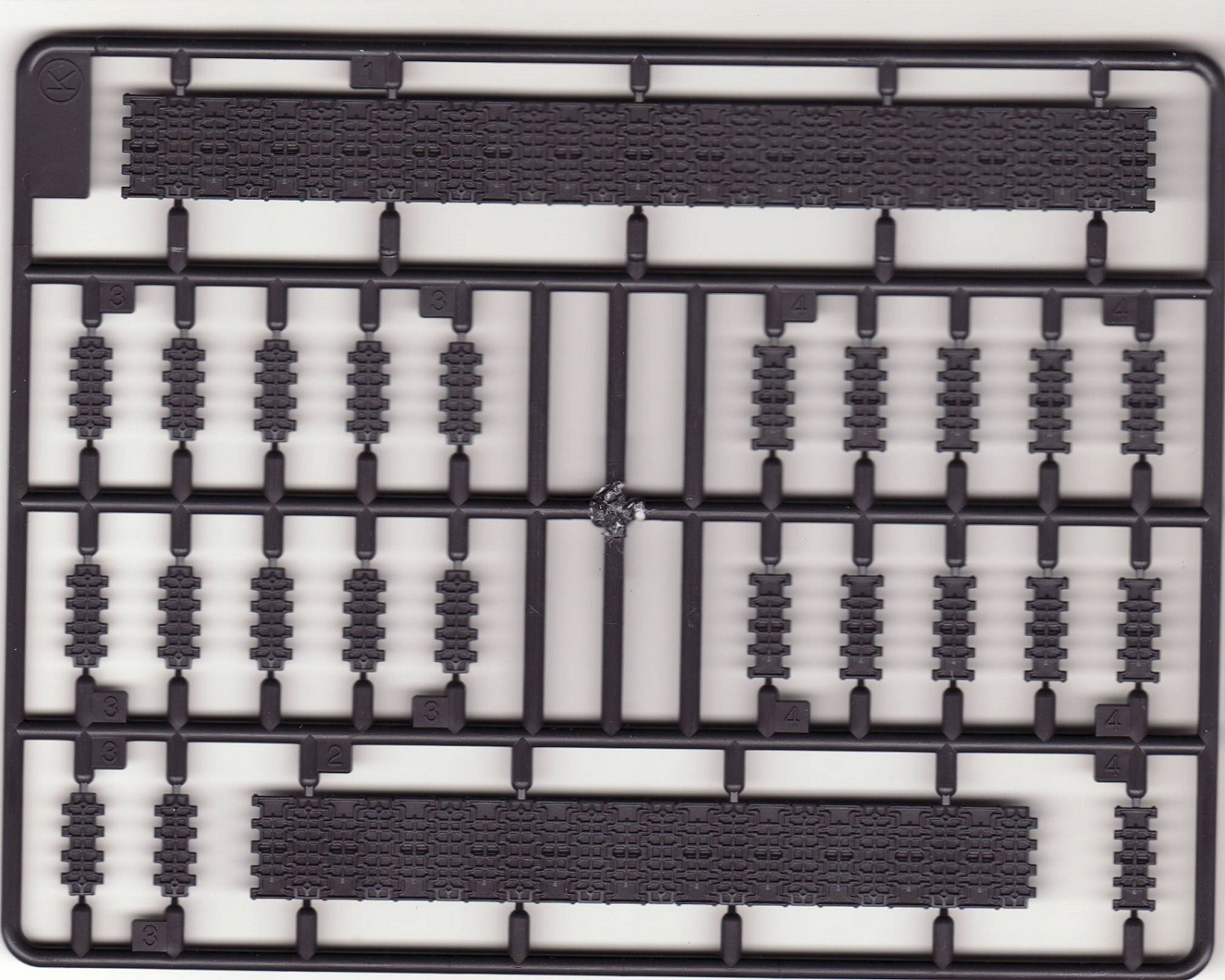 Визуально набор выглядит отлично, нет утяжин и облоя, смещений пресс-форм не видно. Даны два варианта башни, два варианта крышки вентиляции на МТО с сеткой и без, для установки травления и два варианта передних брызговиков. Траки несколько простоваты и почти на каждом с внутренней стороны присутствует по два следа от толкателей. Пытаясь изобразить структуру литой брони Academy на мой вкус несколько перестаралась. Башни и маска орудия слишком щербатые, придётся зашлифовывать. Все люки возможно сделать открытыми. Ствол отлит одной деталью.