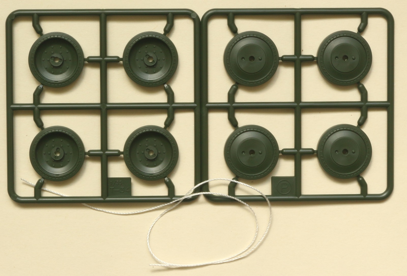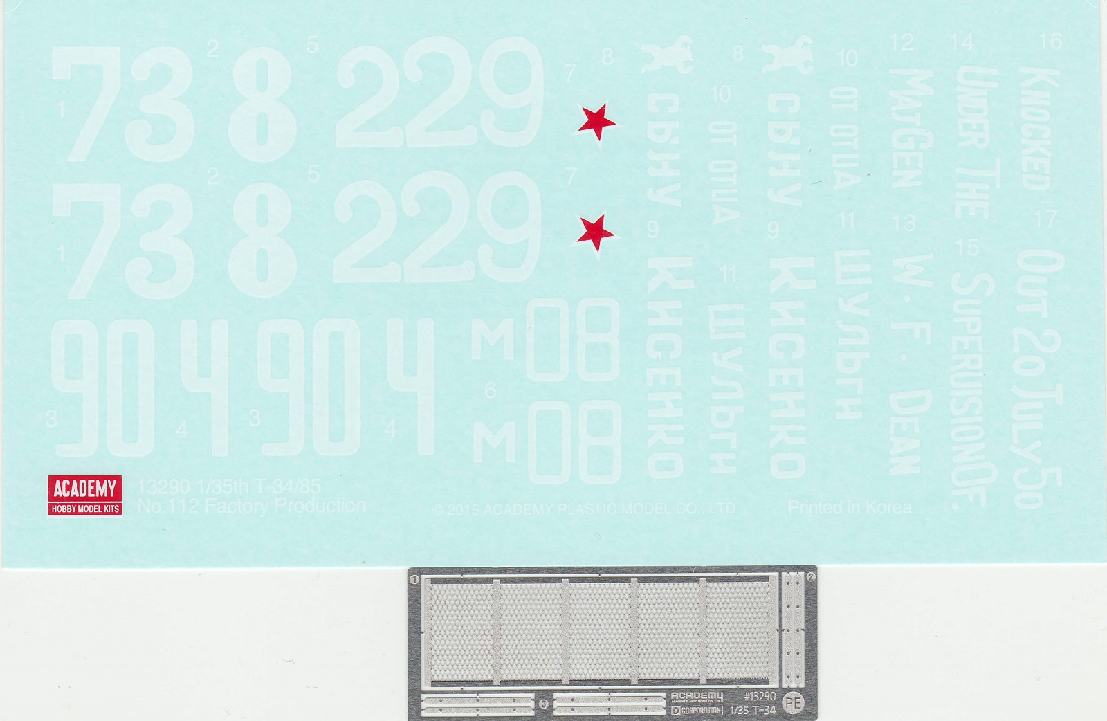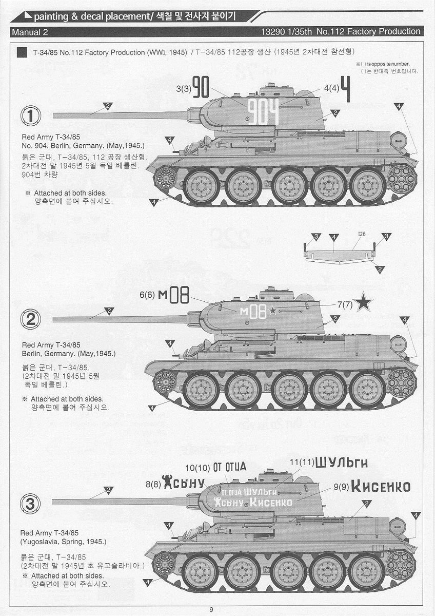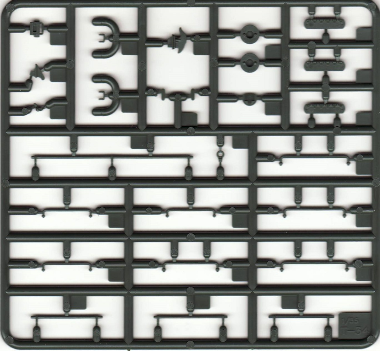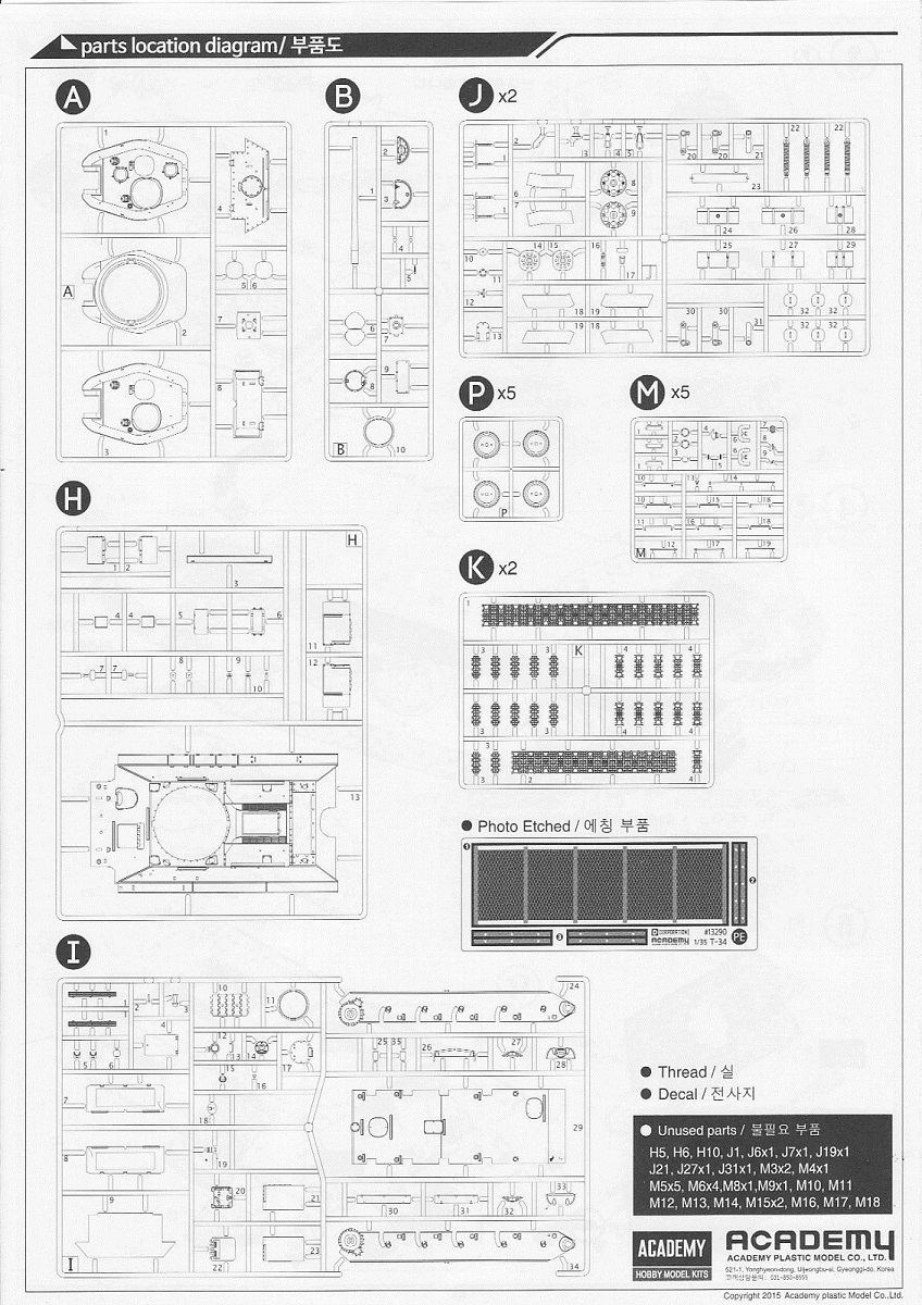 В набор входит 6 литников с деталями самого танка, 5 литников с катками и 5 литников со всякой мелочёвкой типа крюков, перископов и т.д. плюс 2 литника с полунаборными траками и 30см отрезок нити. Так же лист декалей на 6 вариантов – три на 1945 год и три на корейскую войну и маленькая плата травления с сеткой МТО. Все литники кроме траков тёмно-зелёного цвета, траки чёрного. Инструкция по сборке чёрно-белая на четырёх листах плюс один лист со схемами окраски и нанесения декалей.