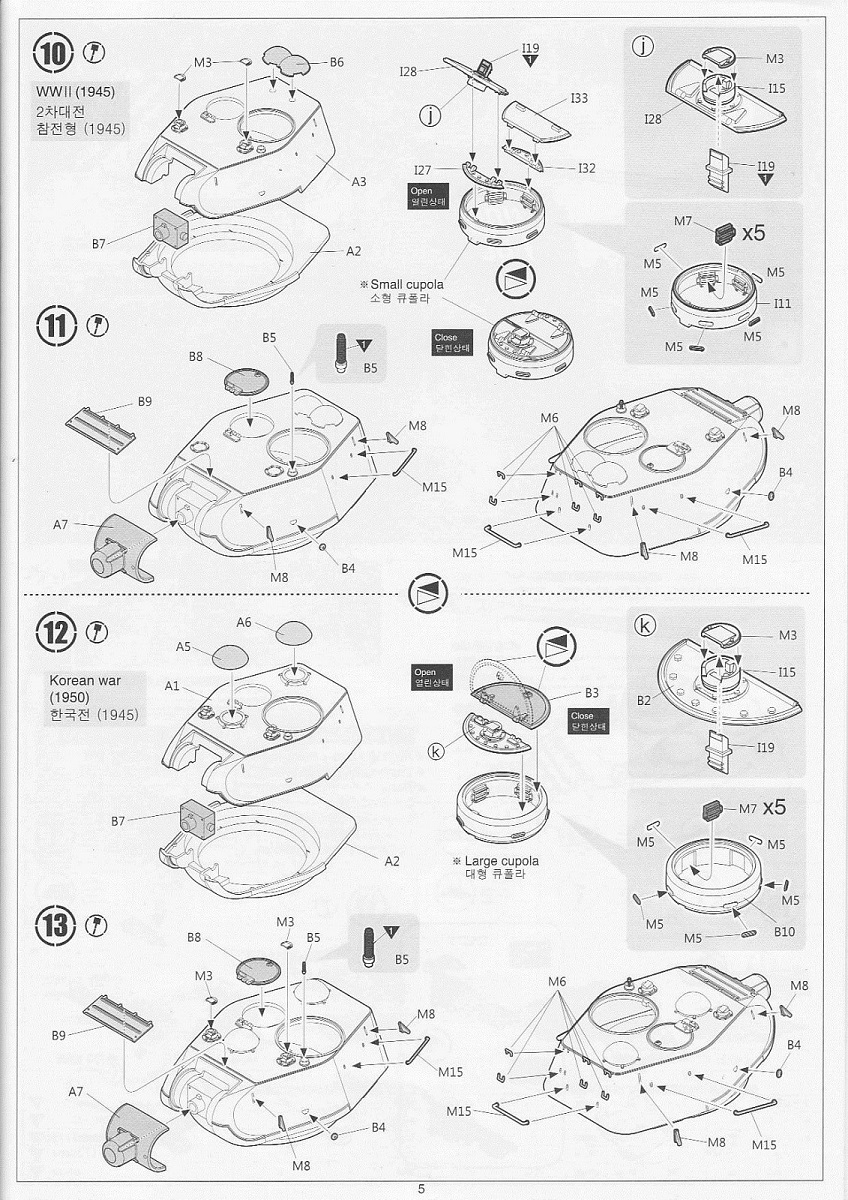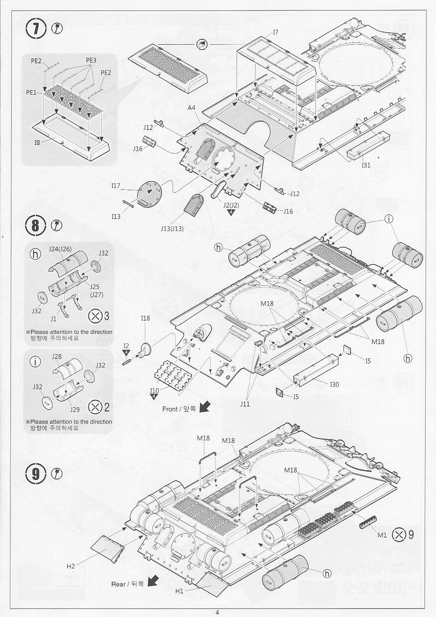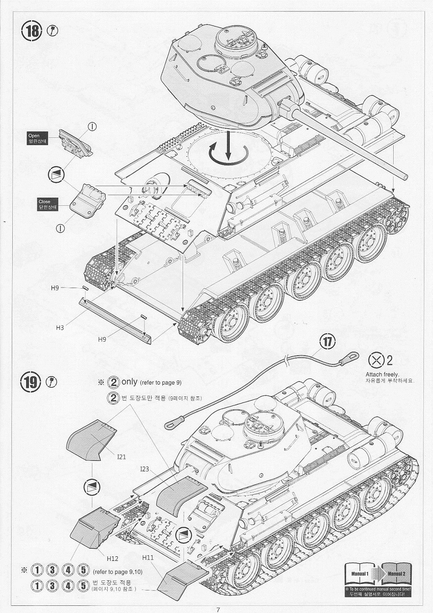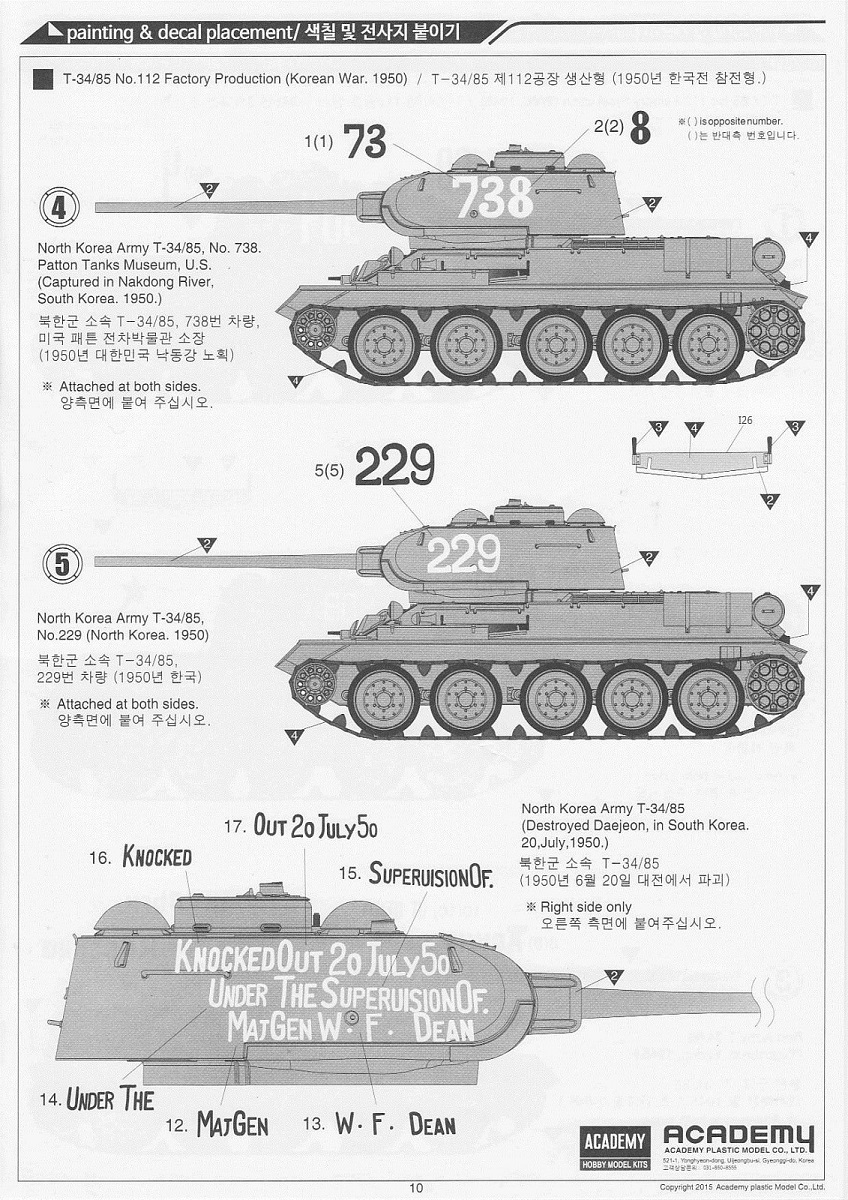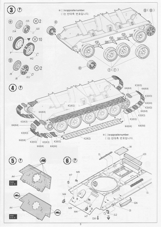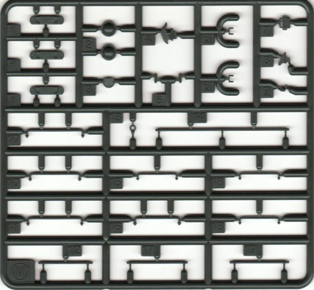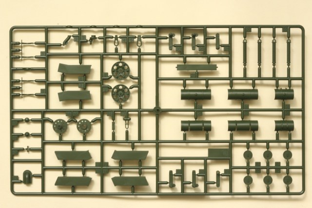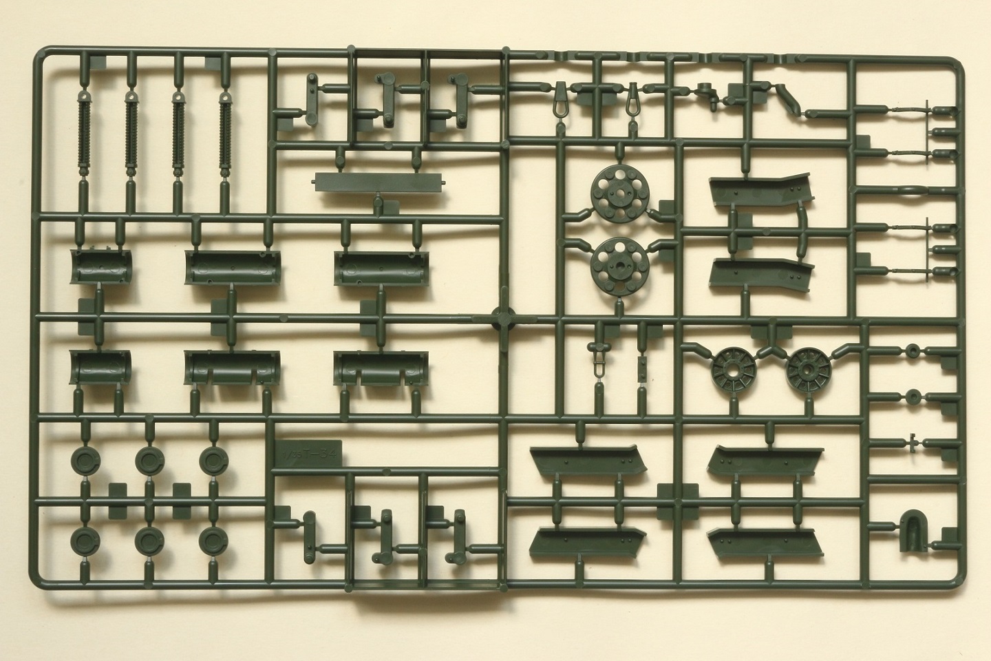 В набор входит 6 литников с деталями самого танка, 5 литников с катками и 5 литников со всякой мелочёвкой типа крюков, перископов и т.д. плюс 2 литника с полунаборными траками и 30см отрезок нити. Так же лист декалей на 6 вариантов – три на 1945 год и три на корейскую войну и маленькая плата травления с сеткой МТО. Все литники кроме траков тёмно-зелёного цвета, траки чёрного. Инструкция по сборке чёрно-белая на четырёх листах плюс один лист со схемами окраски и нанесения декалей.