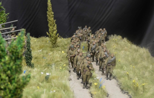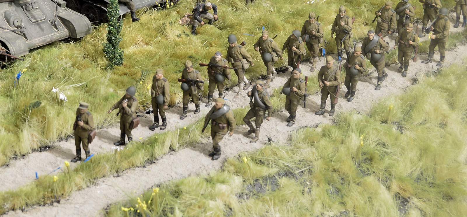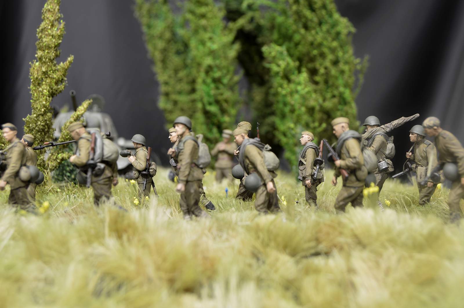 Не скажу что не круто - пипец как круто и грандиозно. Немного напрягает линейность композиций, ну хотя бы изгиб дороги сделать. Фигурки явно удались, бросился в глаза боец с ПТРД, ну вдвоём её обычно на марше носили - тяжёлая ведь.