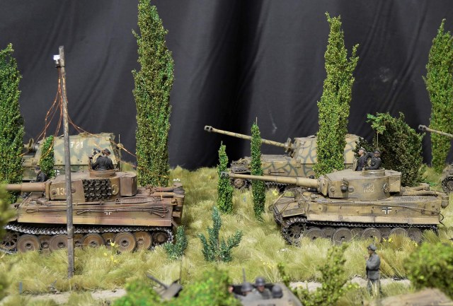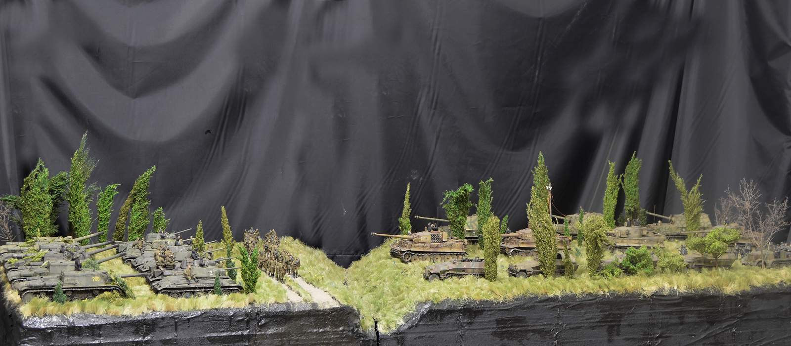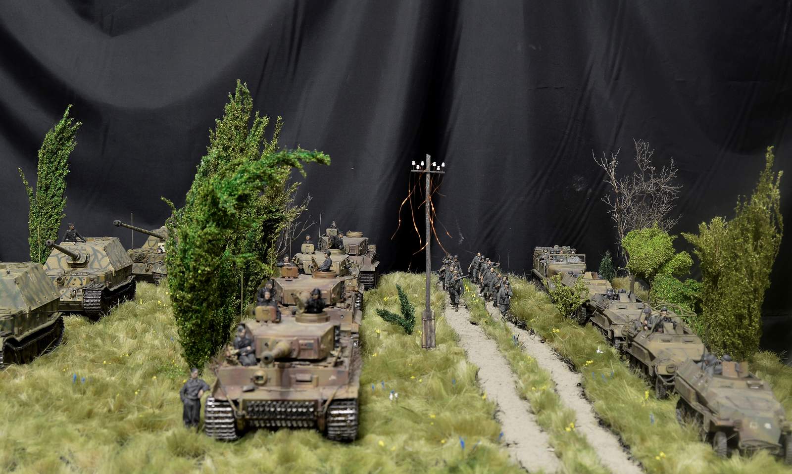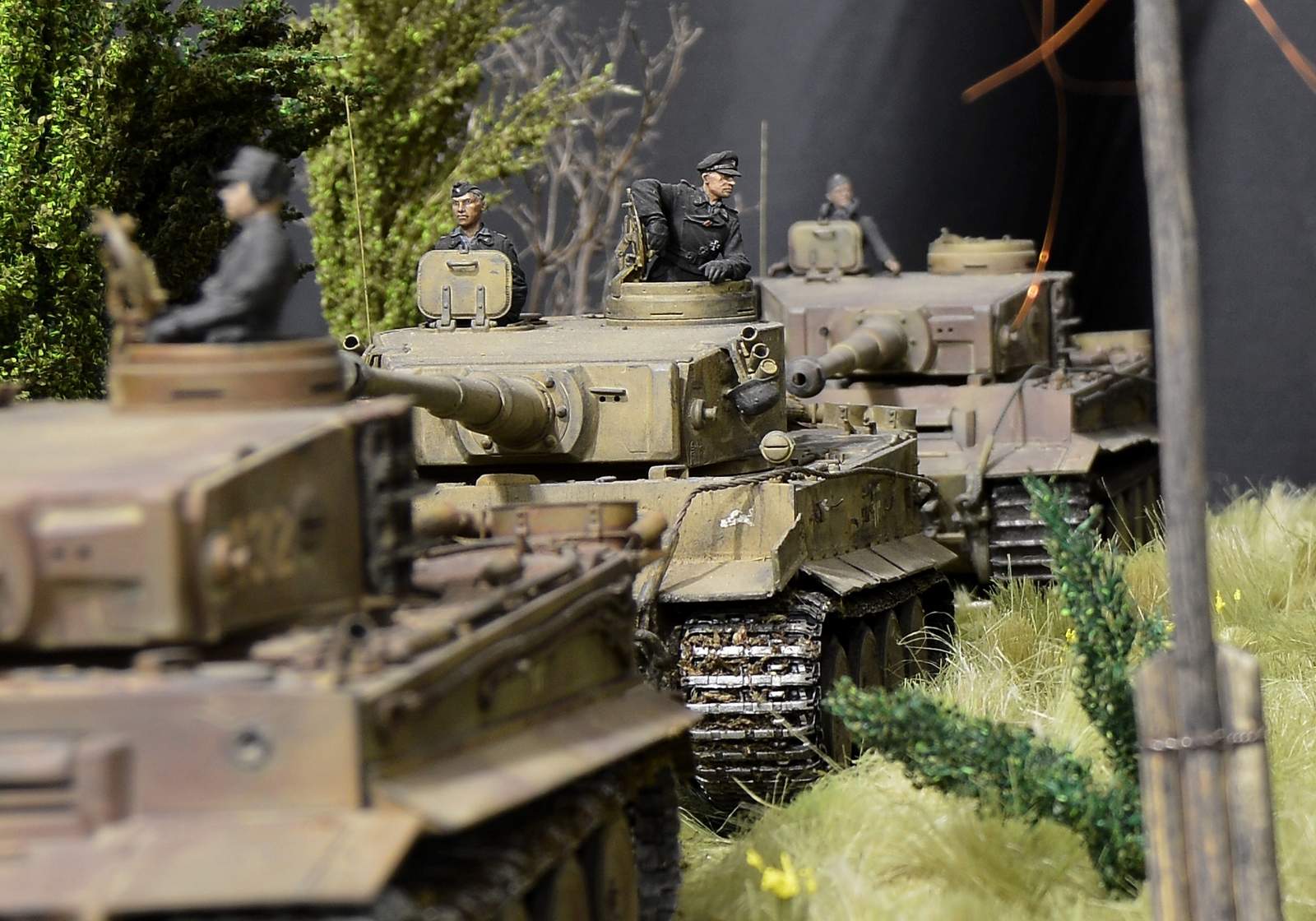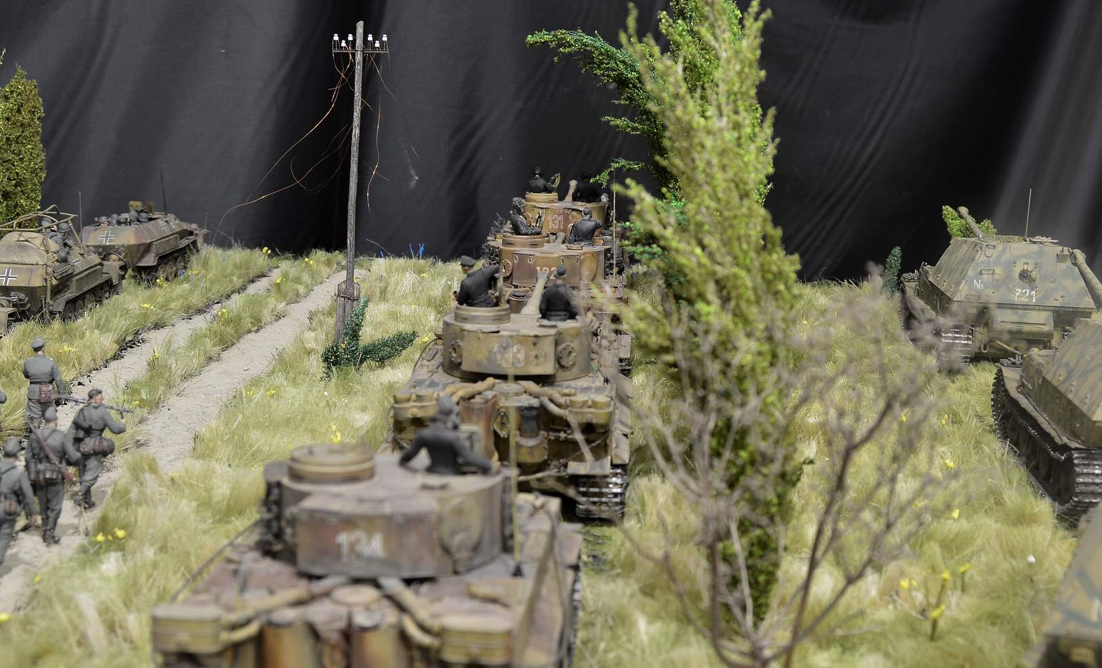 Представляю диораму по Великой Отечественной Войне. События диорамы – самое начало операции «Цитадель». По сюжету – это первое или второе июля 1943 года. До начала операции совсем немного, немцы и советские войска на исходных позициях. Все знают, когда всё начнётся. Из истории: 505-й батальон тяжёлых танков действовал вместе с 654-м противотанковым батальоном САУ. По диораме, чтобы было понятно: овраг – это виртуальная линия фронта. Каждая сторона на отдалении в несколько километров. Первое и последнее фото – это диорама в целом.