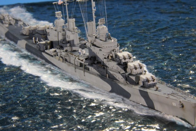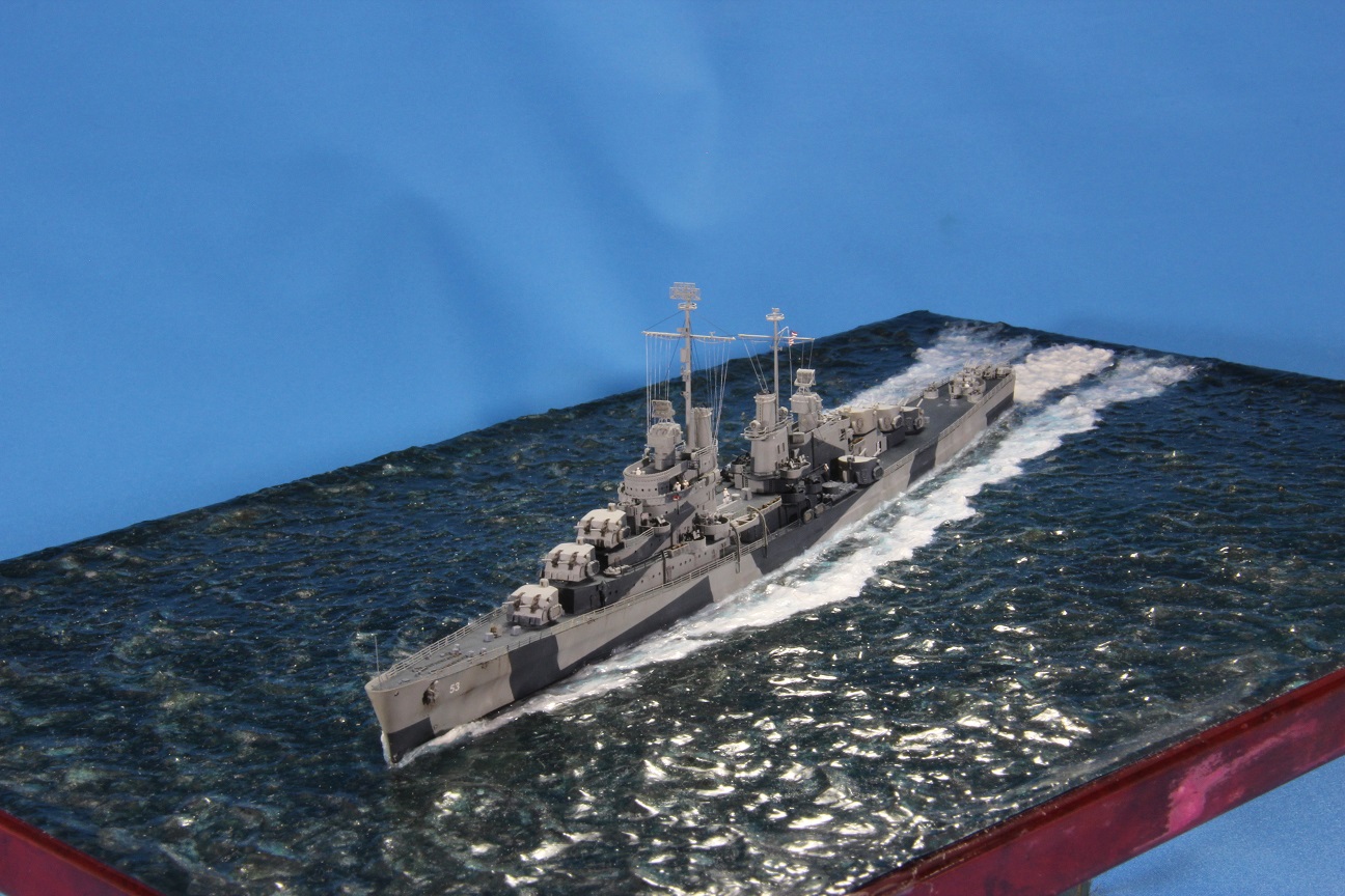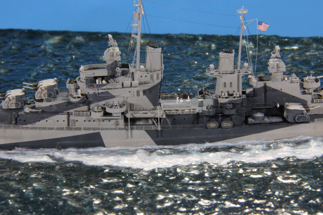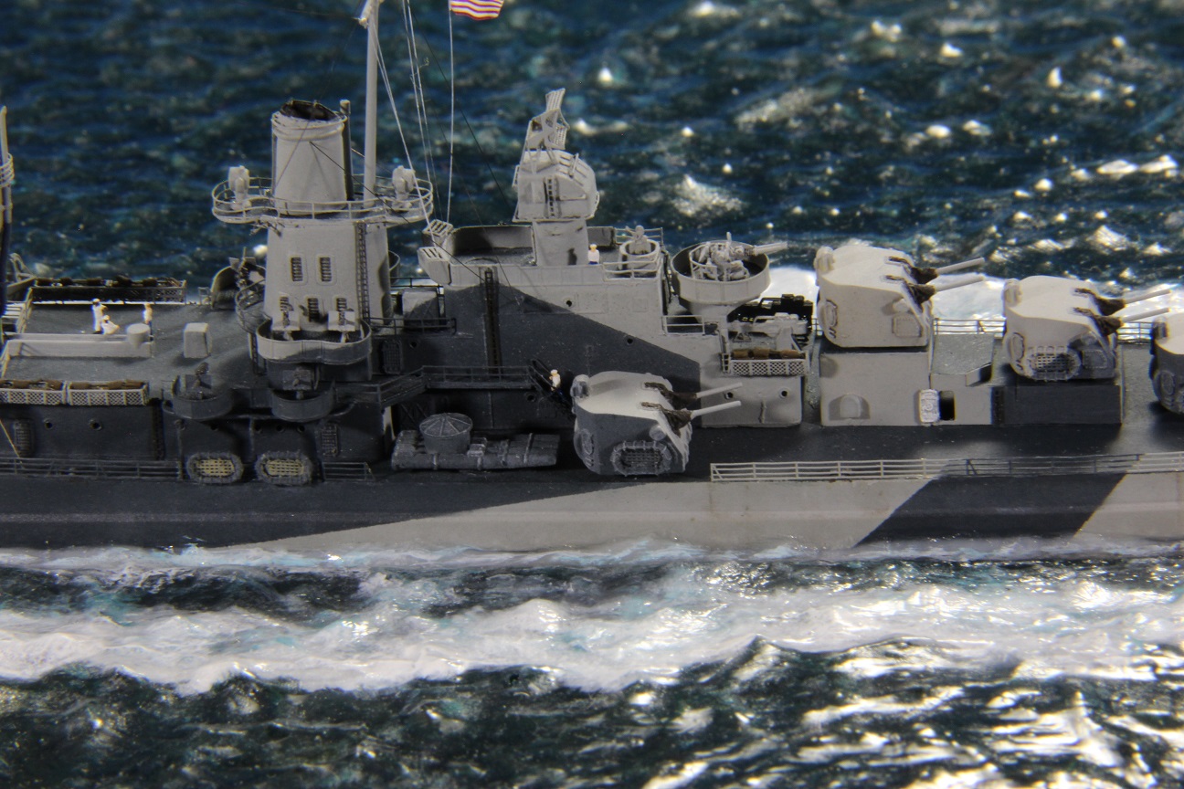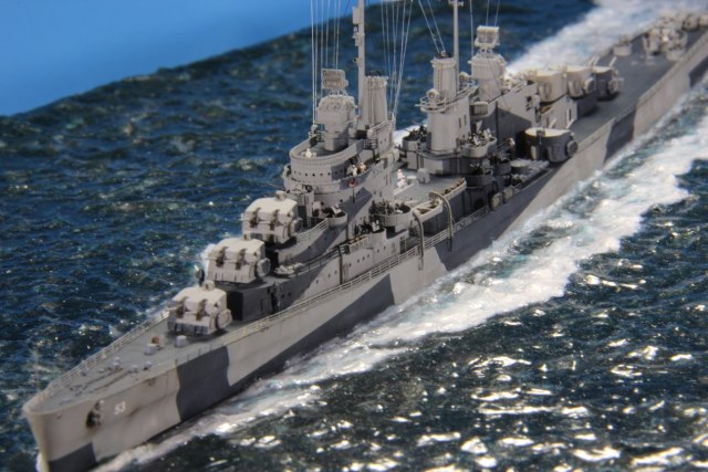 Честно пытался найти еще какие-нибудь косяки по окраске, но корабль в остальном покрашен совершенно правильно (не так, как предписывала схема камуфляжа для этих крейсеров http://www.shipcamouflage.com/DesignSheets/M33_24D_CL-51.jpg а так, как было на самом деле: http://www.navsource.org/archives/04/053/0405318.jpg ). Т.е. без нанесения камуфляжа на горизонтальные поверхности.