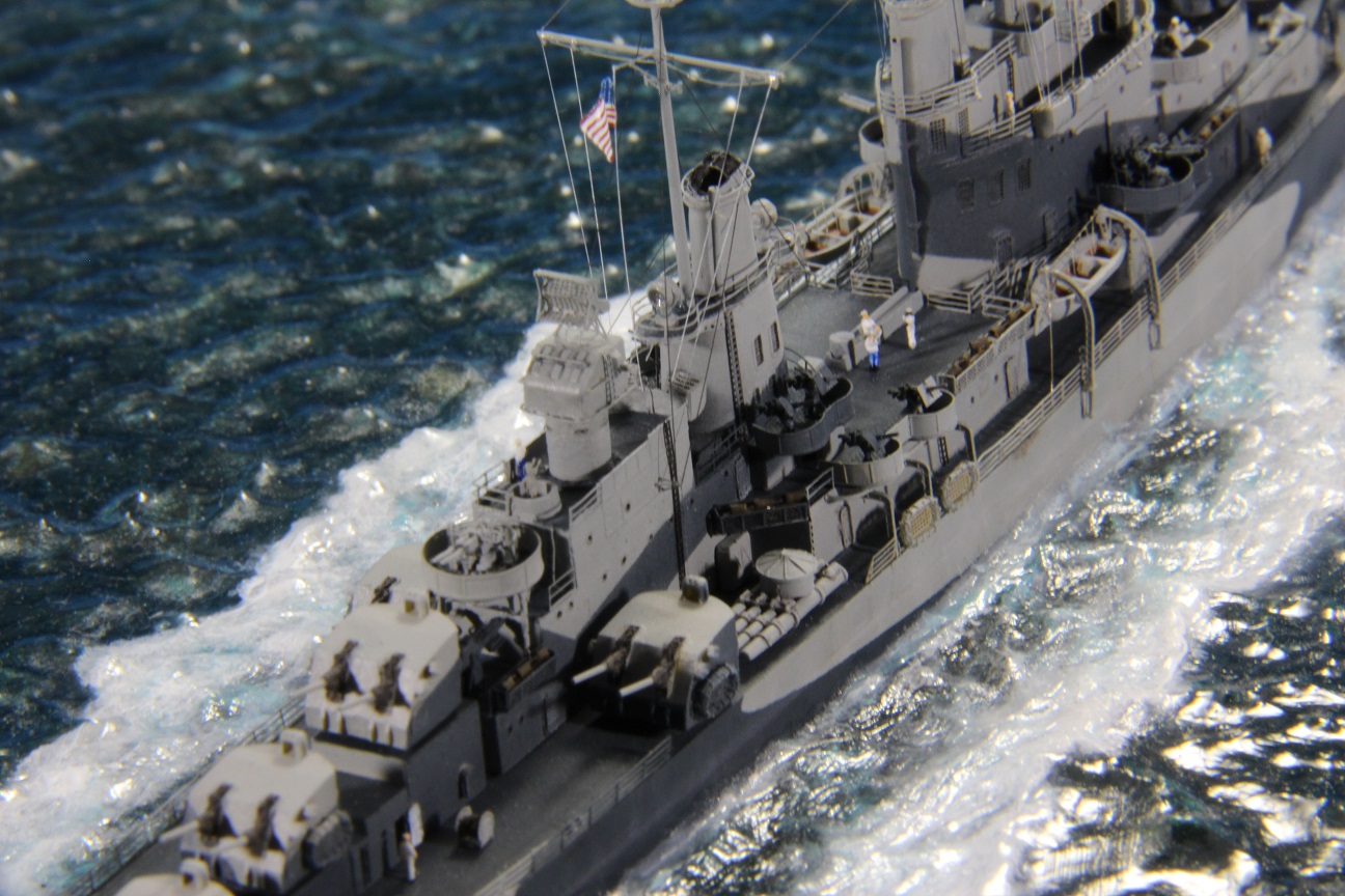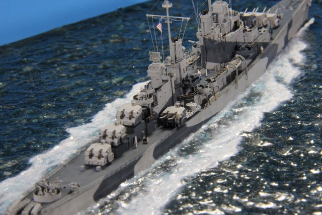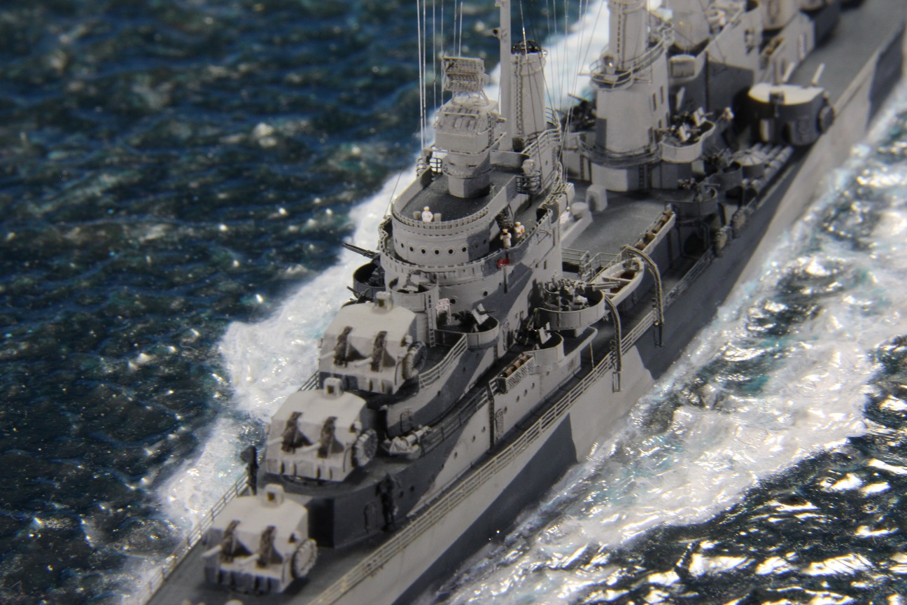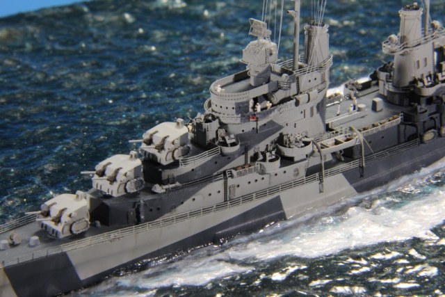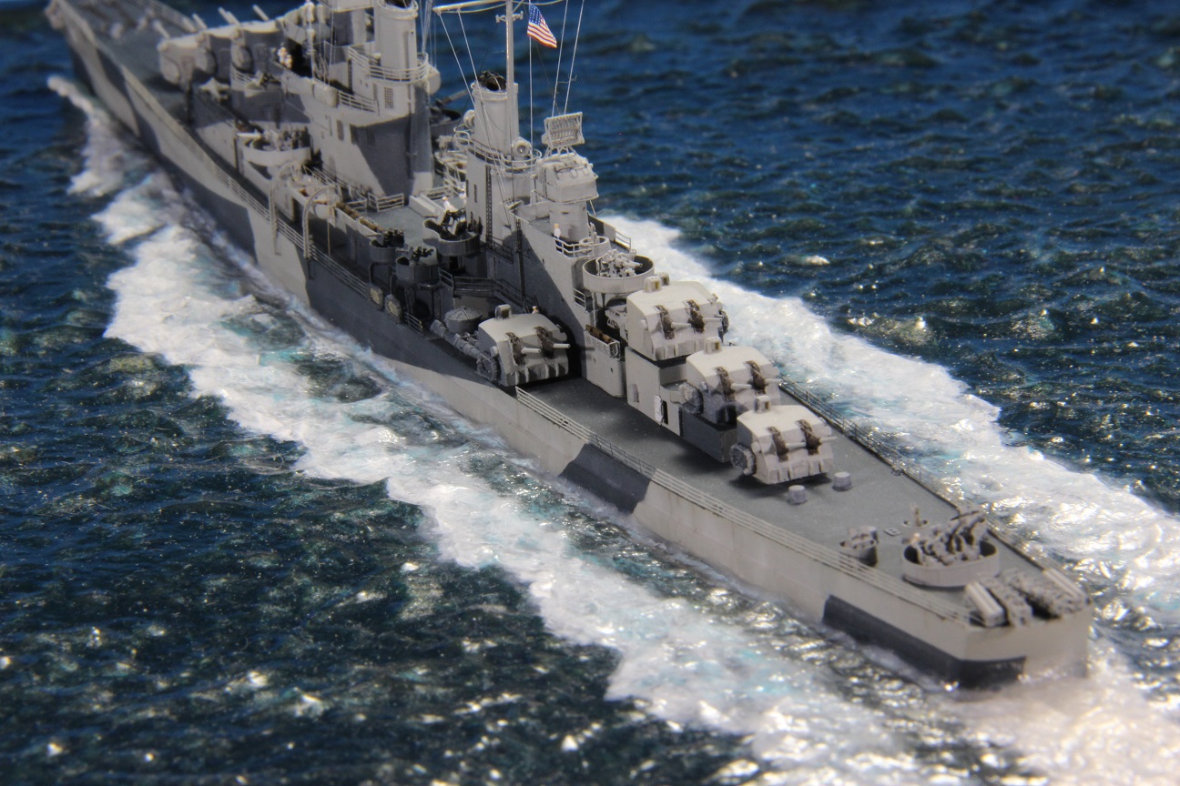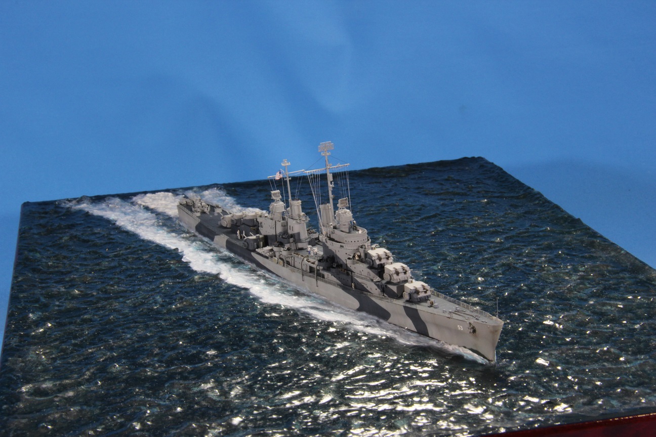 Честно пытался найти еще какие-нибудь косяки по окраске, но корабль в остальном покрашен совершенно правильно (не так, как предписывала схема камуфляжа для этих крейсеров http://www.shipcamouflage.com/DesignSheets/M33_24D_CL-51.jpg а так, как было на самом деле: http://www.navsource.org/archives/04/053/0405318.jpg ). Т.е. без нанесения камуфляжа на горизонтальные поверхности.