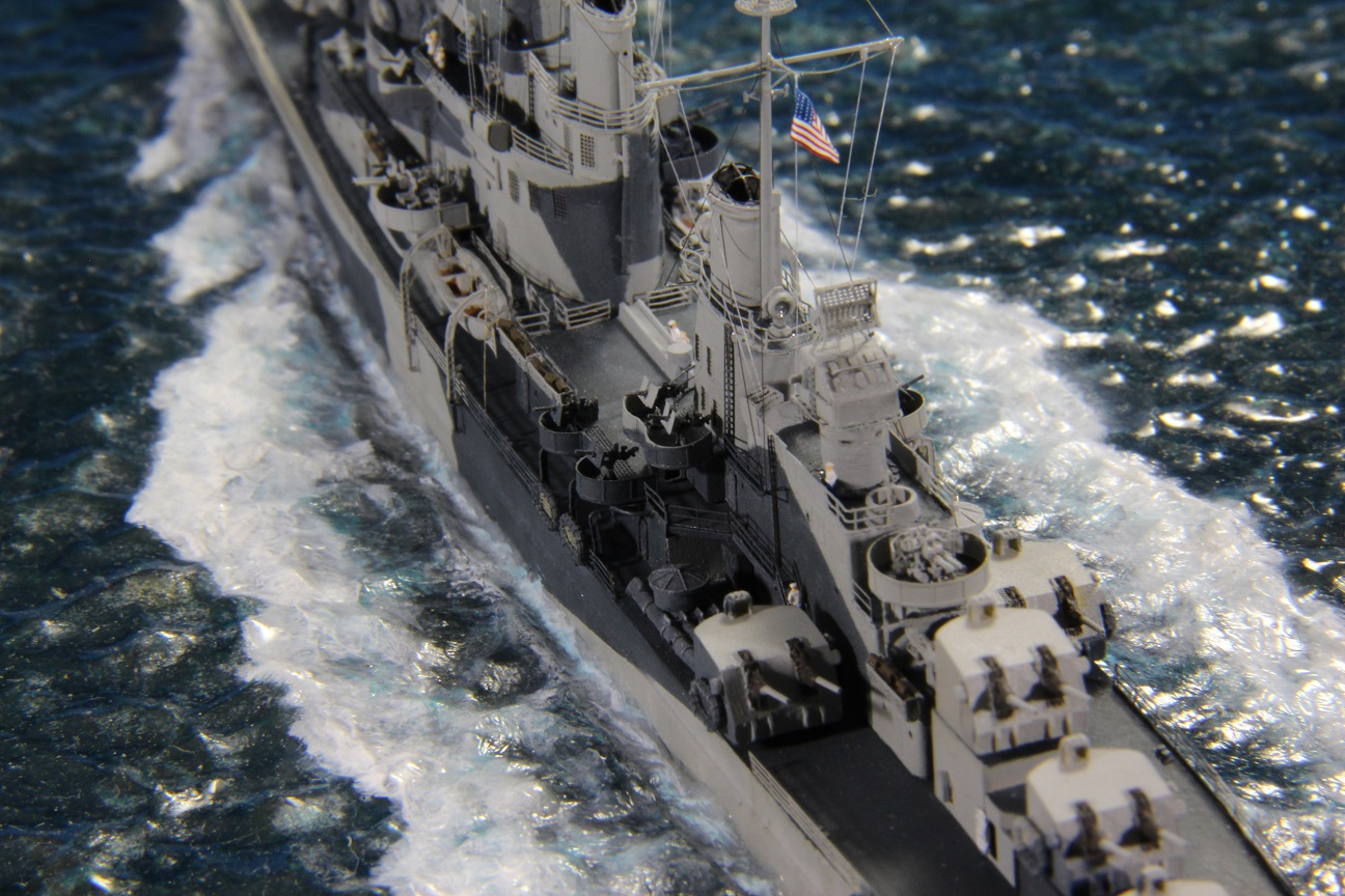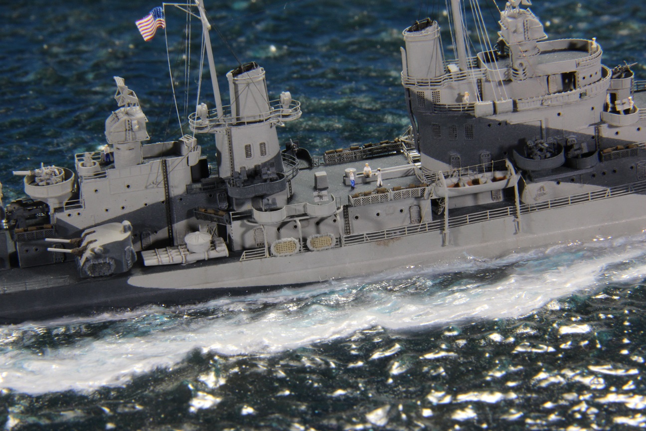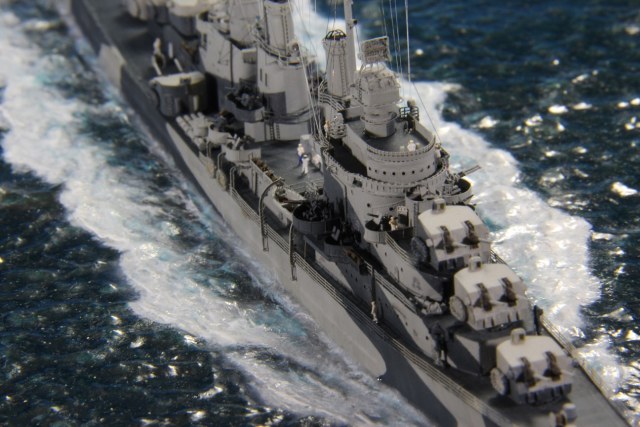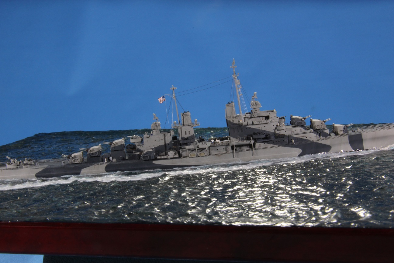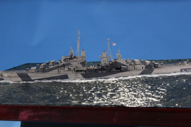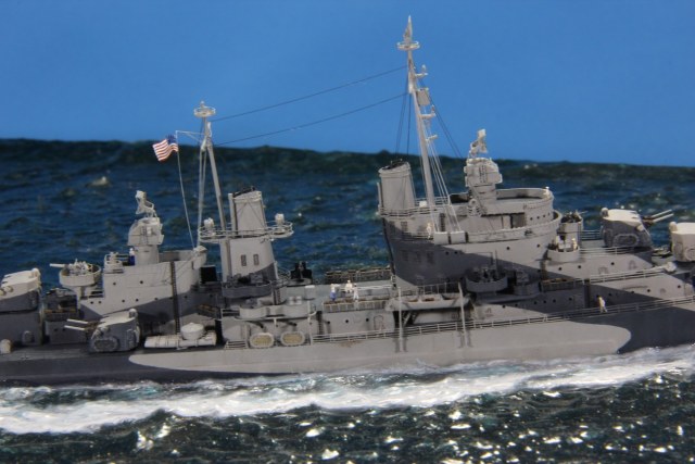 Честно пытался найти еще какие-нибудь косяки по окраске, но корабль в остальном покрашен совершенно правильно (не так, как предписывала схема камуфляжа для этих крейсеров http://www.shipcamouflage.com/DesignSheets/M33_24D_CL-51.jpg а так, как было на самом деле: http://www.navsource.org/archives/04/053/0405318.jpg ). Т.е. без нанесения камуфляжа на горизонтальные поверхности.