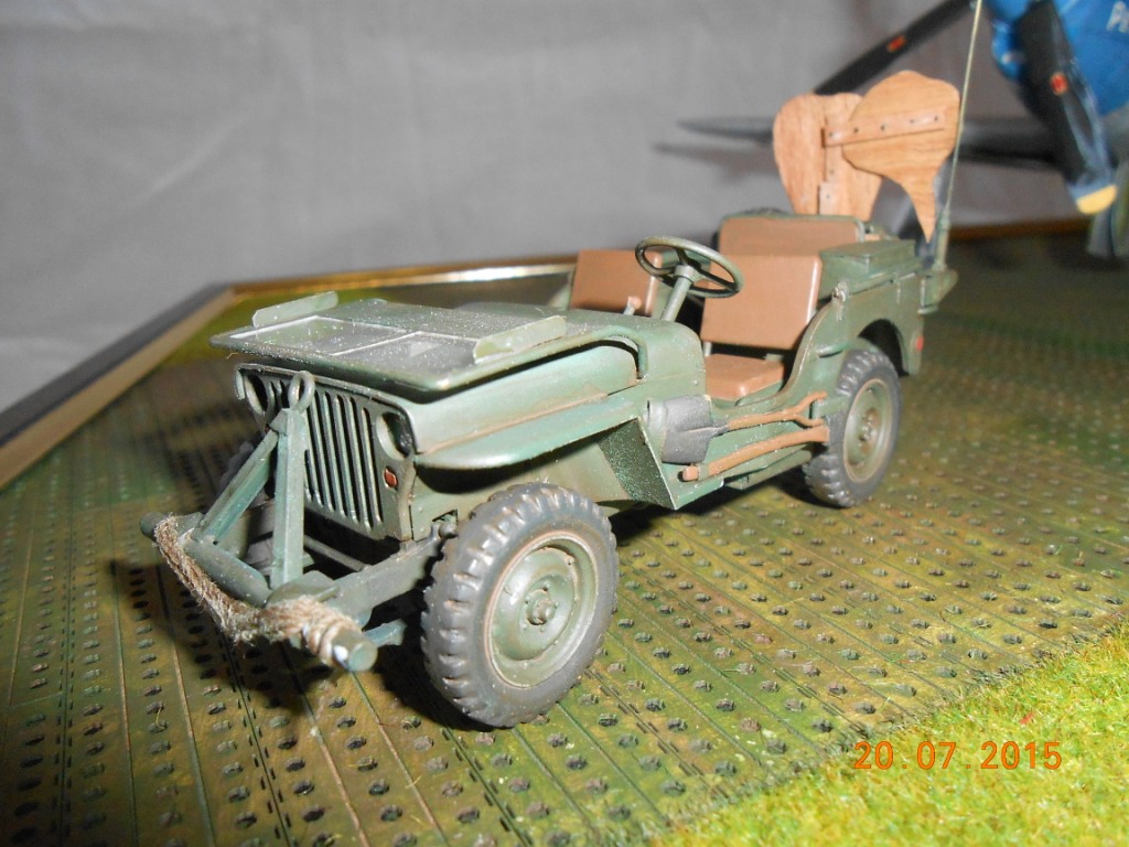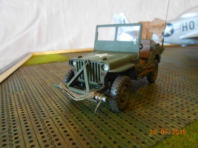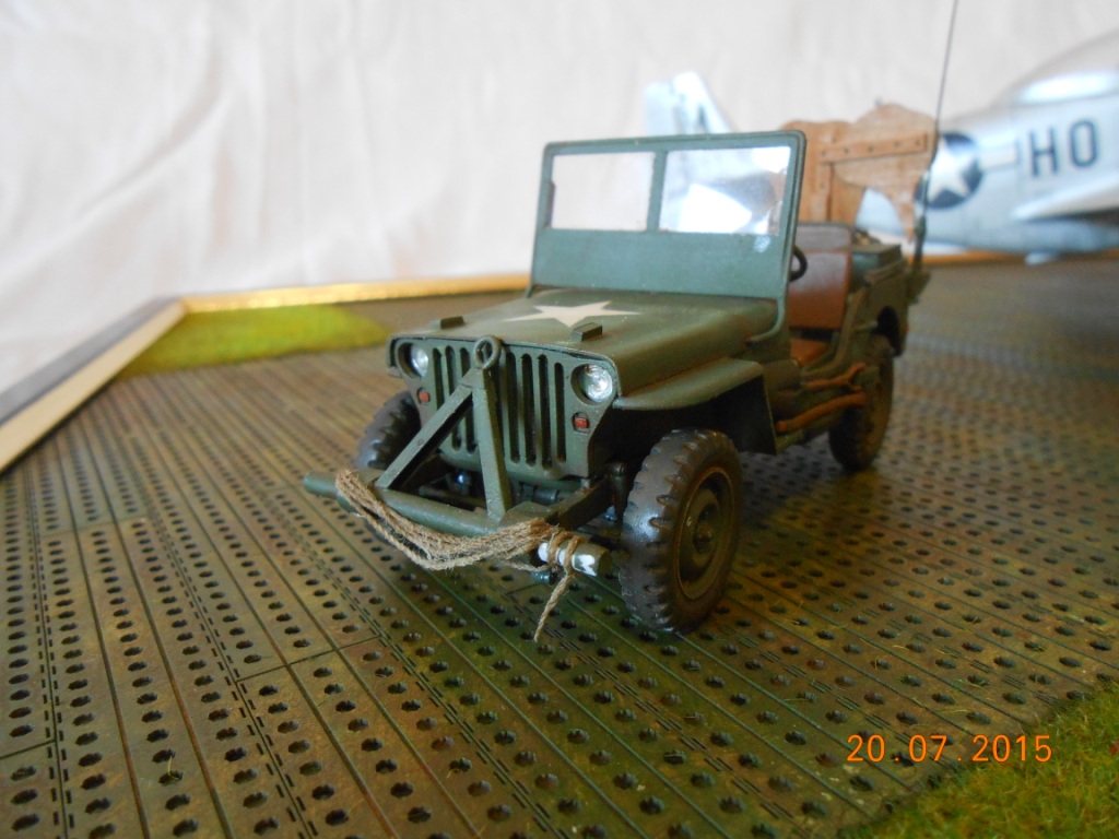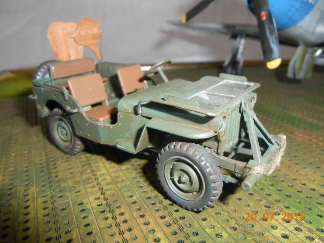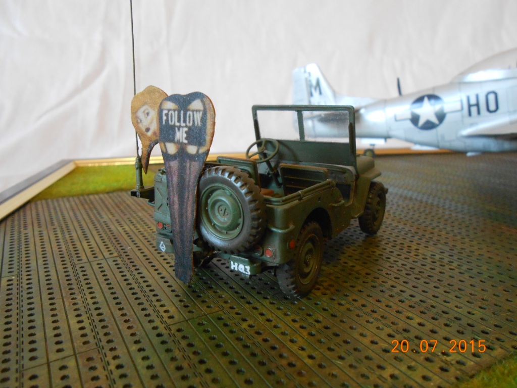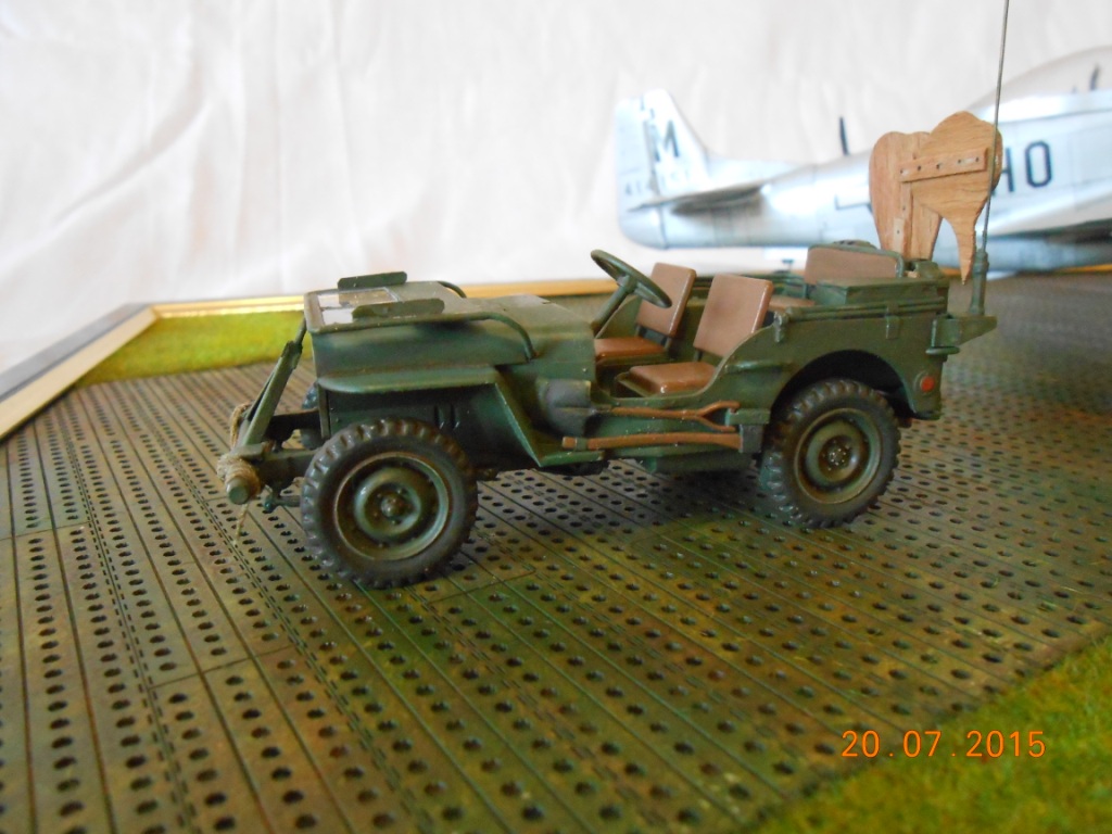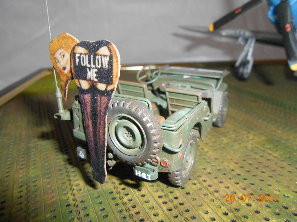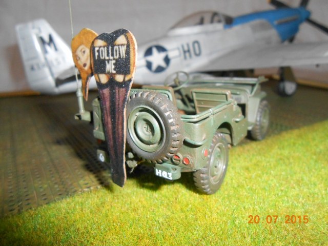 доброго дня. давно у меня зрела идея собрать модель виллиса. к тому же на просторах интернета я наткнулся на весьма примечательное фото. так как я чаще собираю модели авиации в 1:33, решил сделать именно такой - автомобиль аэродромных служб США. в загашничке валялся подаренный виллис английских САС от италери, который подвергся незначительным переделкам. "даму" распечатал на принтере и присобачил на кусок шпона, имитирующий фанерную основу "картины". я не претендую на большую "копийность" и "историчность" модели. виллиса собрал в первую очередь для души и "по приколу", и как дополнение к своим самолетам.