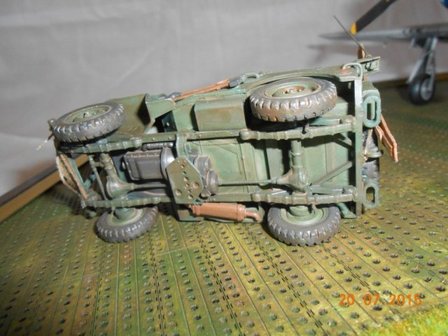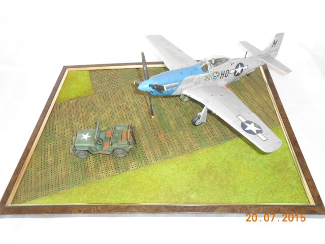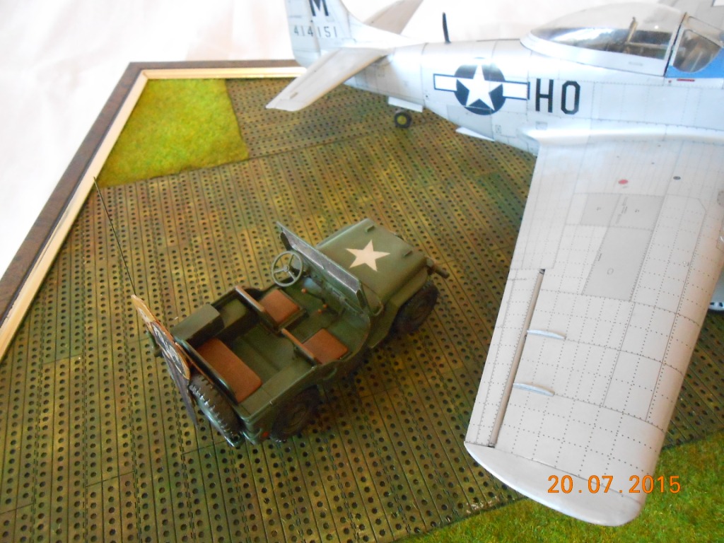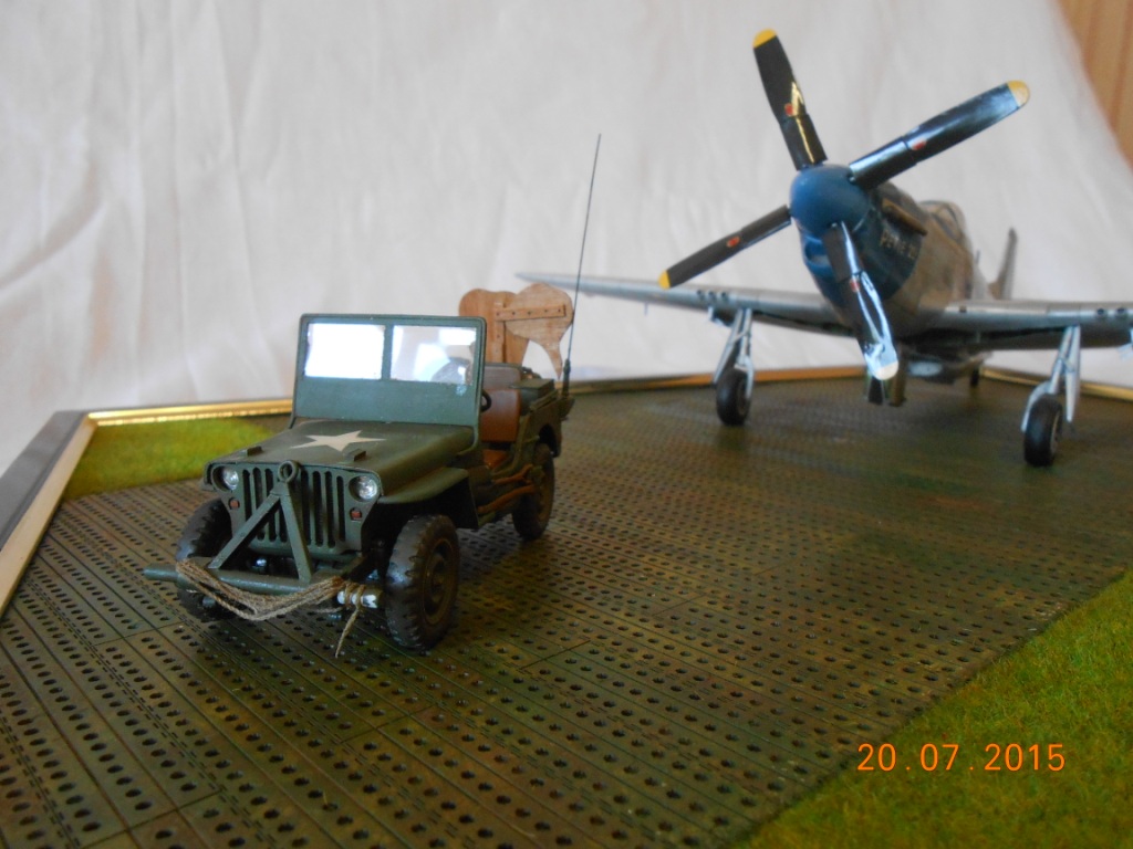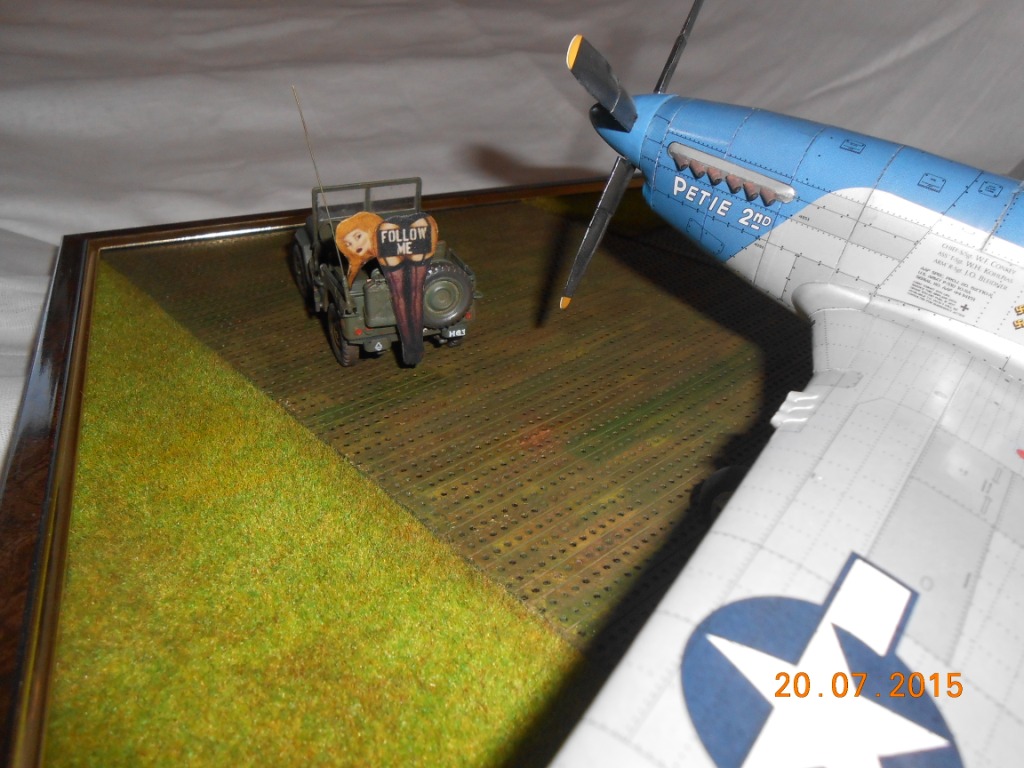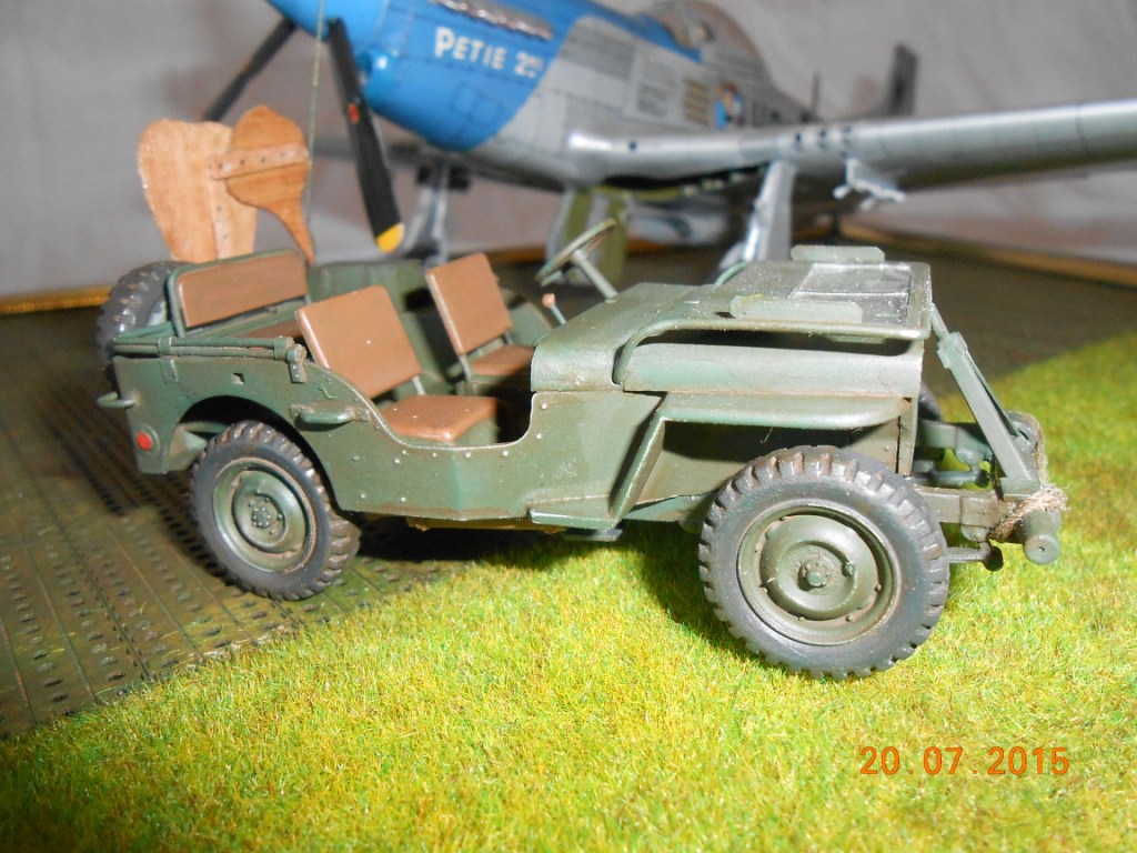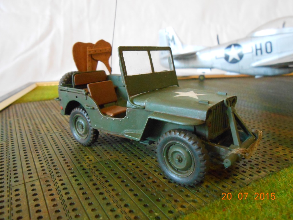 доброго дня. давно у меня зрела идея собрать модель виллиса. к тому же на просторах интернета я наткнулся на весьма примечательное фото. так как я чаще собираю модели авиации в 1:33, решил сделать именно такой - автомобиль аэродромных служб США. в загашничке валялся подаренный виллис английских САС от италери, который подвергся незначительным переделкам. "даму" распечатал на принтере и присобачил на кусок шпона, имитирующий фанерную основу "картины". я не претендую на большую "копийность" и "историчность" модели. виллиса собрал в первую очередь для души и "по приколу", и как дополнение к своим самолетам.