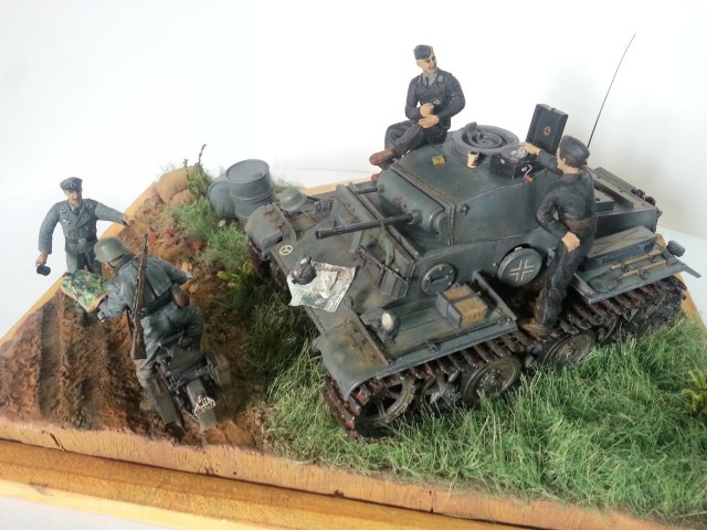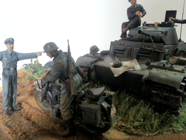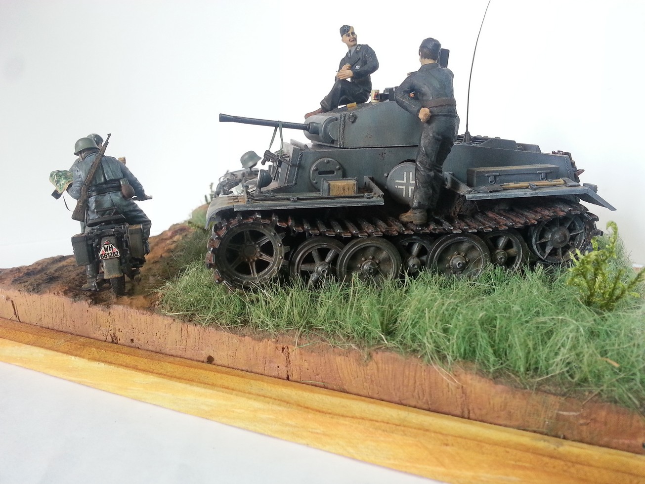 Вот, закончил, наконец, свой (по моим меркам) долгострой. Сюжет придумывал по ходу дела и "притягивал за уши", поэтому, даже названия толкового в голову не пришло (. Танк почти из коробки. Заменил ствол пушки на самодельный (искоробочный - почти квадратного сечения). Пулемет заменил тоже. Передние крылья из жести. Переделал "задницу" на более достоверную. Добавил сетки и жалюзи на крышки МТО, сварных швов, триплексы, проводку и оптику к фаре и заднему фонарю (стекло). Шанец - Dragon, искоробочный дубоват. Также, в коробке имелся патефончик. (Его основательно перепилил) В общем - модель неплоха, но гусянка - жесть, пилить и подгонять каждый трак. Мотоцикл от Звезды. Добавил аккумулятор, тросики и проводку к свечам. Фигуры, так сказать конверсированы из различных, производства Тамии, Звезды и старого Итала. Трава - сантехлён, основание - фоторамка и гипс, немного армированный. Карта в руке мотоциклиста, пока временная - накрылся принтер, и отпечатать пока нет возможности, куплю новый - заменю. Всякая утварь (чайник, кружки... ) - полностью самодельные. Окрас - акрил АКАН, Звезда, Revell, темпера, масло, пастель. Окрас фигур не слишком удачен (в реале, все-же лучше смотрятся...), т.к. они появляются на моих стапелях достаточно редко, соответственно, опыт развивается медленно. А он важен, даже в этом случае заметил, что лицо мотоциклиста, которого окрашивал последним, вышло уже гораздо лучше, чем у первой фигуры из этих четверых. Как-то вот так...