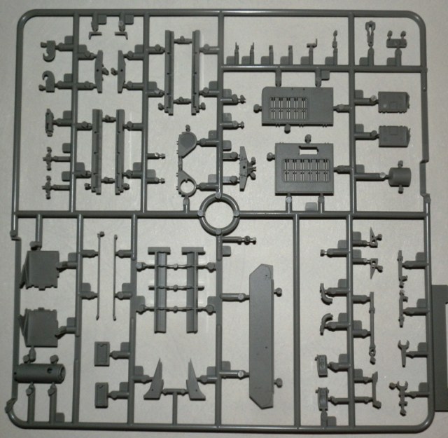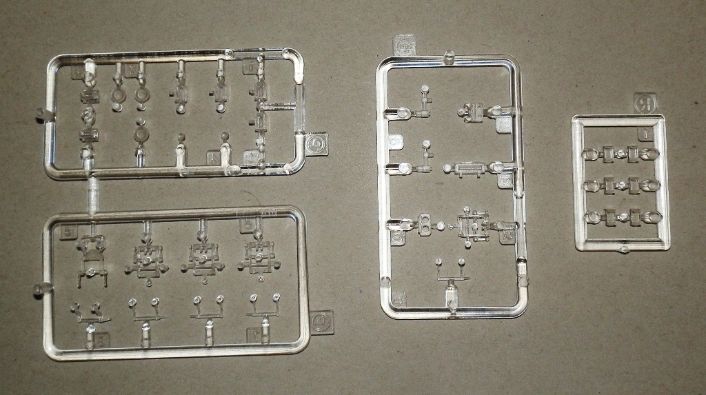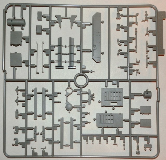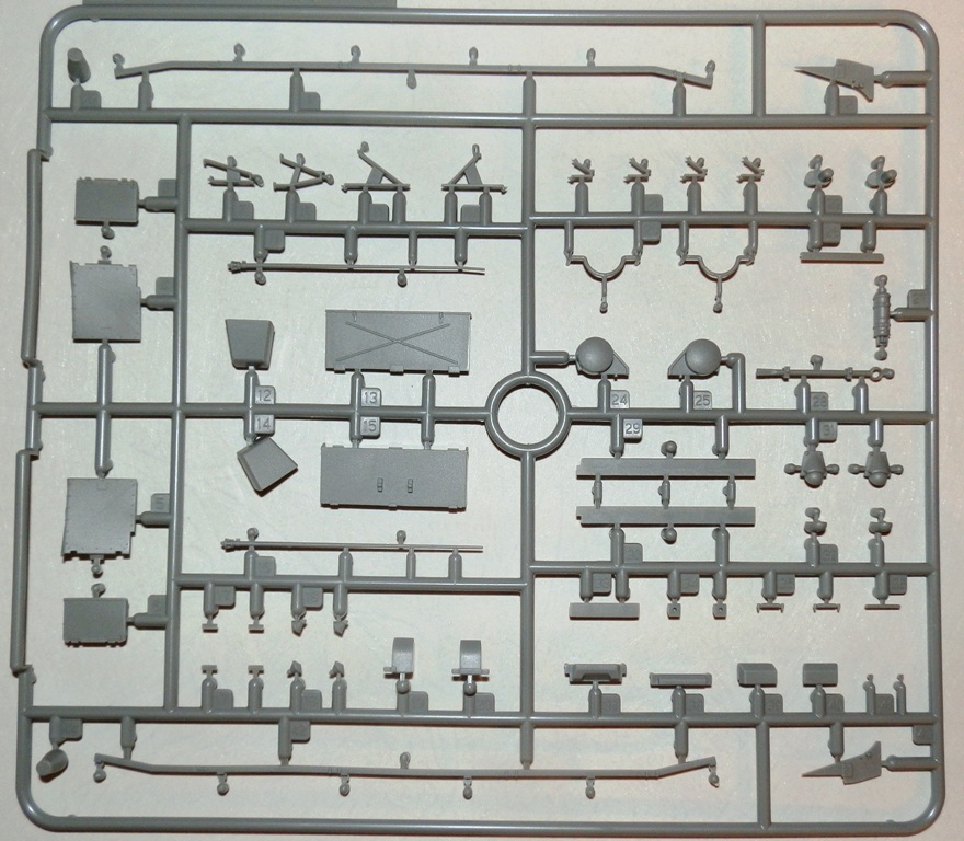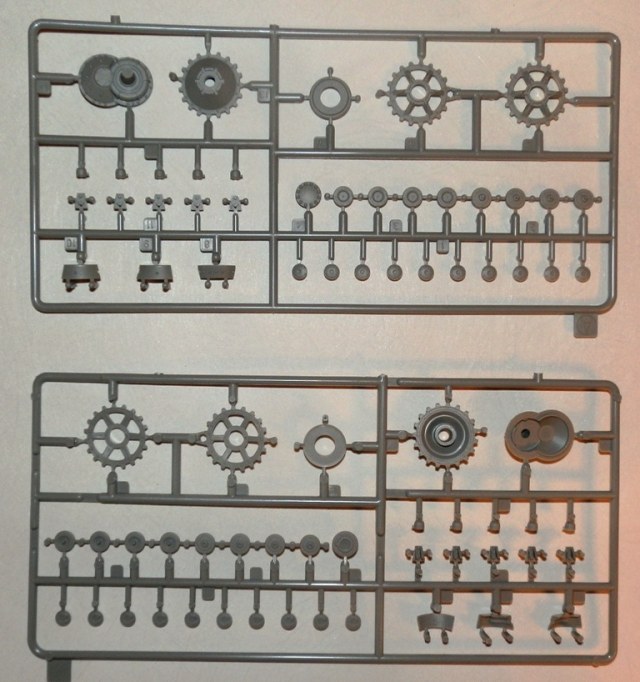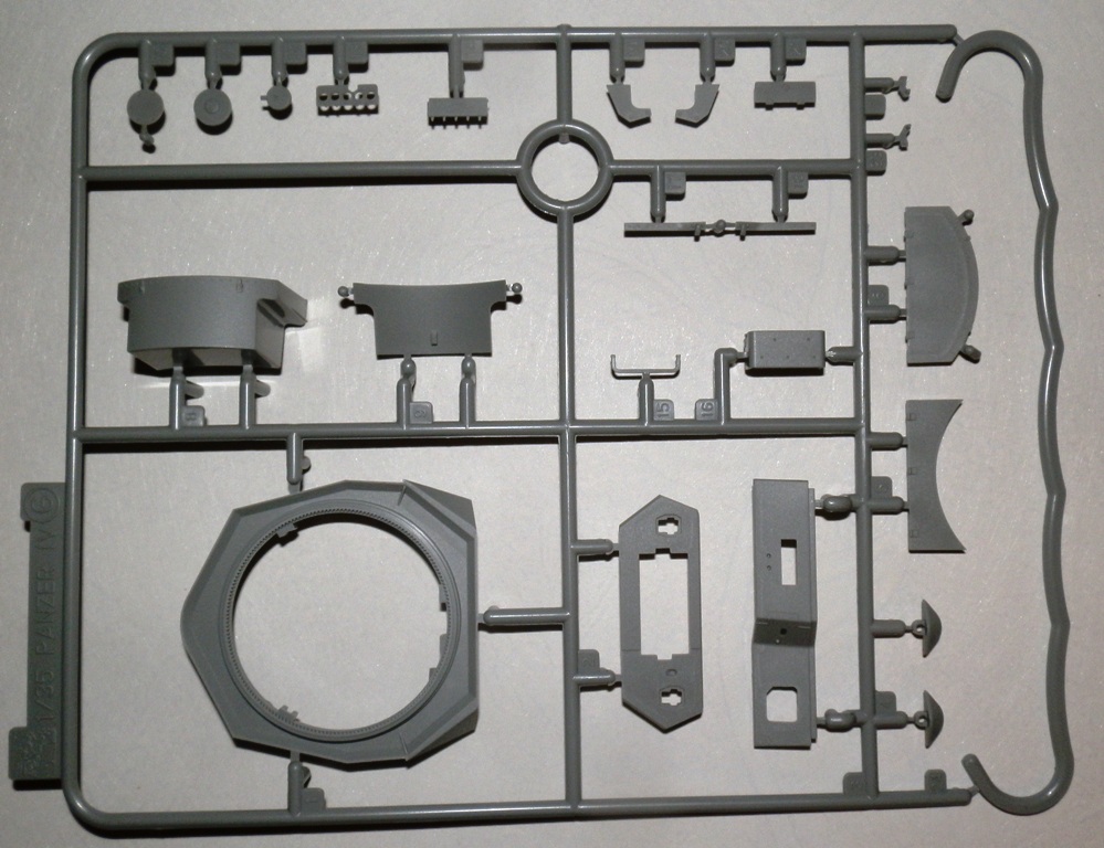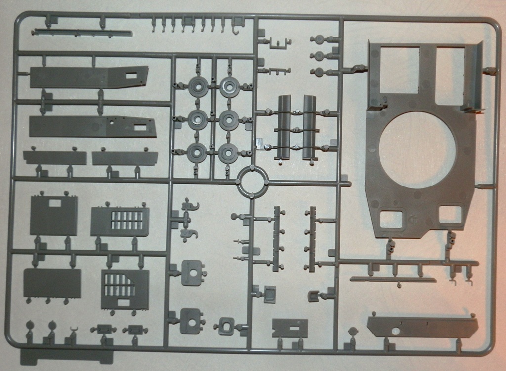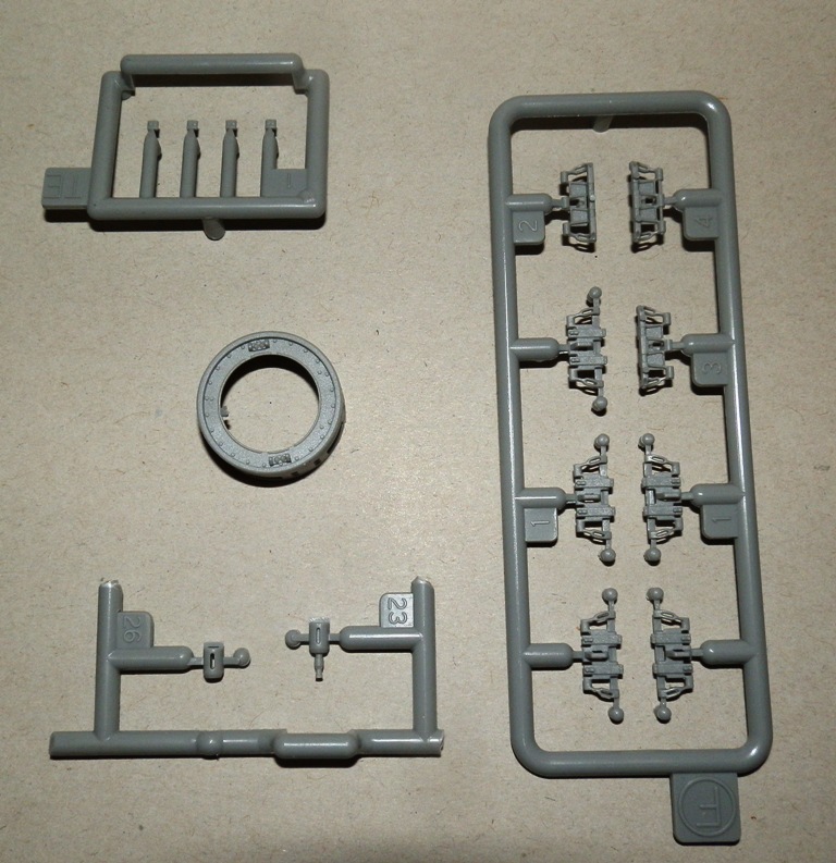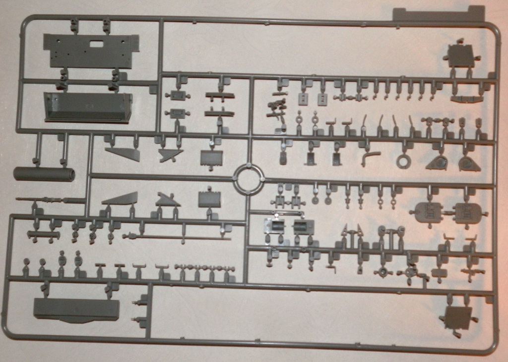 Качество литья весьма неплохое, облоя нет, сдвиги весьма незначительны. Ствол дается цельной деталью, ровный и без шва. Утяжин и следов толкателей на видимых местах не обнаружил. Как стыковка у набора покажет сборка, но по сборке аналогичных четверок(новых наборов), могу сказать что вполне. Единственно напрягает излишнее членение деталей, особенно подвески. Как уже упомянул, останется масса неиспользуемых деталей, причем детали весьма полезные для доработок четверок от звезды-тамии-академии. Есть лишняя маска пушки, короткий ствол, шанцевый инструмент, детали корпуса и много чего прочего.