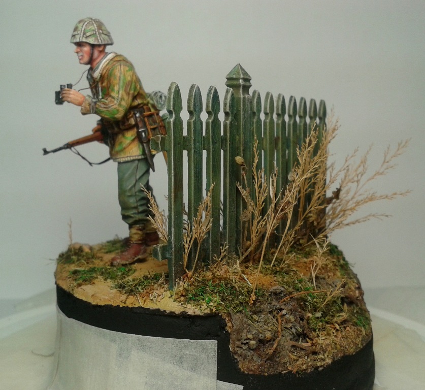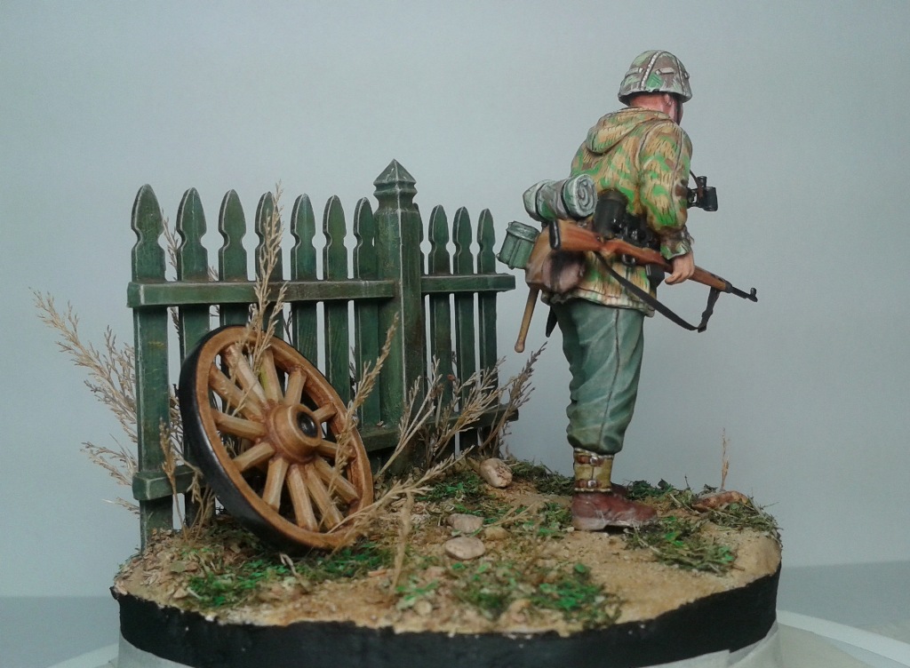 Ложа винтовки: основа акрил, высветление - темпера, фильтр - масло. Забор - по той-же самой системе. Высветляешь-затемняешь, высветляешь-затемняешь... Довольно все просто.