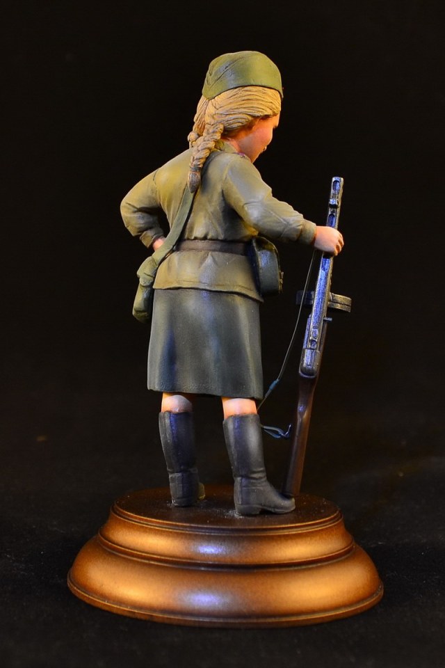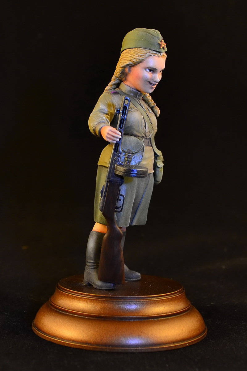 Масштаб заявлен как 1:12, но я так понимаю это по ППШ. Собиралась легко, шпаклевал совсем чуть-чуть. Из доделок - звезда на пилотке и ремень к автомату. Расписывал акрилом и маслом. Легкий блеск проявился от яркого освещения при фотографировании, в обычных условиях не наблюдается.