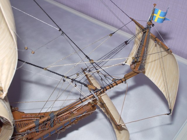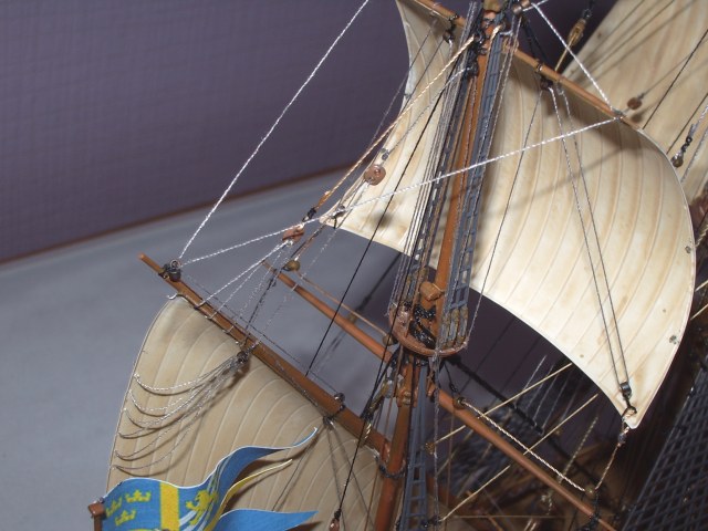 Есть и отсебятина - чтобы избежать изгиба стеньг и брамстеньг от натяжения штагов установил фордуны. Попытался изобразить полусобранный грот.
