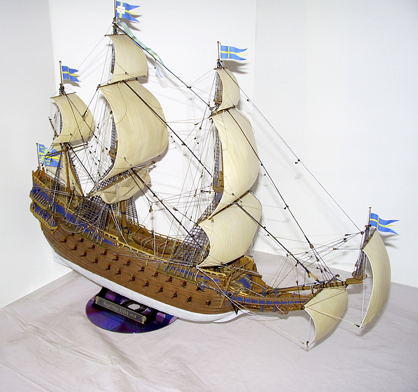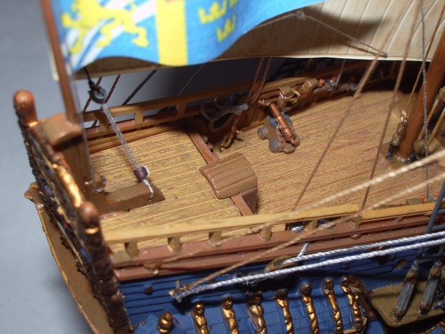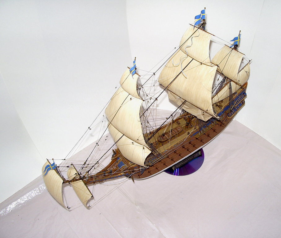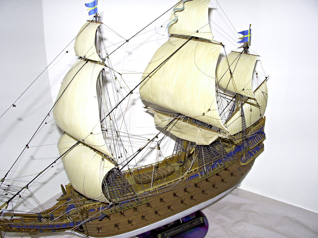 Корпус и рангоут собирал "из коробки". Ориентируясь на модель 1:10 из музея закрыл несколько пушечных портов, прорезал люк под трап за фок мачтой и люк за грот мачтой для талей фала грот рея (пришлось вклеить кусок орудийной палубы и кнехт). Красил по картинкам книги Ландстрема ( BjornLandstrom "TheRoyalWarshipVASA"). Краски - эмалевые и акриловые от Revell. Ванты и паруса (за исключением грота) использовал из набора, пластиковые (избалован Ревелловскими моделями и от перспективы устанавливать юферсы и вязать выбленки прихожу в полнейшее уныние). Инструкция к набору в части такелажа полная лажа. Такелаж старался тянуть используя книгу Ландстрема, чертежи, выложенные Петром (dinozavr) - http://serikoffshipmodels.com/forum/18-128-1 и тщательно разглядывая фотографии модели 1:10 из музея Вазы. Без упрощений, конечно, не обошлось, но старался приблизиться.