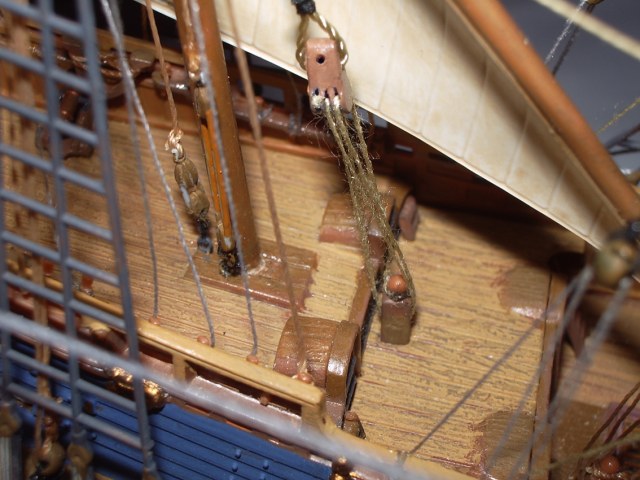 Теперь вантпутенсы видны, правда они какие-то неестественные у производителя. Серый цвет вант, вантпутенсов. ватервулинга и якоря несколько смущает. Но должен сказать, что окрашено все очень аккуратно. Палубу похоже Вы тонировали. Заинтересовали блоки - из набора или самодел? Хорошо выглядит