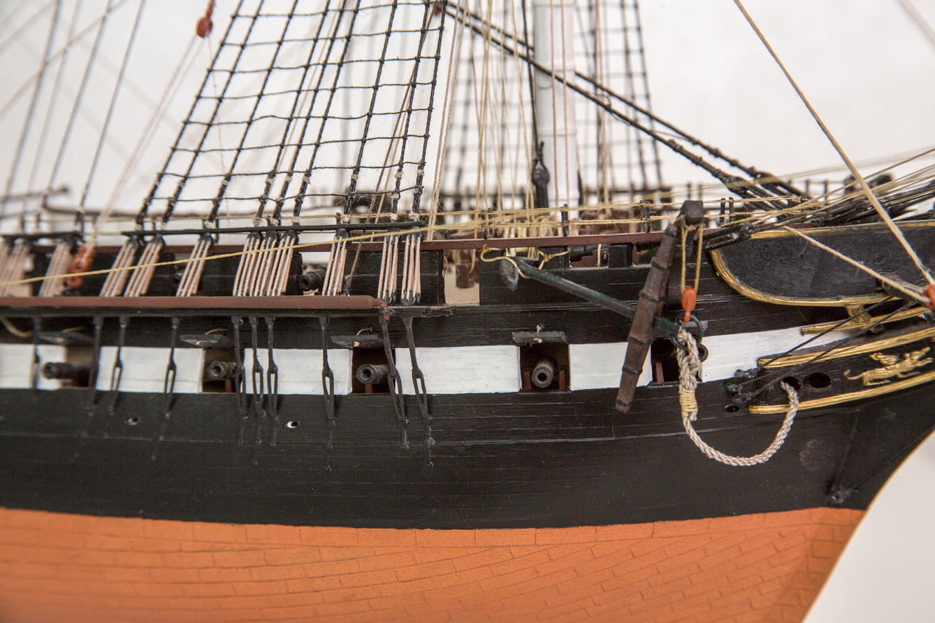По такелажу тоже много отличий, например проводка фалов, кливера вешаются по-другому, угол развала между мартин-гиками на оригинале гораздо меньше, ватер-вулинг протянут по-другому, лисель спирты крепятся не так, кофель-нагельные планки совершенно другие и еще десятки подобных косяков...