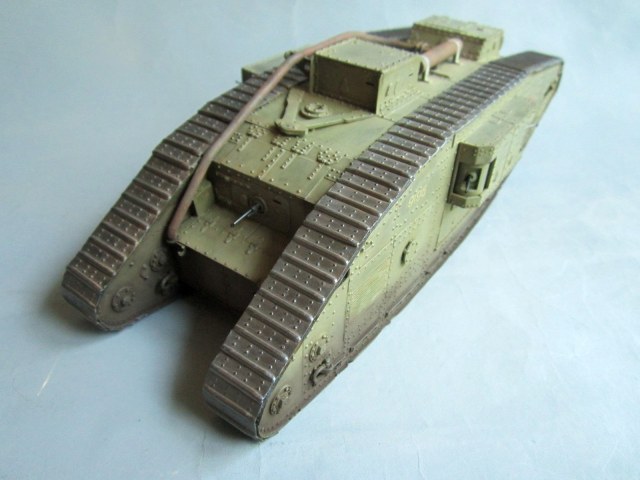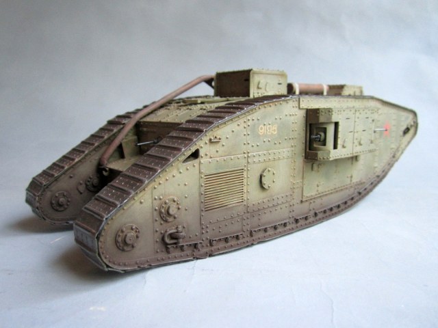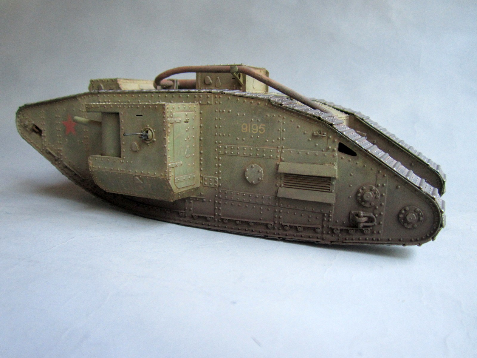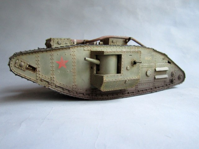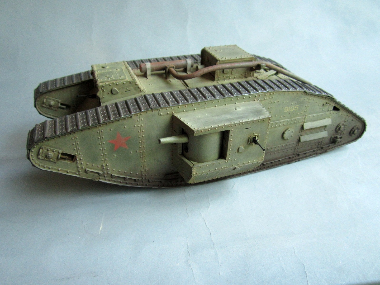 Наблюдая за шествием "ромбов" по "Каропке", решил реанимировать свою старую модель Mark V фирмы Interus. Модель собрана лет 10 назад. Собиралась "из коробки". За время своей жизни модель утратила некоторые детали и "актуальность" внешнего вида. Восстановил утраченные детали, изготовил стволы пулеметов из прокаленной над свечей трубки, что придало им "природный" цвет, подправил выхлопную. Основной упор сделал на тонировку. Перекрашивать модель не стал. Задул матовым лаком, приварил декали, сделал смывку и проработал пигментами. Использовал "пудру" Tamiya и пигменты "Хома". Маркировку выбрал самую простую: "Красная армия, Кавказский фронт, 1920г.", - так как боялся, что другие деки (типа надписей) могут "некорректно" приварится ввиду их старости.