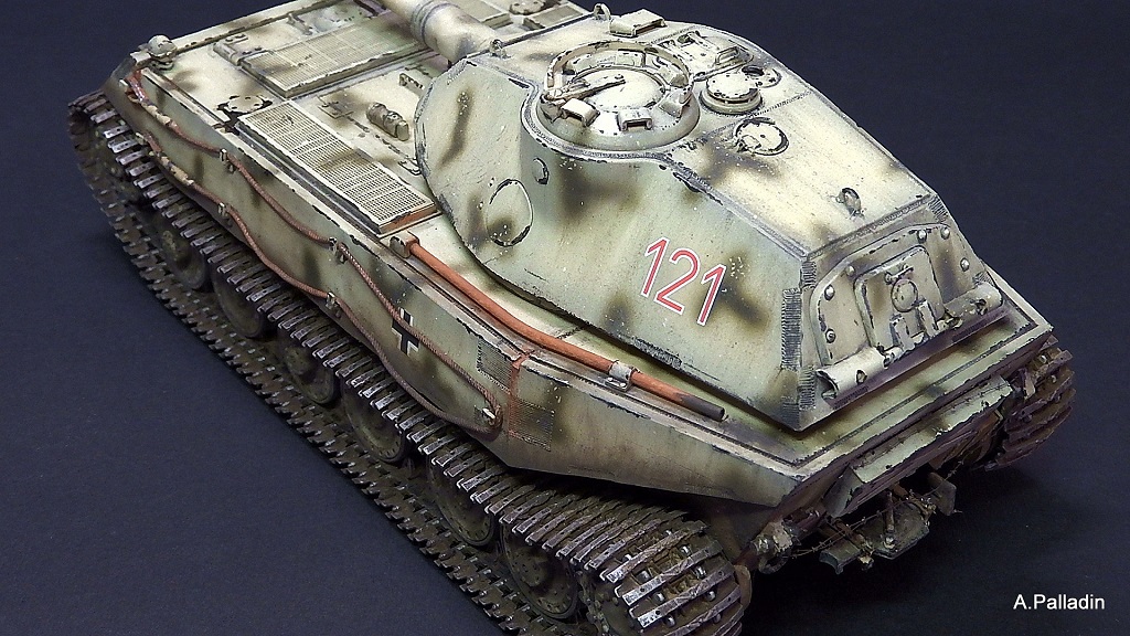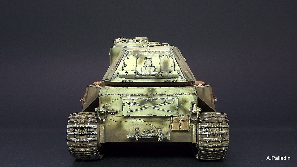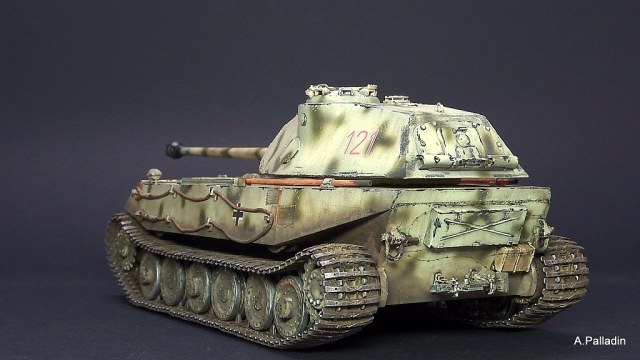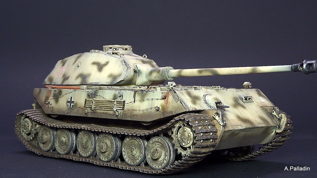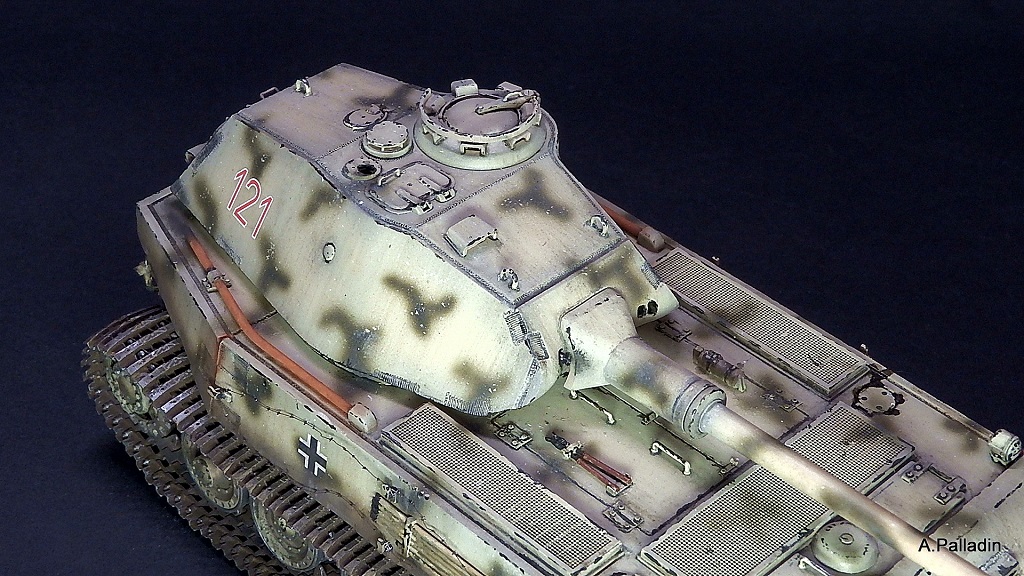 Выхлоп вызывает сомнения, хотя это чистый субъектив: если уж следовать логике Порше, то он внизу, за катками, как у элефанта/фердинанда, эти трубы сверху - имхо, не уместны и не логичны. Хотя я не знаю как было на прототипе. Я б убрал.