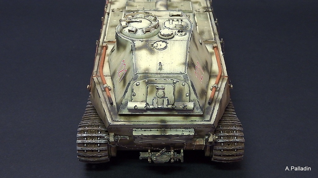 Что касаемо ходовой пояснил чуть выше. Выхлоп не стал переделывать, хотя мысль была, но терялась некоторая целостность модели. Я в описании указывал на нелогичность некоторых элементов. К ним и стык на корме относится. Надгусеничных полок в наборе нет вообще. Траки остались, но так и не определился с местом "куданацепить". Единственное место более менее на корме, но получалось нагромождение.